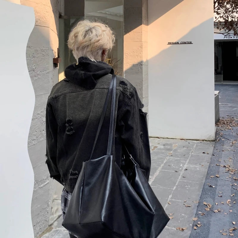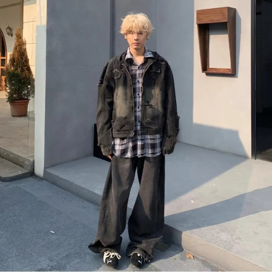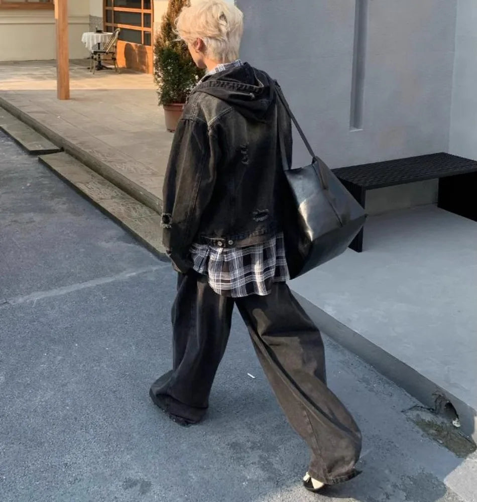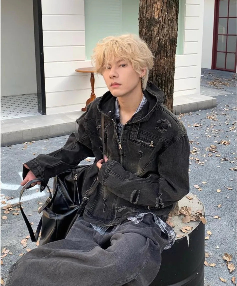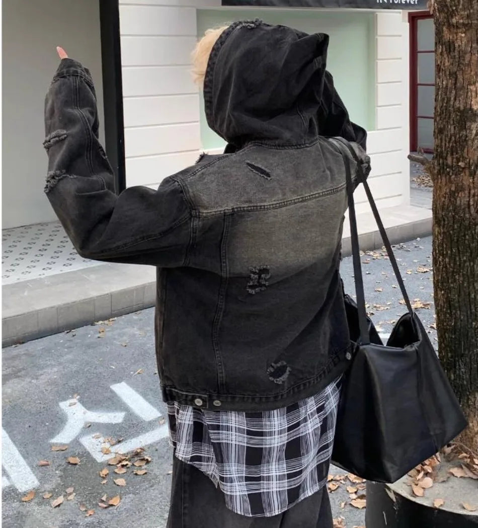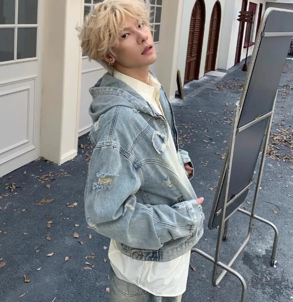 New Hooded Mens Denim Jacket 2024 American Retro High Street Loose Couple Tops Hip Hop Streetwear Trendy Washed Cowboy Coats