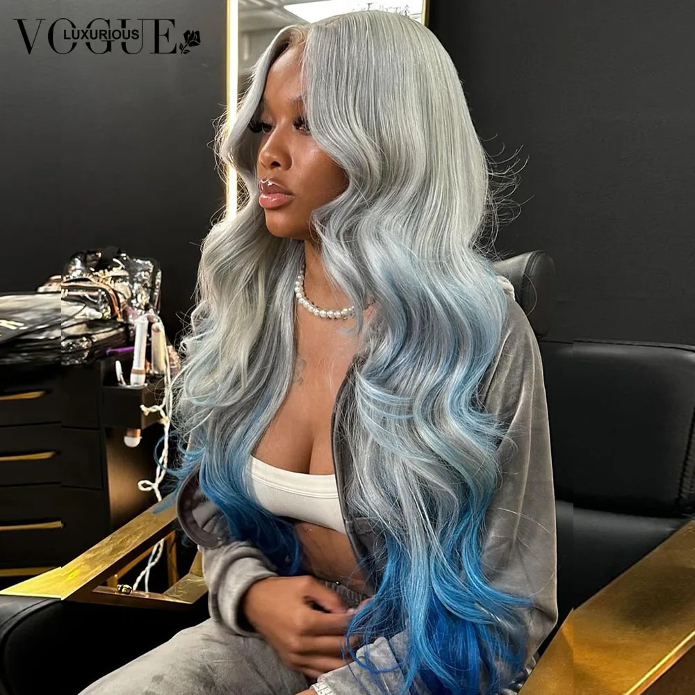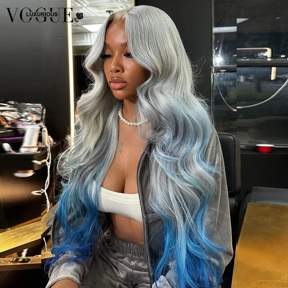 Omber Grey Blue Body Wave 100% Real Human Hair Wig 200% Density Pre Cut Remy Wigs Salon Hair Coloring Wig 13x6 Lace Front Wigs