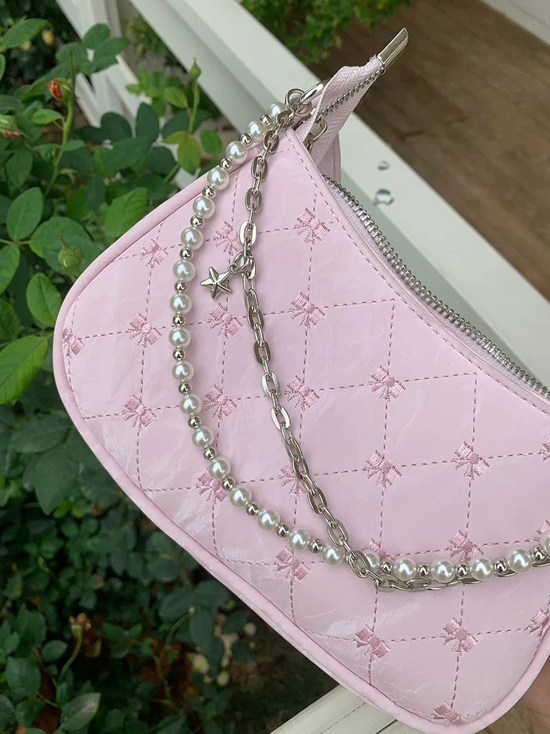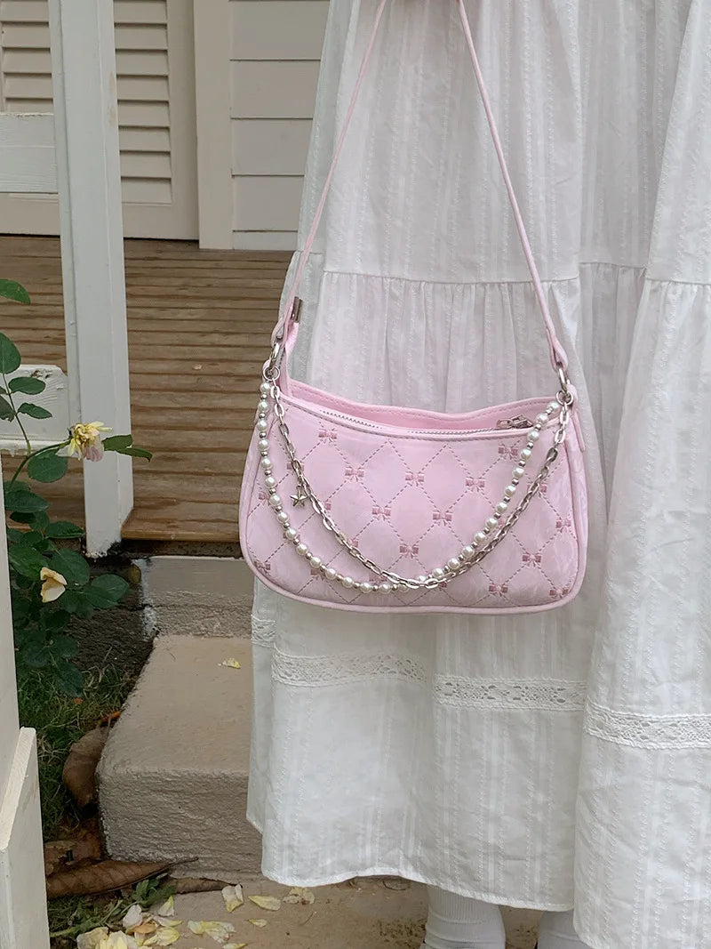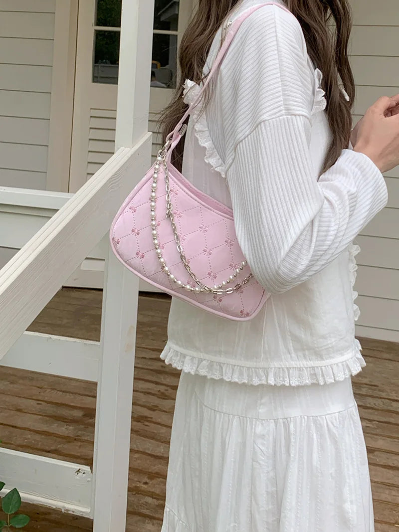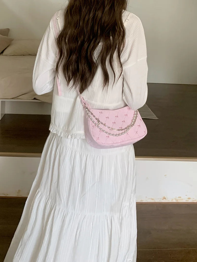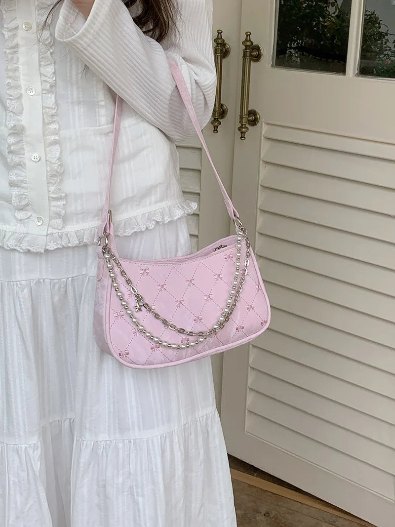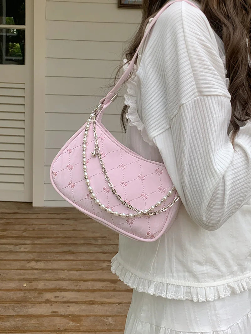 Pink Shoulder Bag Elegant Cute Bow Pearl Chains Bow Embroidery Handbag Casual Leather Korean Fashion Female Handbag