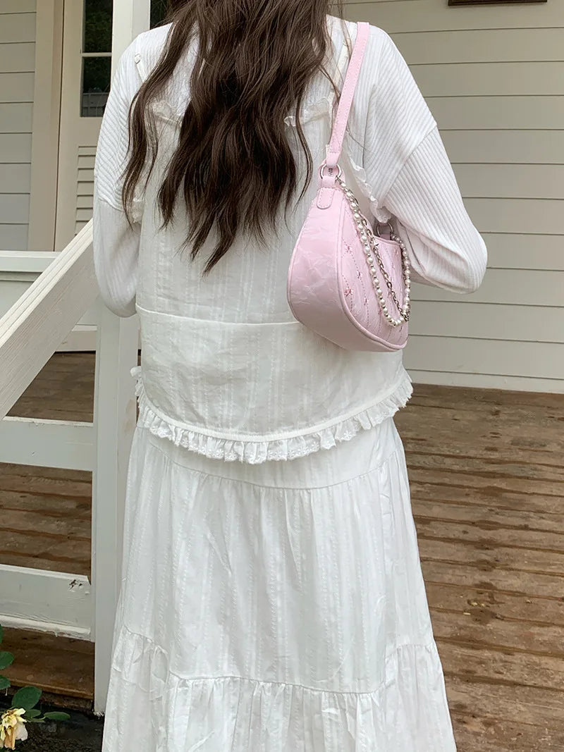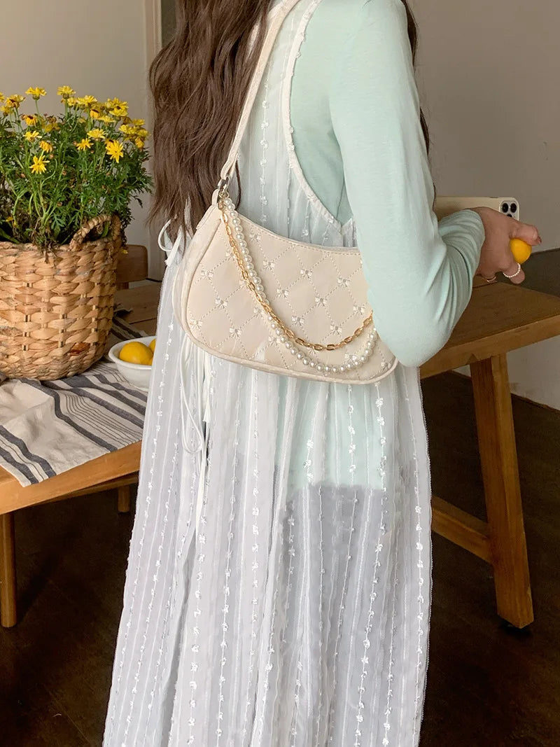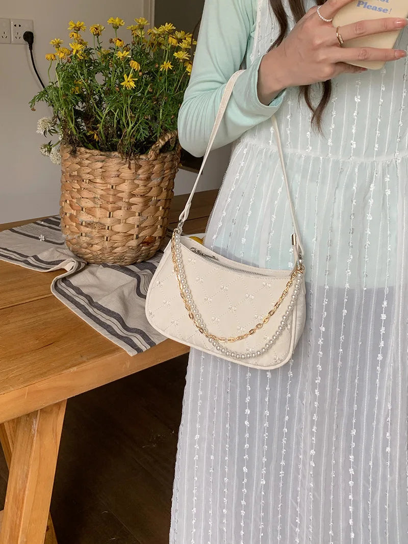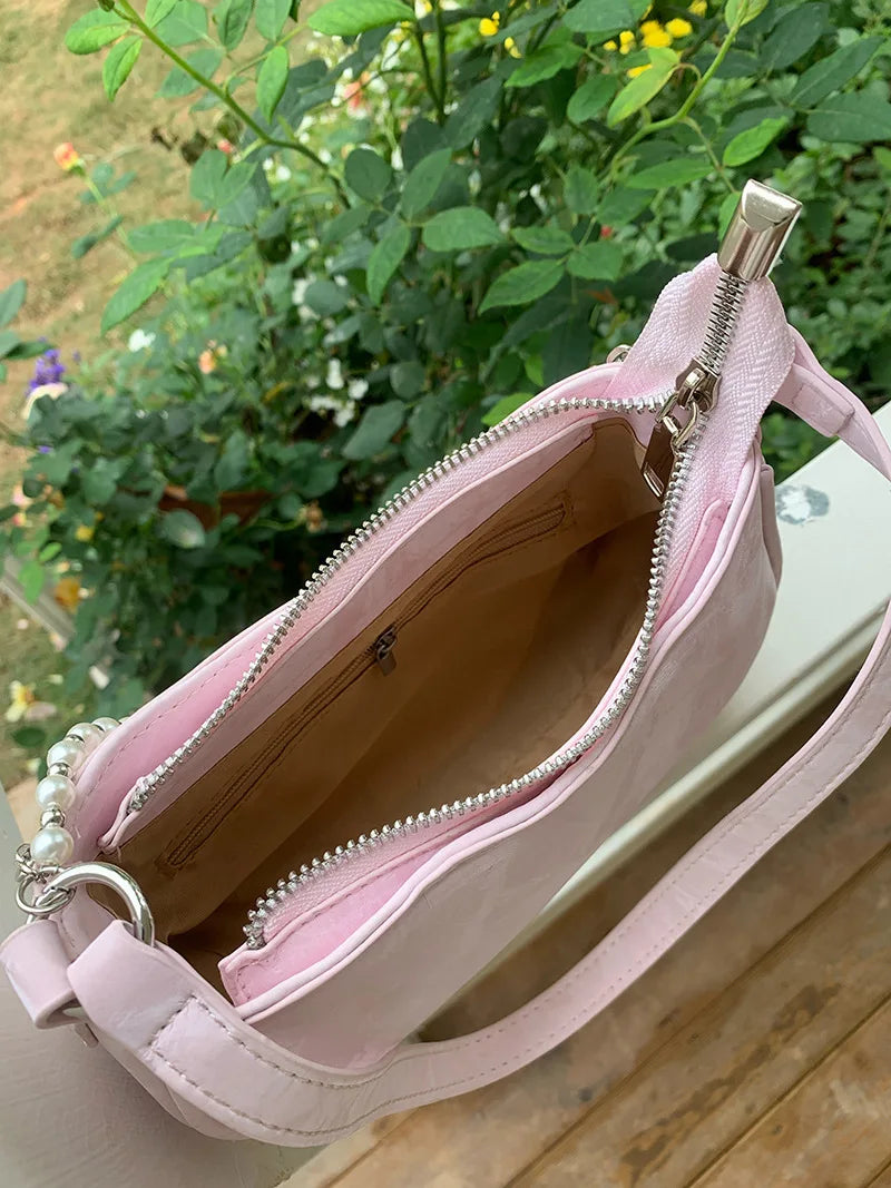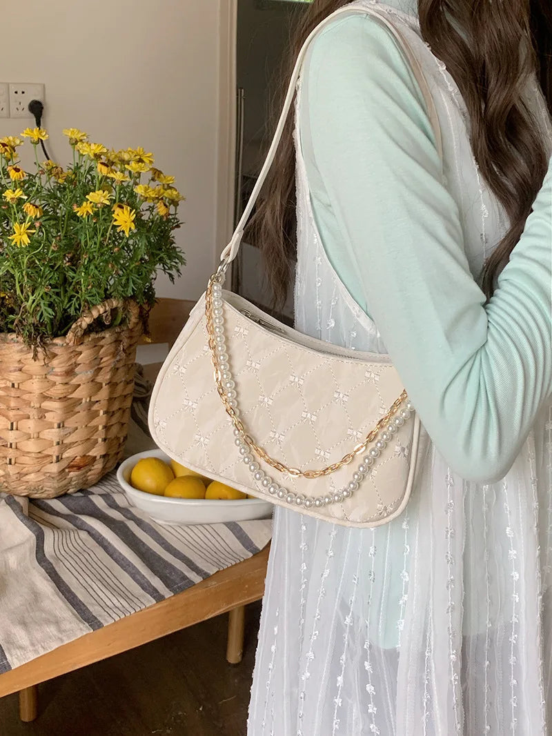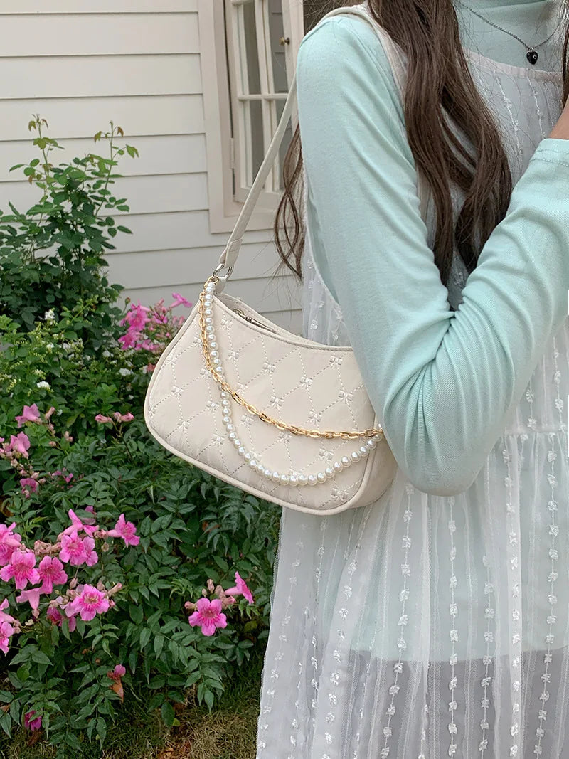 Pink Shoulder Bag Elegant Cute Bow Pearl Chains Bow Embroidery Handbag Casual Leather Korean Fashion Female Handbag