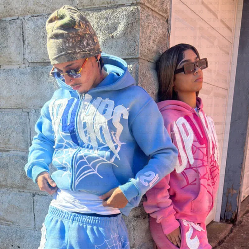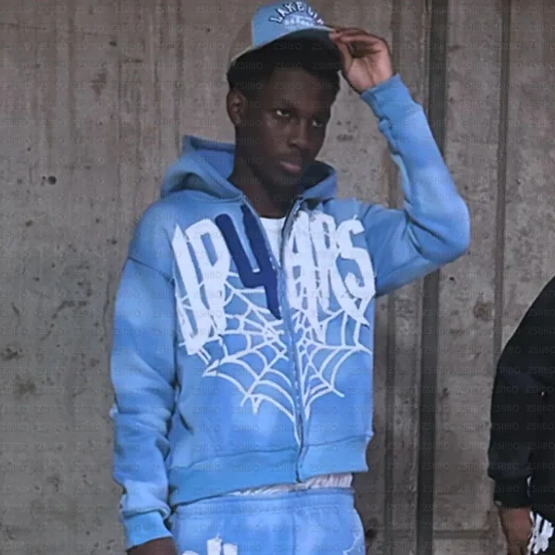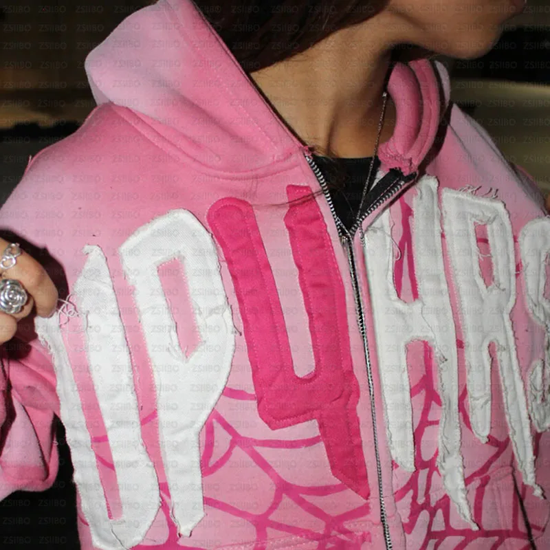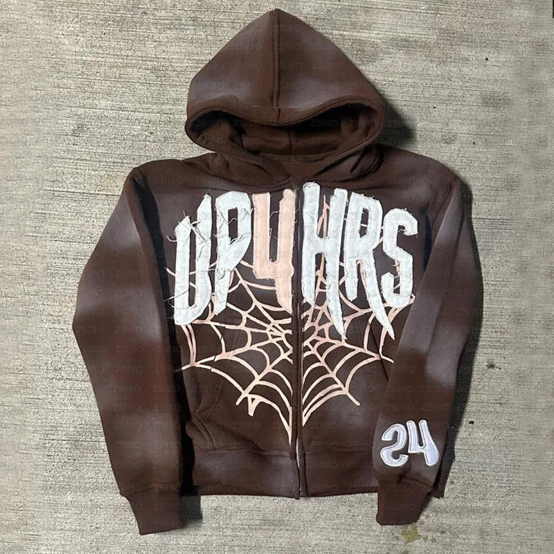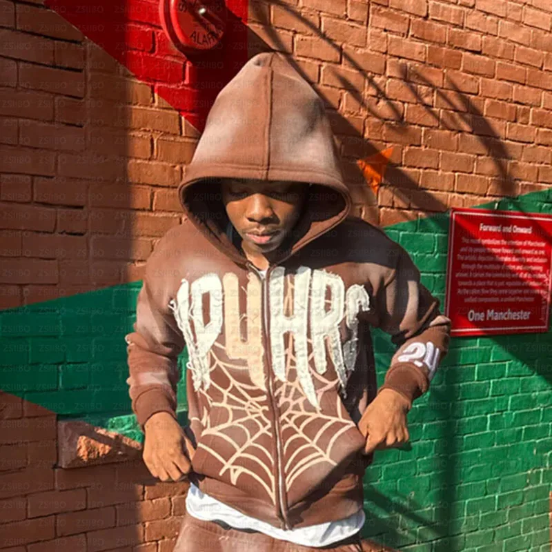 Retro Patch Spider Web Print Zipper Hoodie Y2K Sweatshirt Mens Hip Hop Letter Oversized Hoodie Jacket Clothes Streetwear Jacket