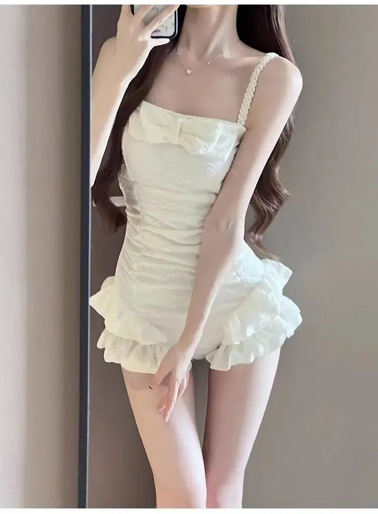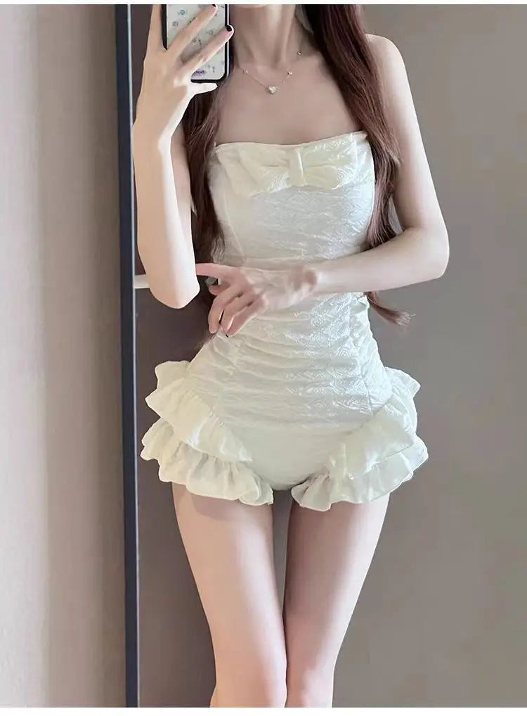 sexy Korean fashion conservative bow swimsuit one piece beige ruffles pearl strapless bodysuits bikinis cute beach outfits