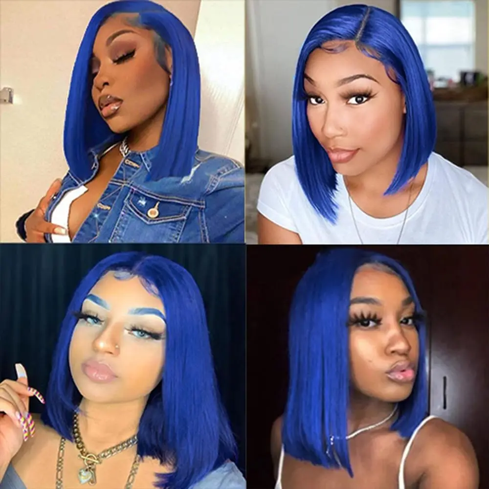 Short Bob Blue Colored 13X4 Lace Part Transparent Lace Peruvian Virgin Hair Wig For Women 100% Human Wig Straight Wig For Women