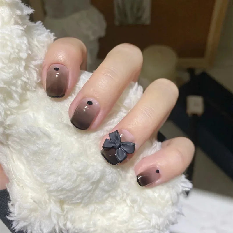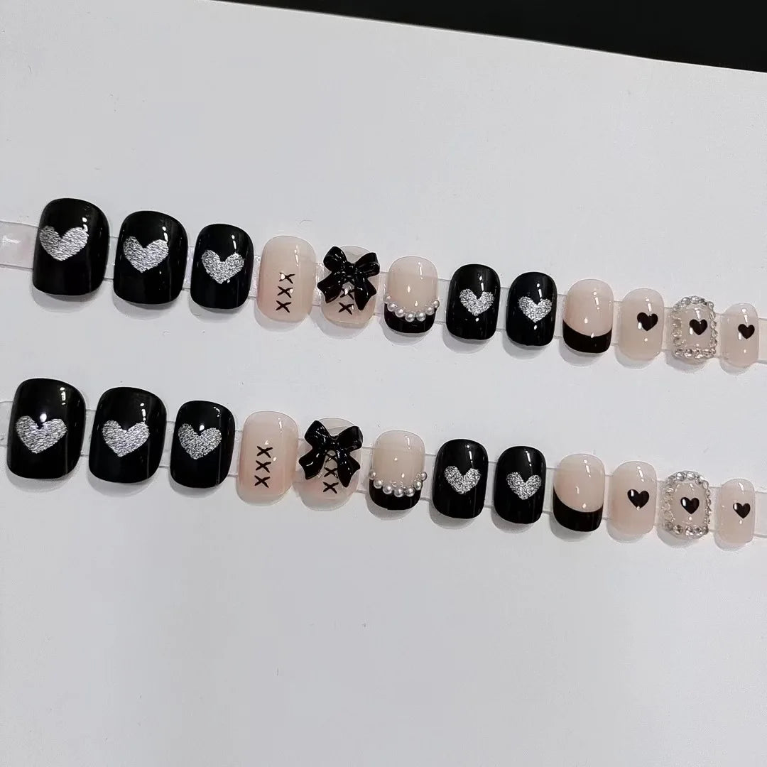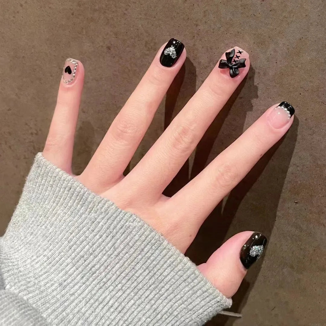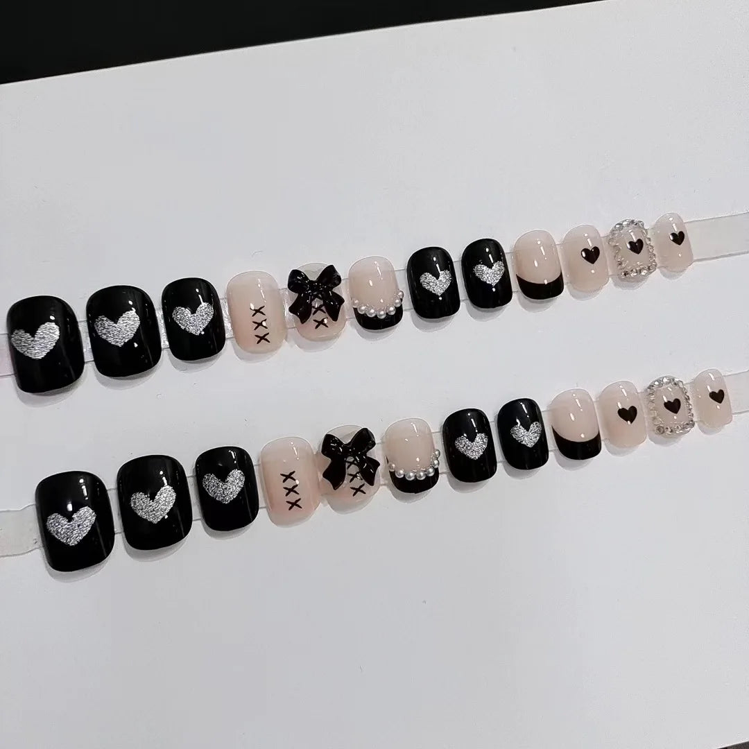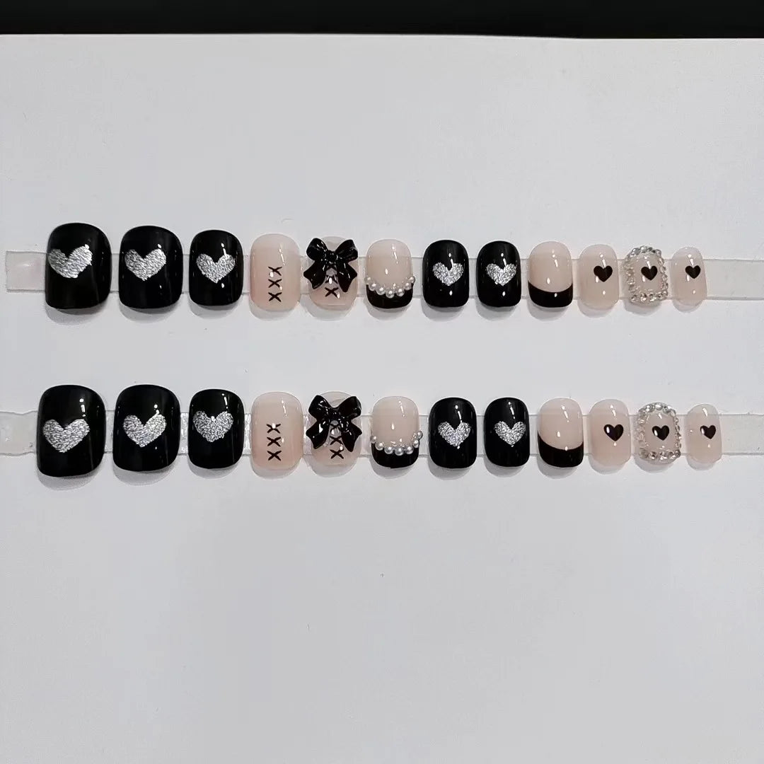 Short French Fake Nails Black Bow Design Press on Nail Tips with Glitter Love Heart Pattern Artificial Nail Tips for Girls 24pcs