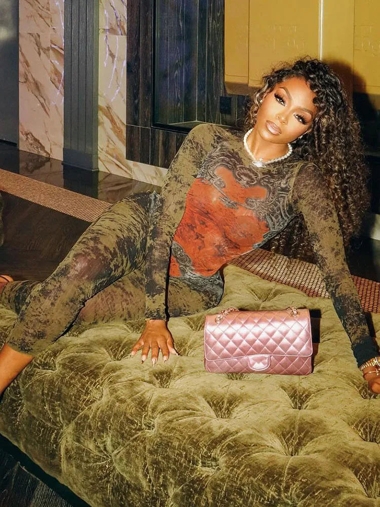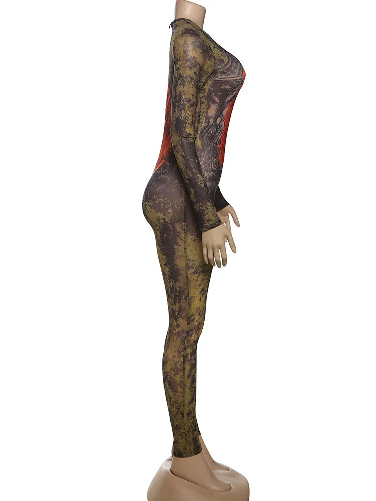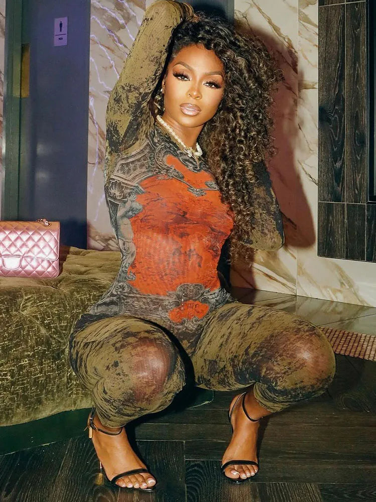 Sisterlinda Printing Slim O-Neck Long Sleeve Jumpsuit Women Sexy Popular Body-shaping Vestidos Girl Party Leisure Pencil Pants