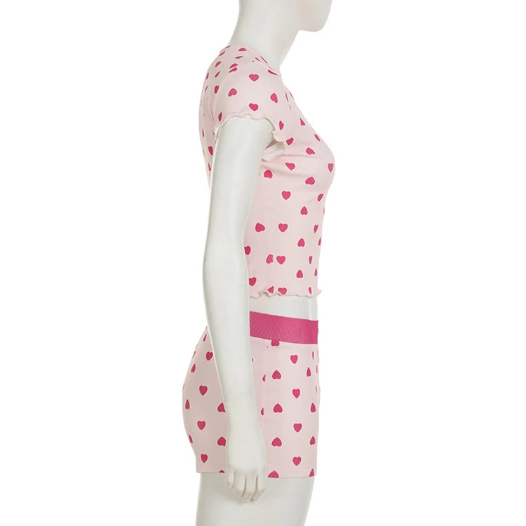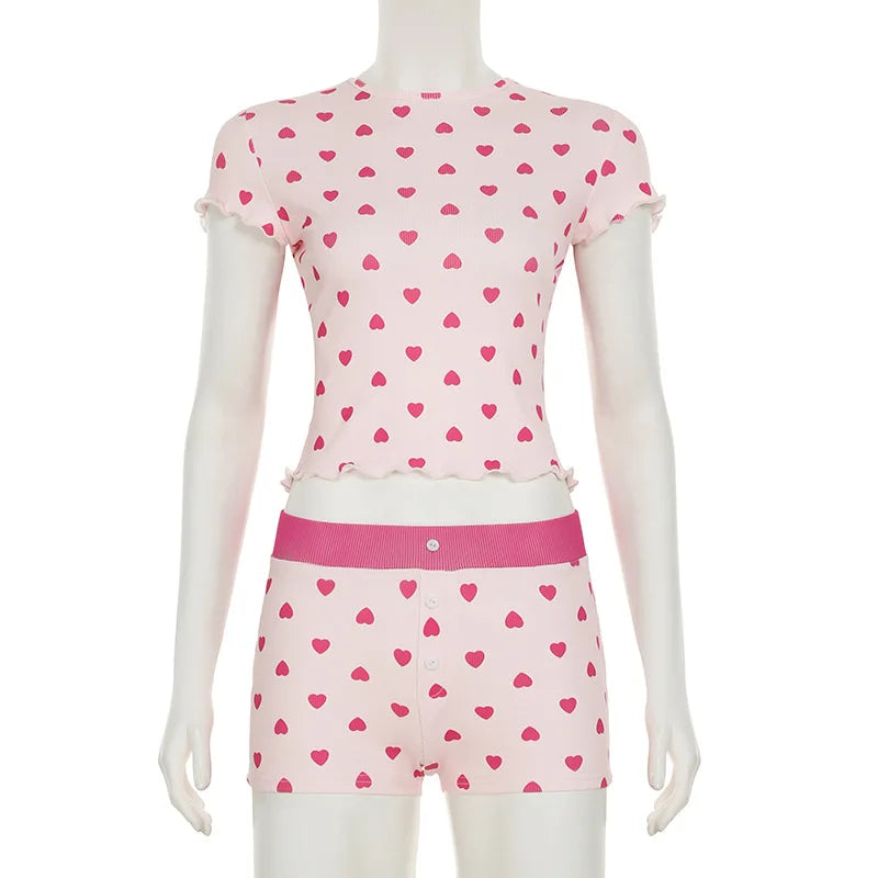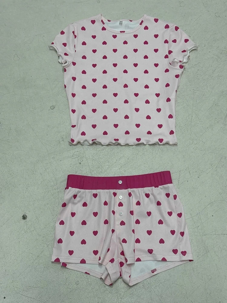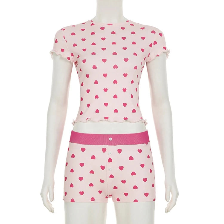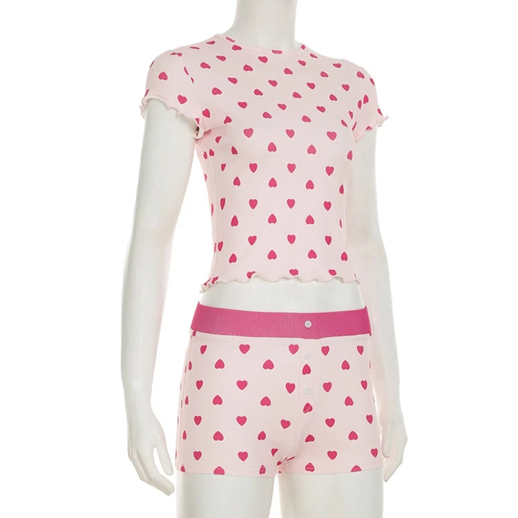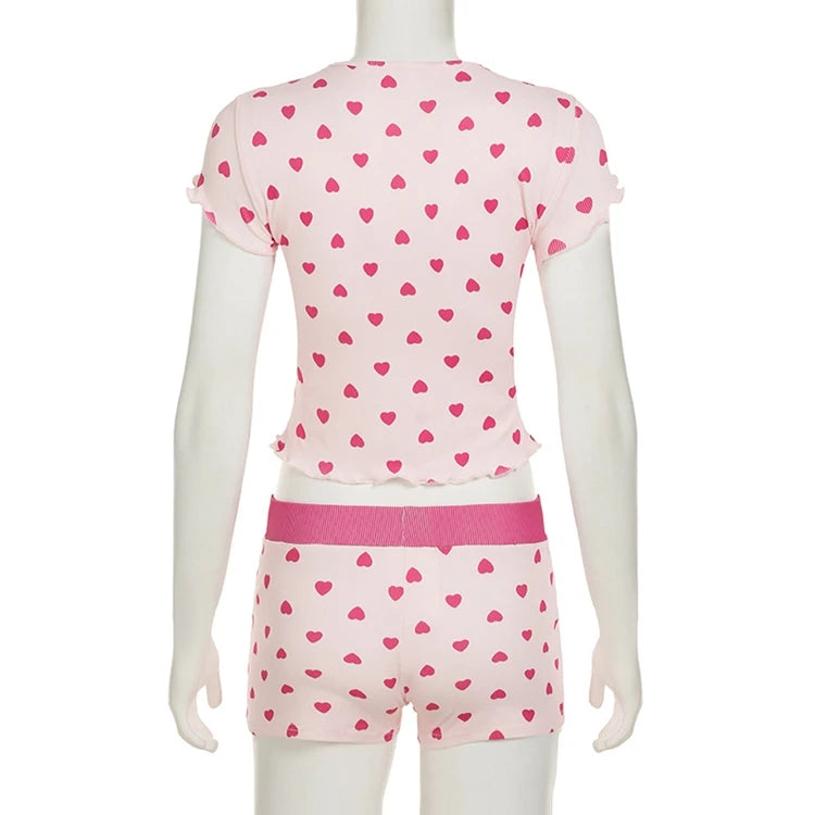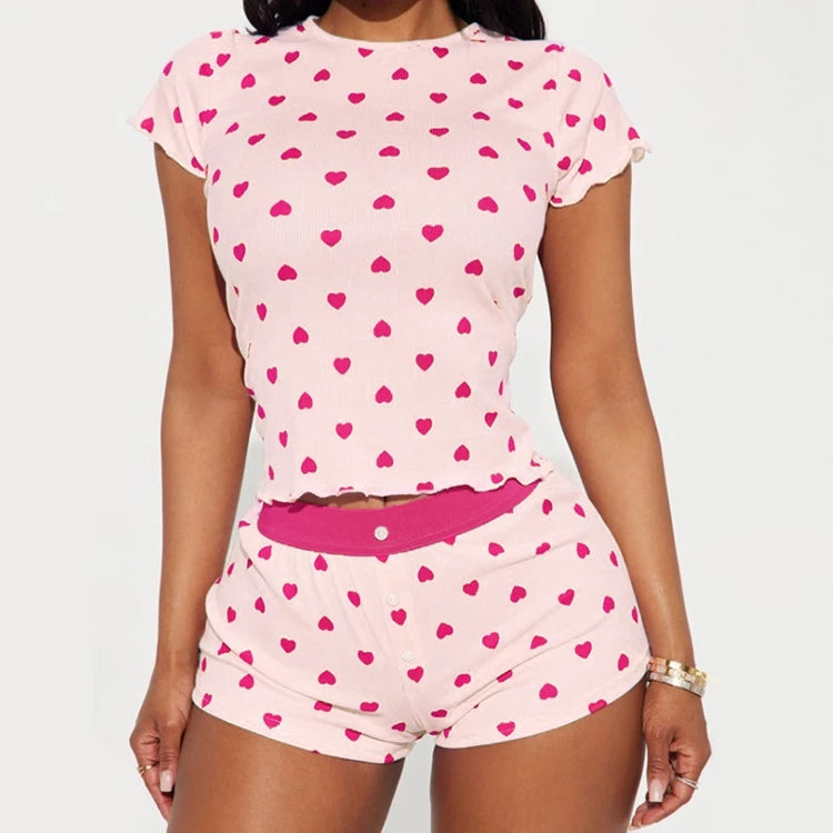 STYLISH LADY Heart Printed 2 Piece Set Women Short Sleeve Crop Top and Shorts Suits 2025 Summer Valentine's Day Home Sleepwear