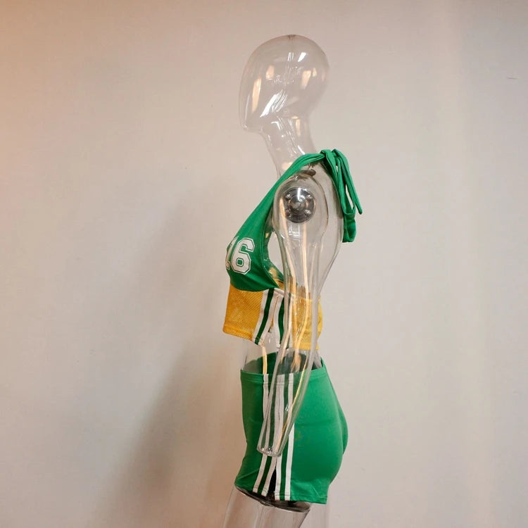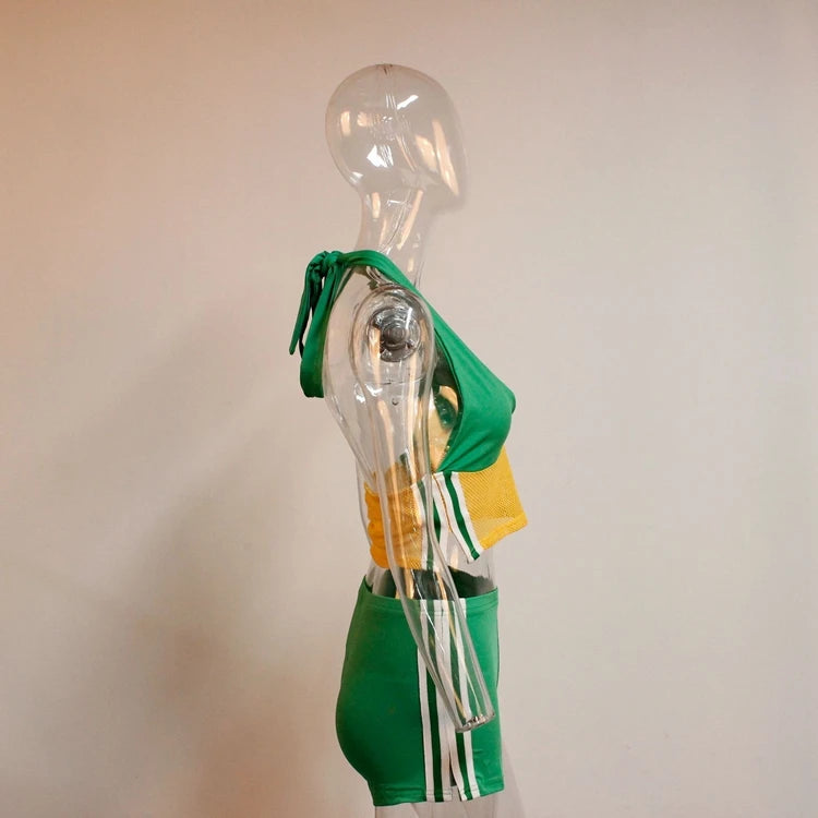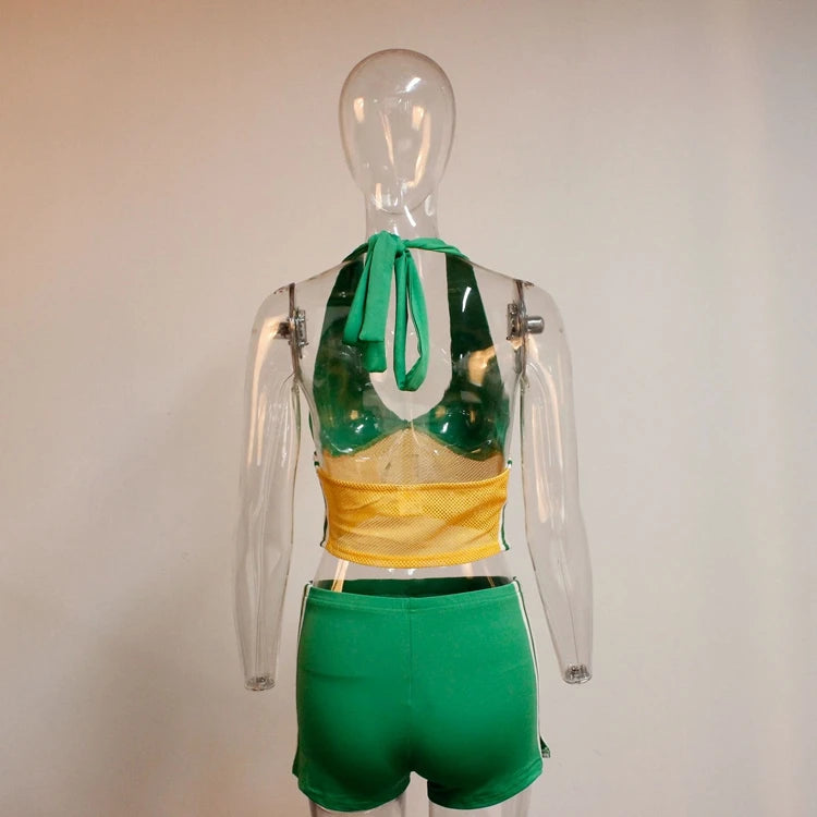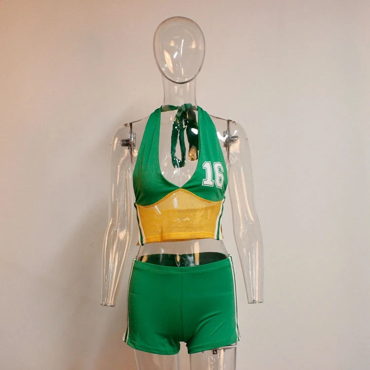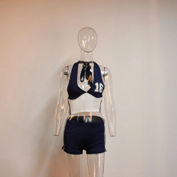 STYLISH LADY Letter Printed Mesh 2 Piece Set Women Halter Backless Crop Top and Shorts Suits 2025 Summer Sexy Club Party Outfits