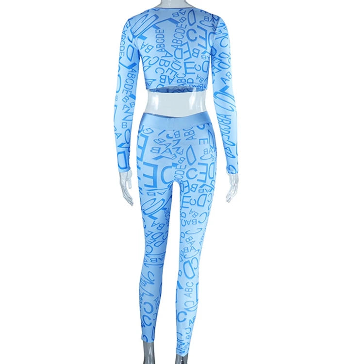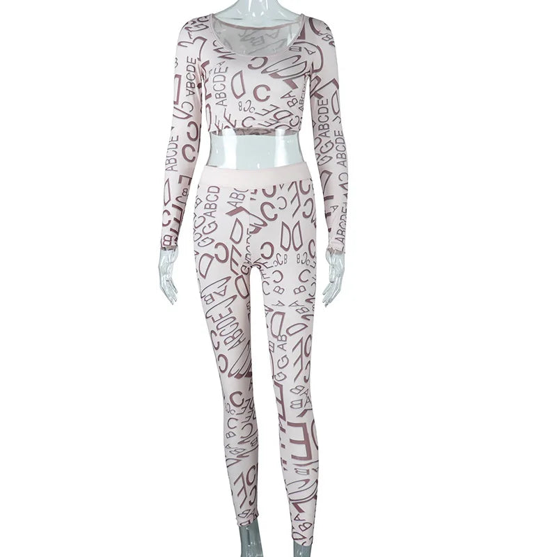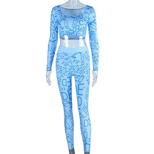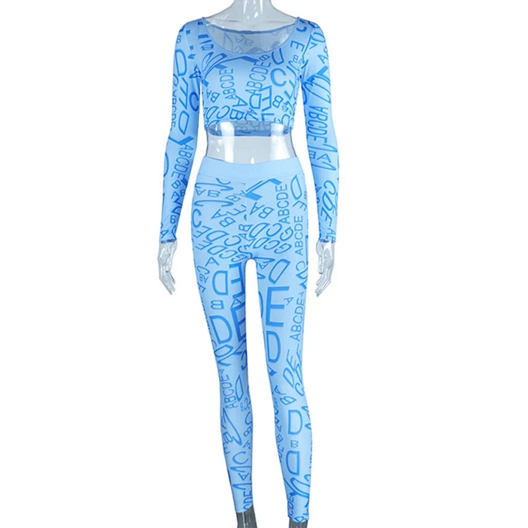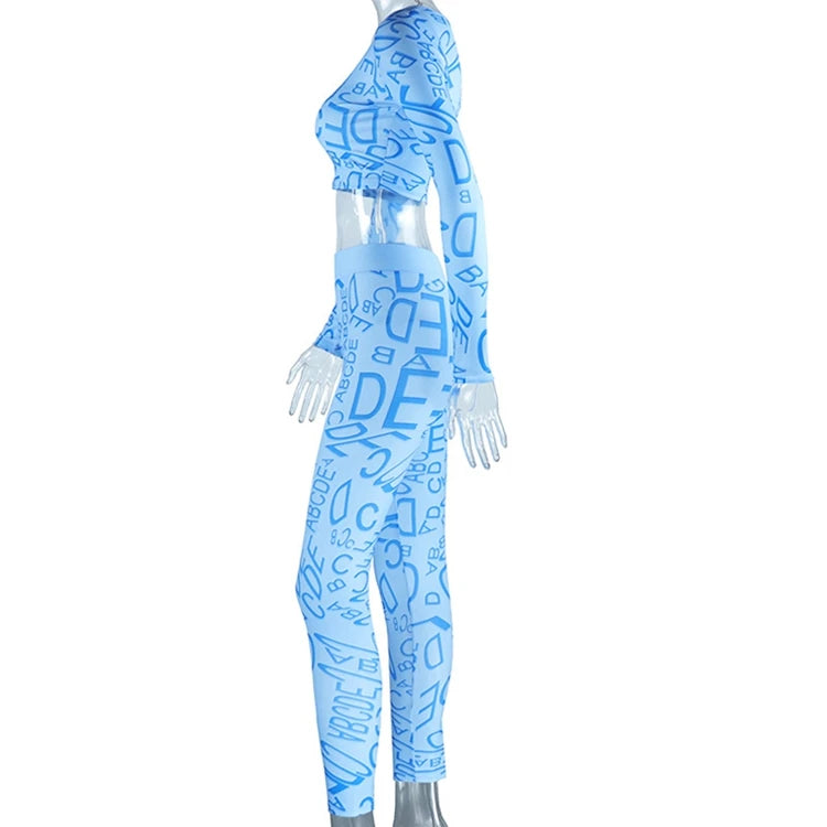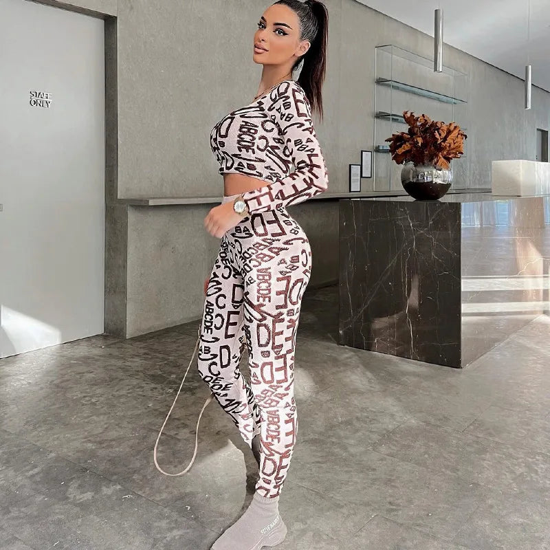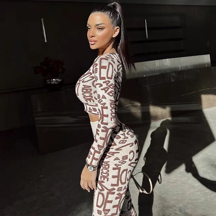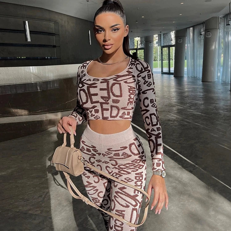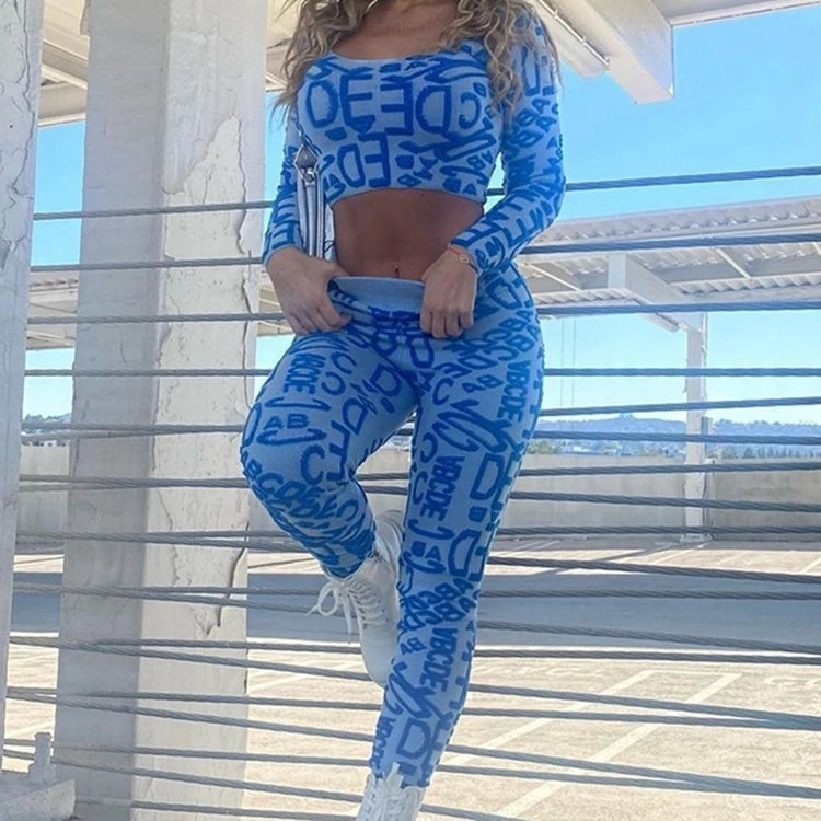 STYLISH LADY Letter Printed Sporty 2 Piece Set Women Long Sleeve Crop Top and Skinny Pant Suits 2025 Summer Sexy Street Outfits
