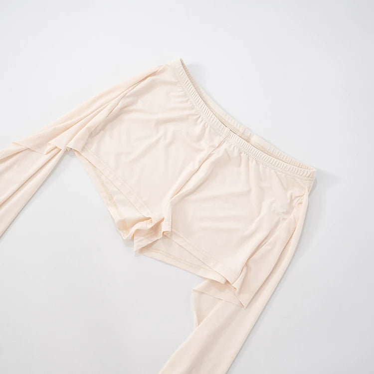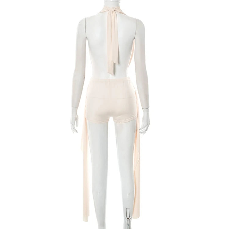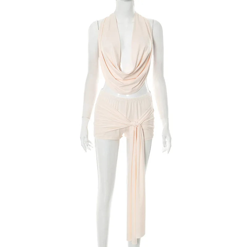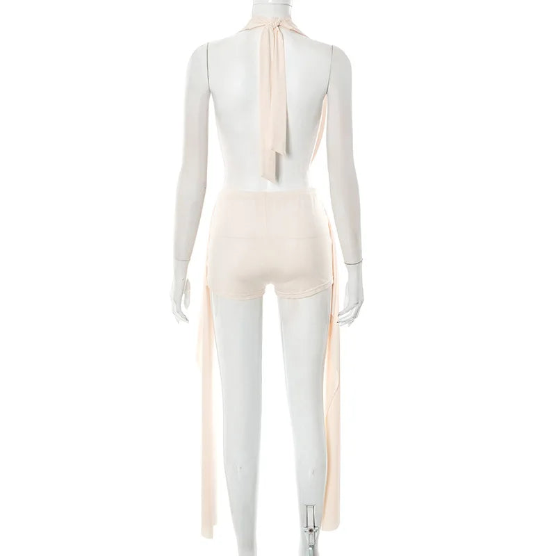STYLISH LADY Nude Ribbon 2 Piece Set Women Halter Backless Crop Top and Shorts Suits 2025 Summer Sexy Club Hollow Out Outfits