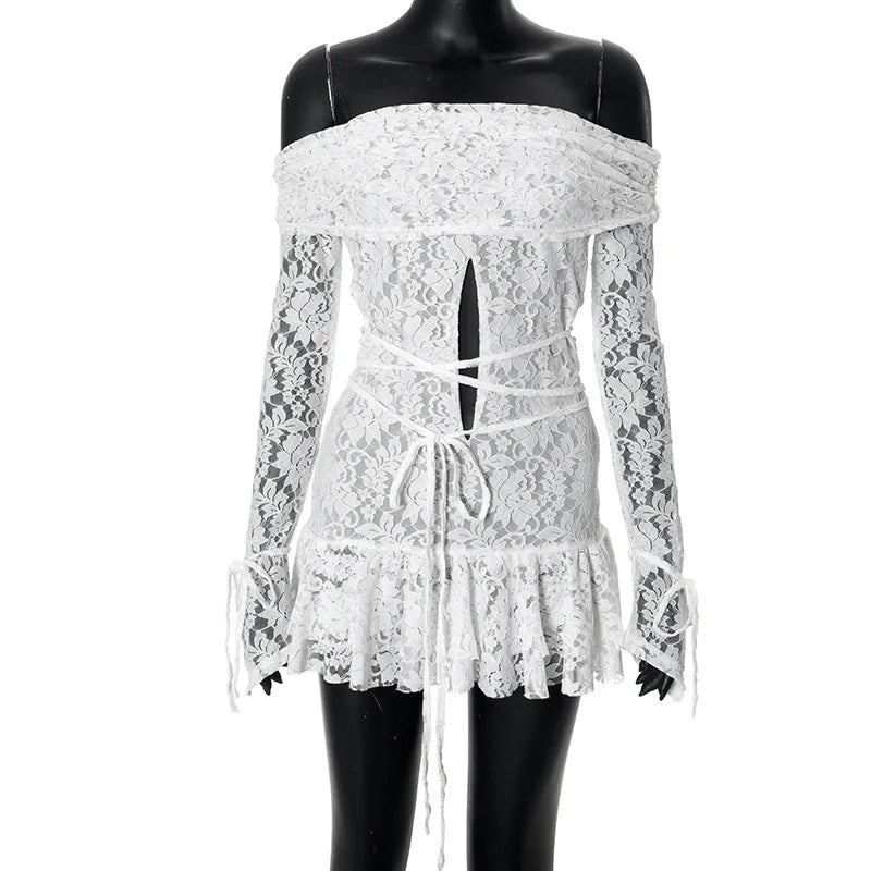 STYLISH LADY Off the Shoulder White Lace Dress 2025 Spring Women Long Sleeve Slash Neck Cut Out Bodycon Ruffle Mini Dresses