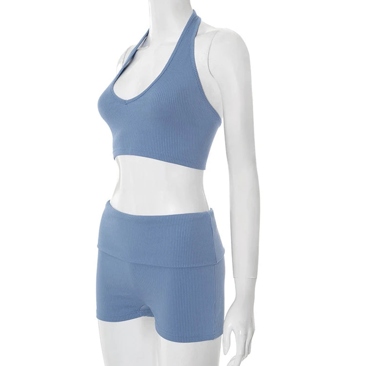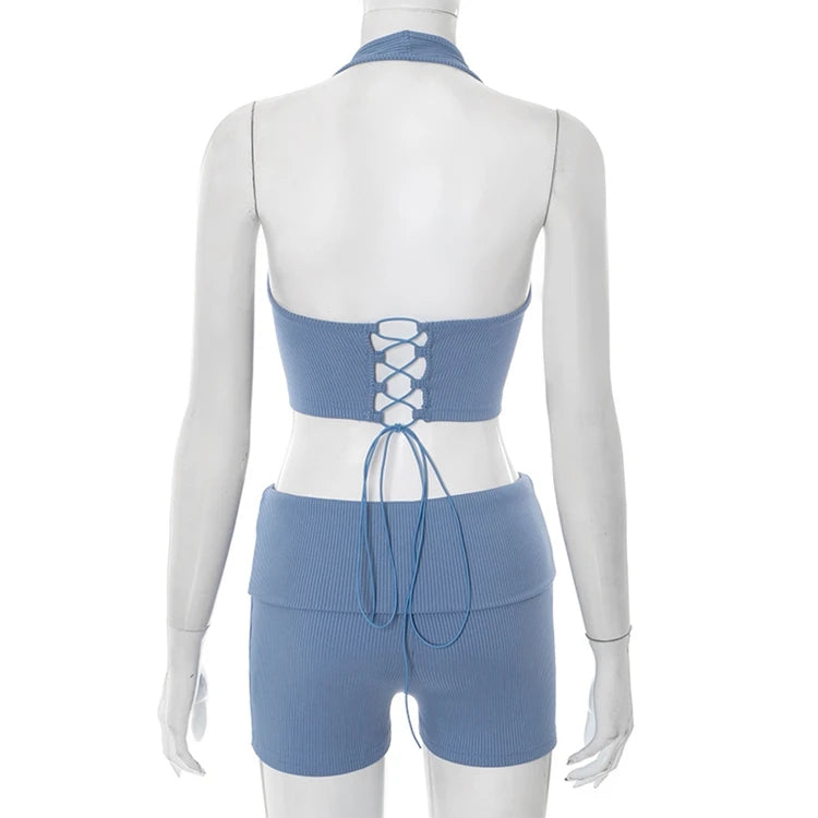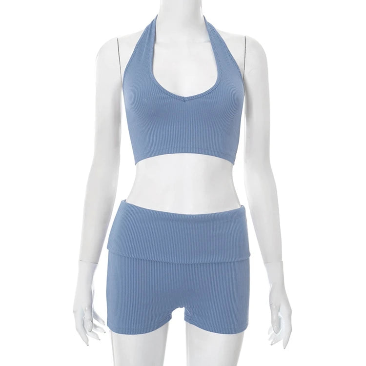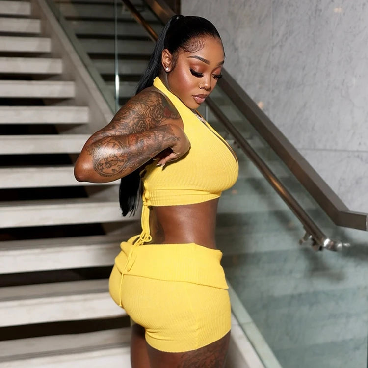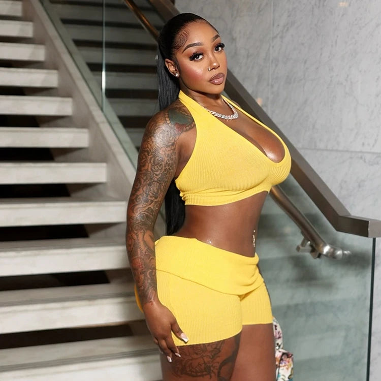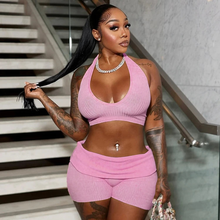 STYLISH LADY Printed Ribbed 2 Piece Set Women Halter Backless Crop Top and Shorts Suits 2025 Summer Sexy Club Party Outfits