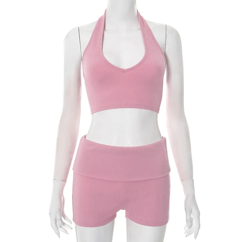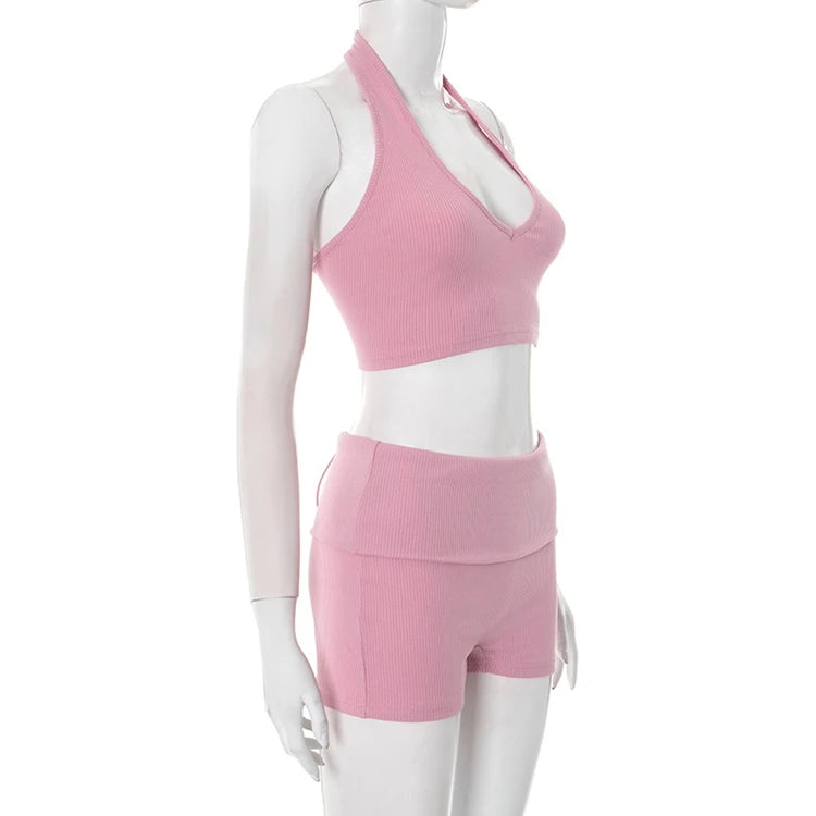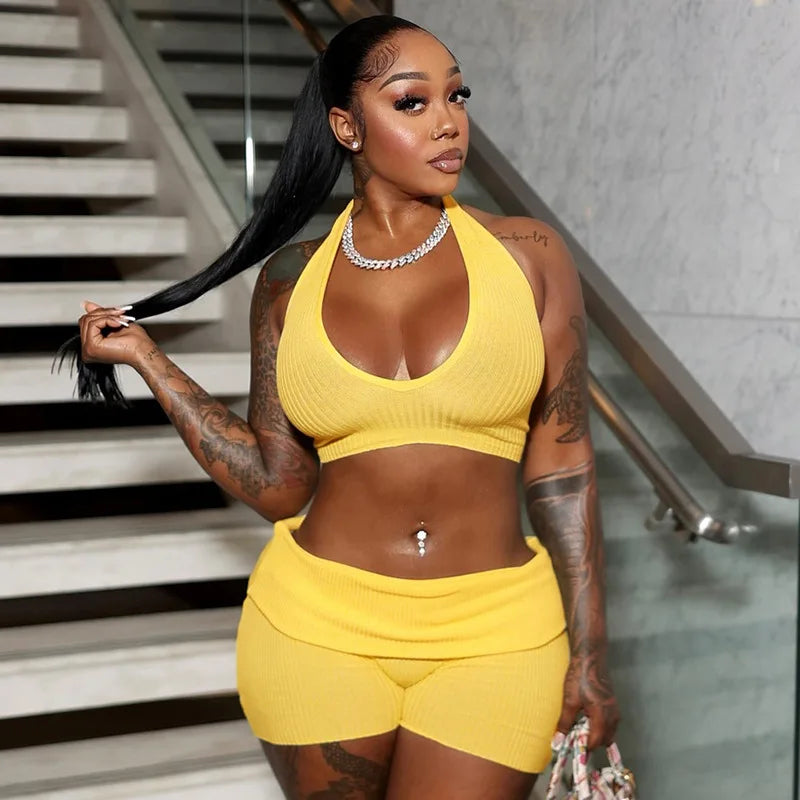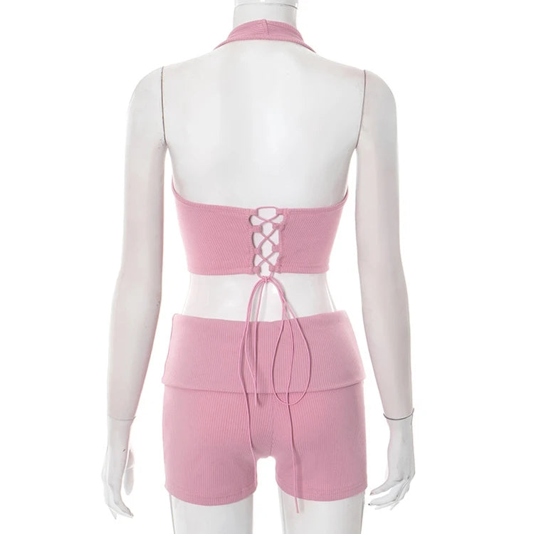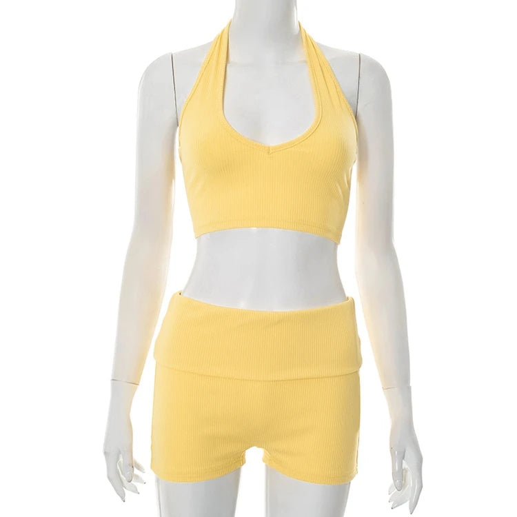 STYLISH LADY Printed Ribbed 2 Piece Set Women Halter Backless Crop Top and Shorts Suits 2025 Summer Sexy Club Party Outfits