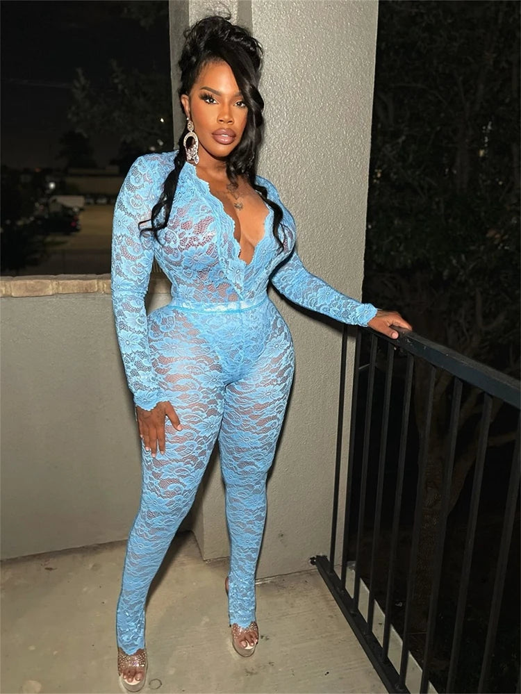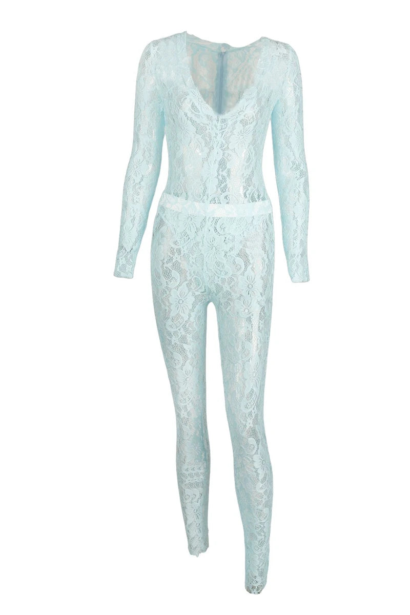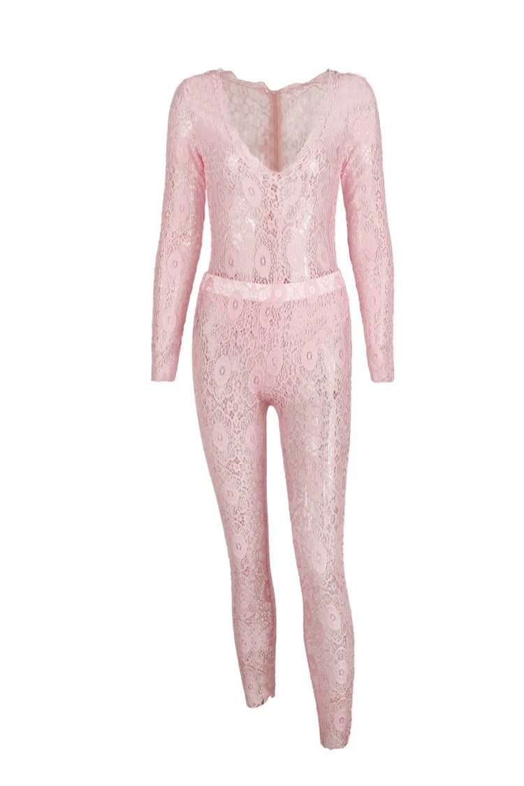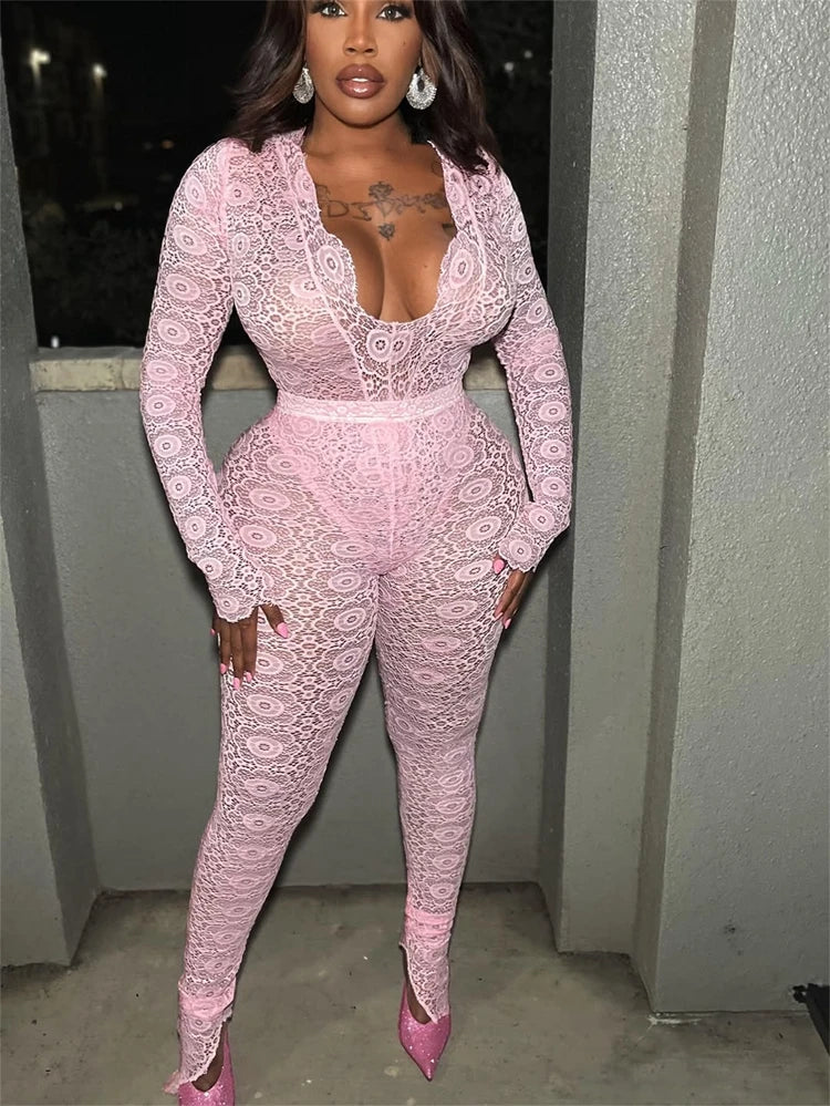 STYLISH LADY See Through Lace 2 Piece Set Women Long Sleeve Bodysuits and Skinny Pant Suits 2025 Summer Sexy Hollow Out Outfits