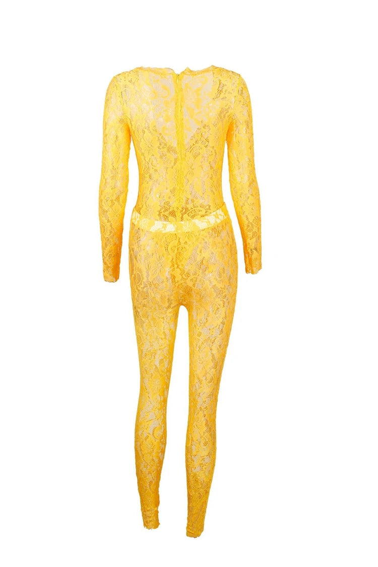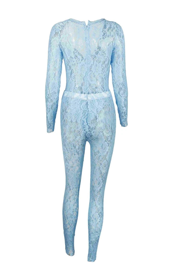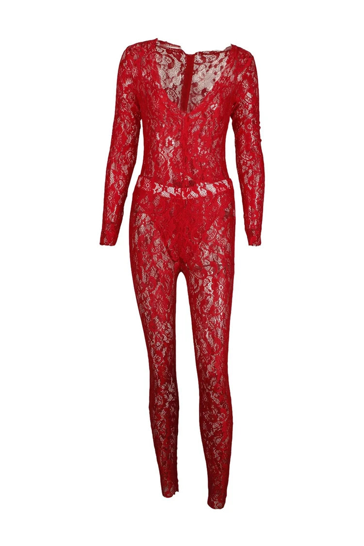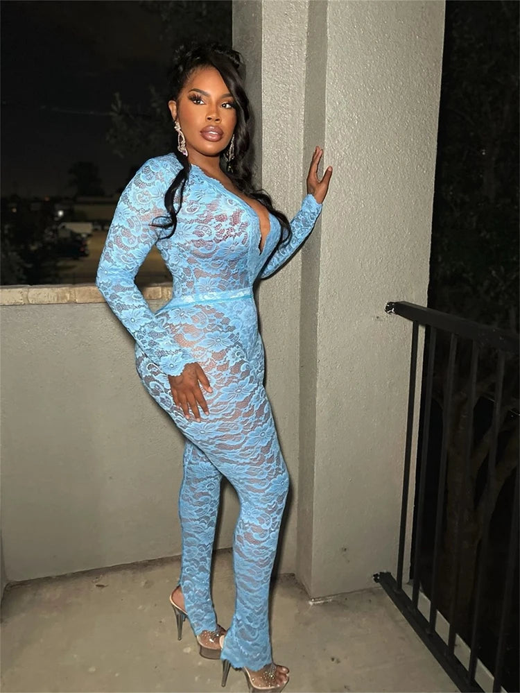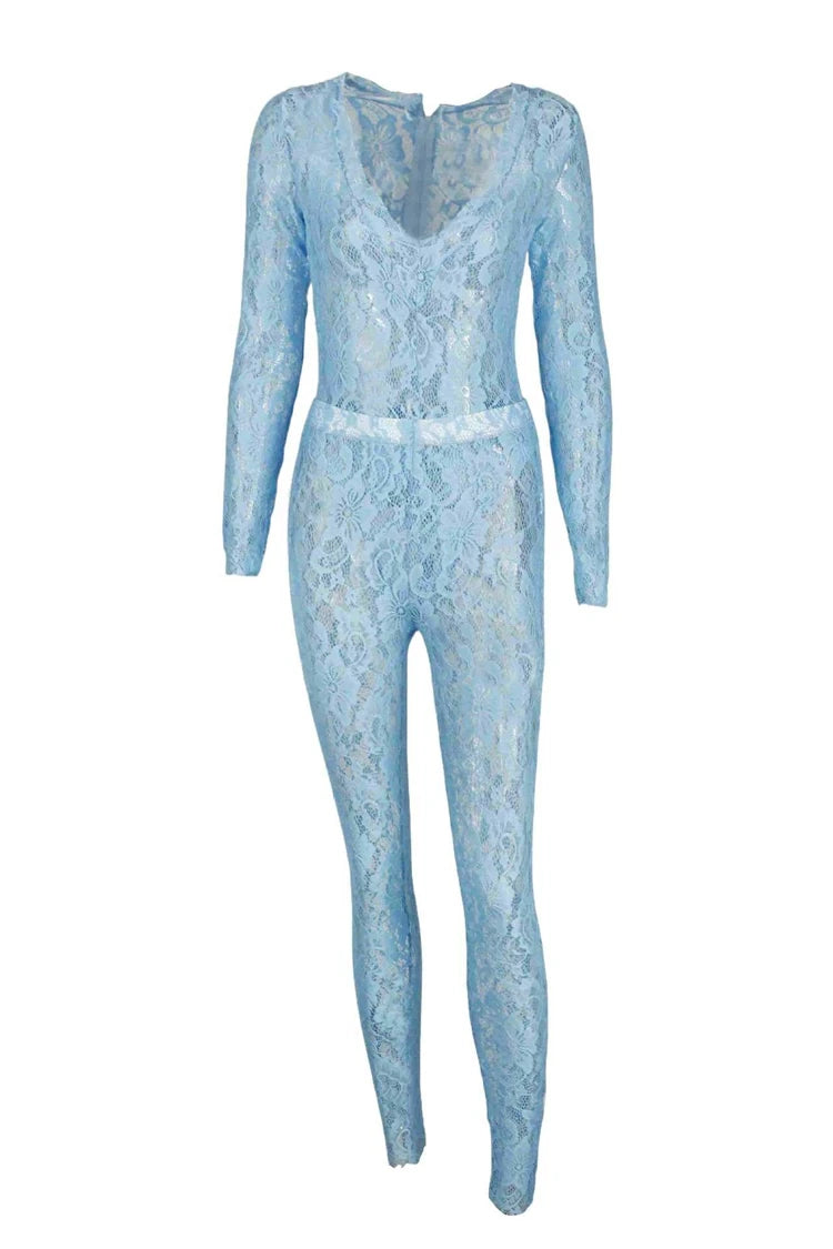 STYLISH LADY See Through Lace 2 Piece Set Women Long Sleeve Bodysuits and Skinny Pant Suits 2025 Summer Sexy Hollow Out Outfits