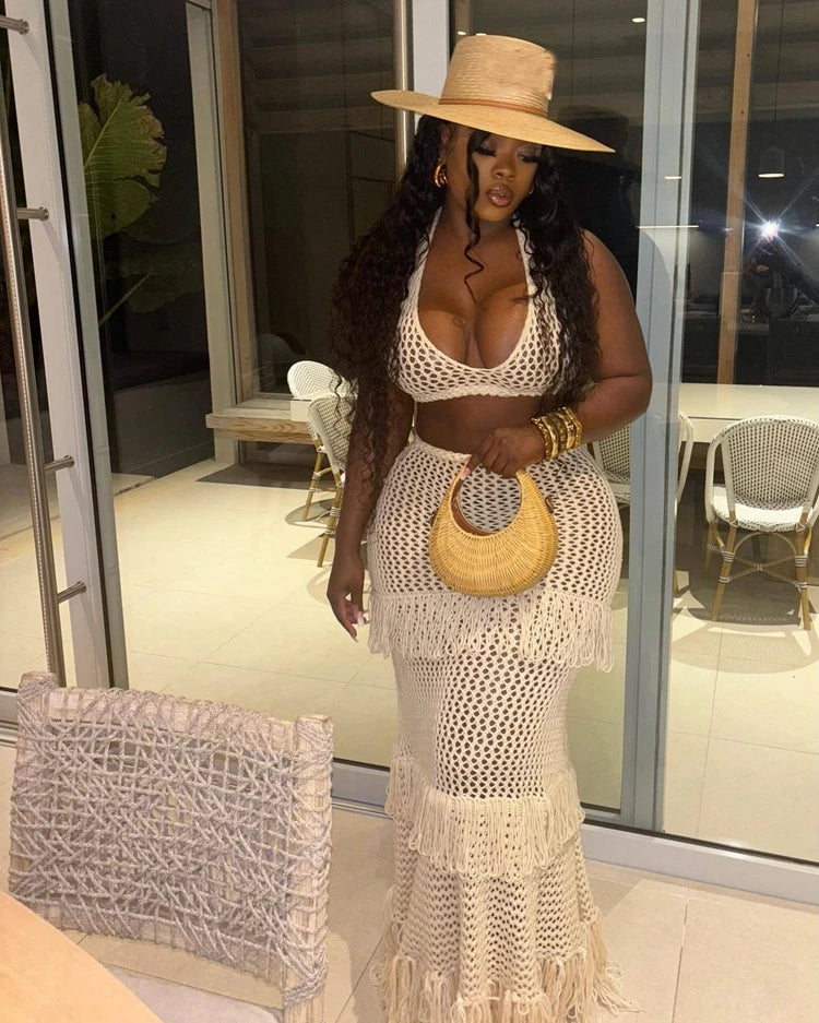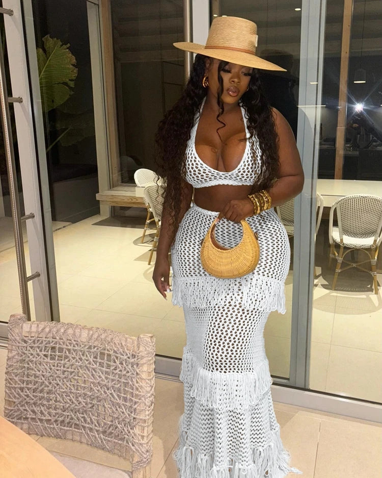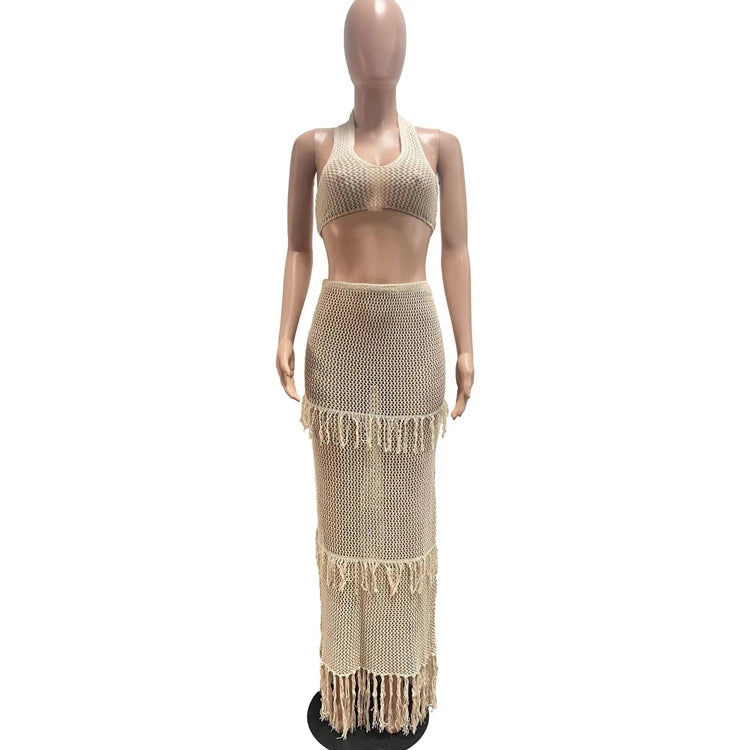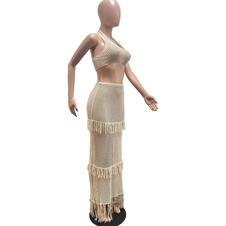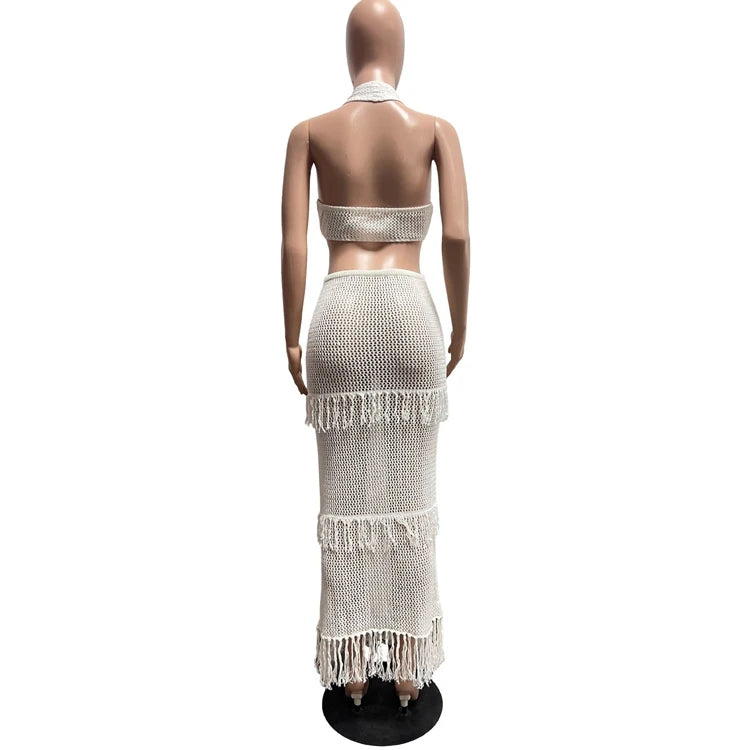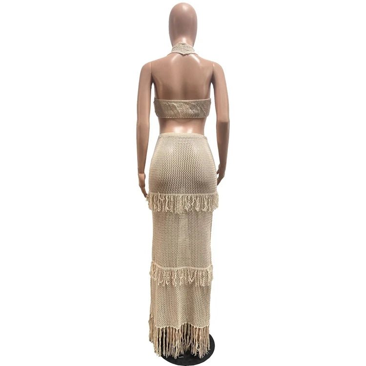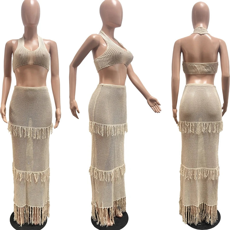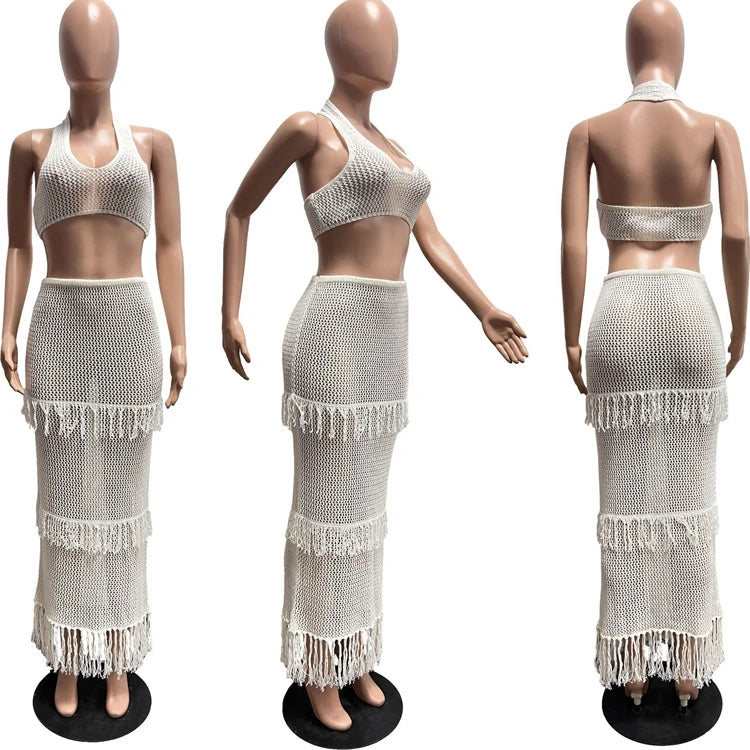 STYLISH LADY Tassel Crochet 2 Piece Set Women Halter Backless Crop Top and Maxi Skirts Suits 2025 Summer Sexy Beach Outfits