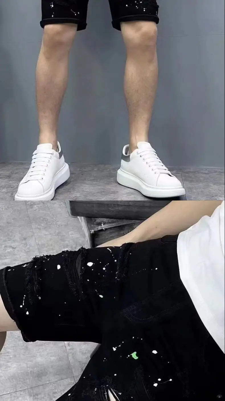 Summer Casual Men's Denim Shorts Korean Straight Washed Jeans Short Ins Ripped Cat Whisker Ink Splash Plaid Black Five-Pants