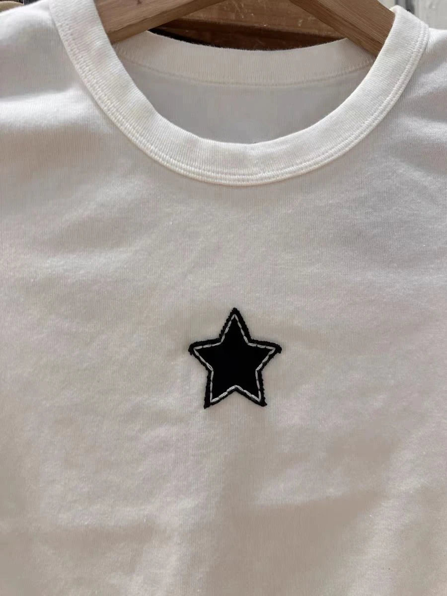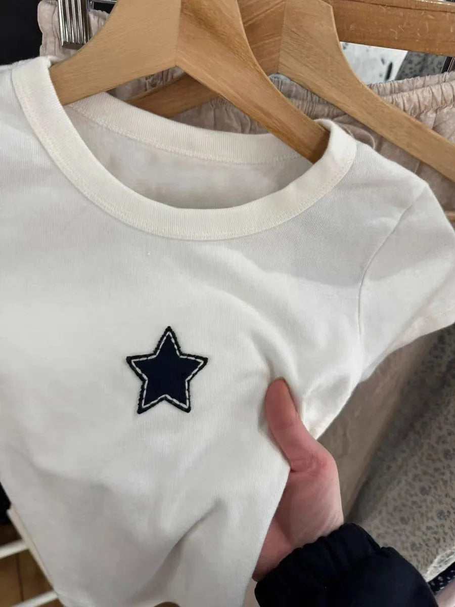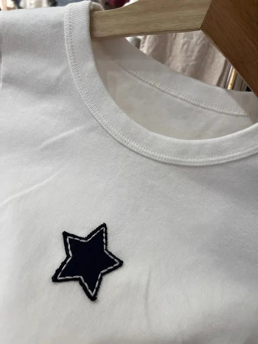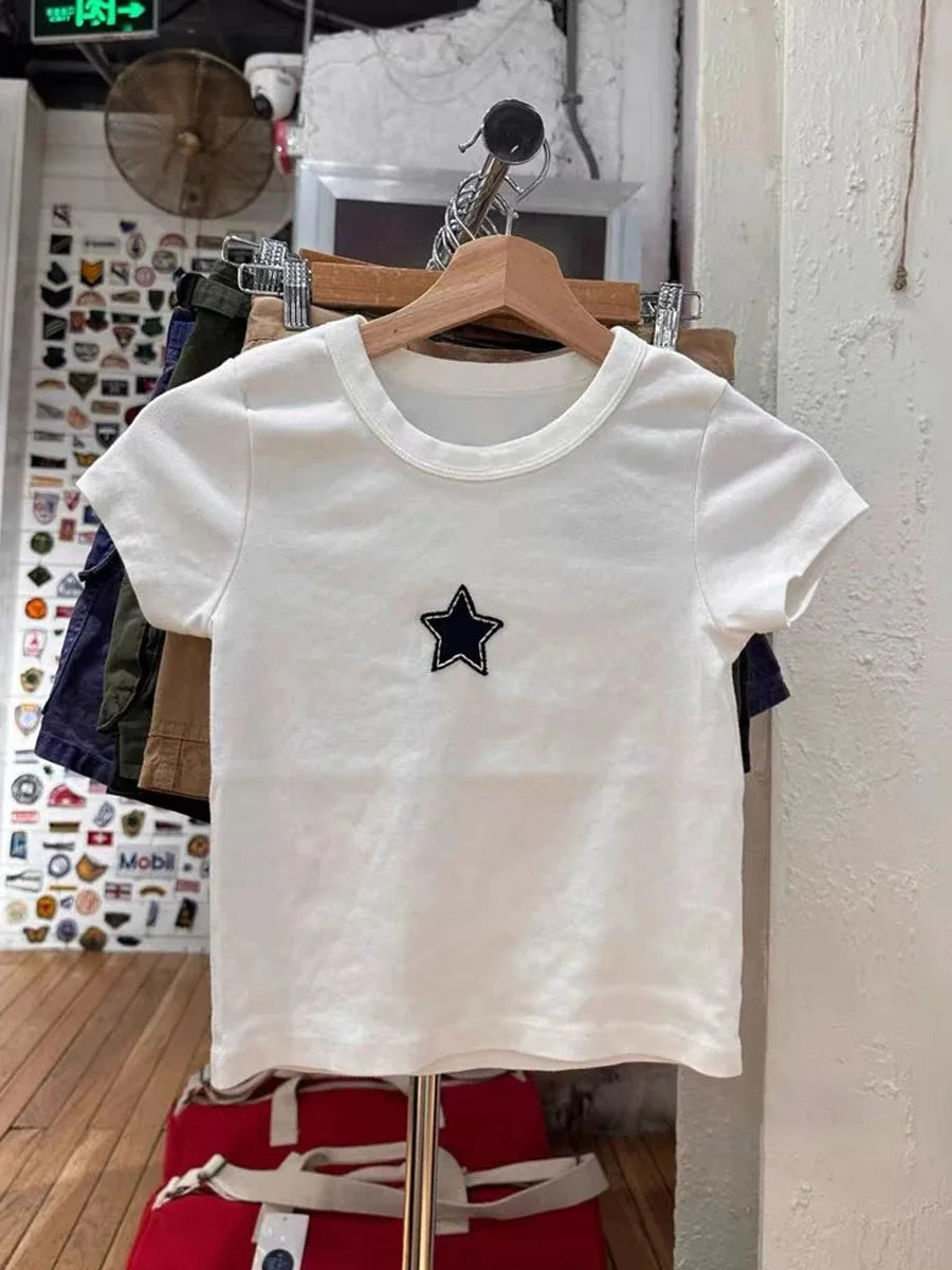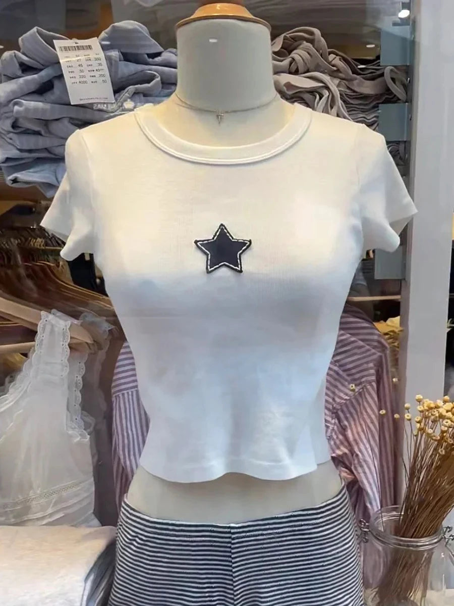 Sweet Star Appliques Slim Crop Top ladies Round Neck Short Sleeve Cotton Cropped T Shirt Summer Cute All-match T-shirts Y2K Tops