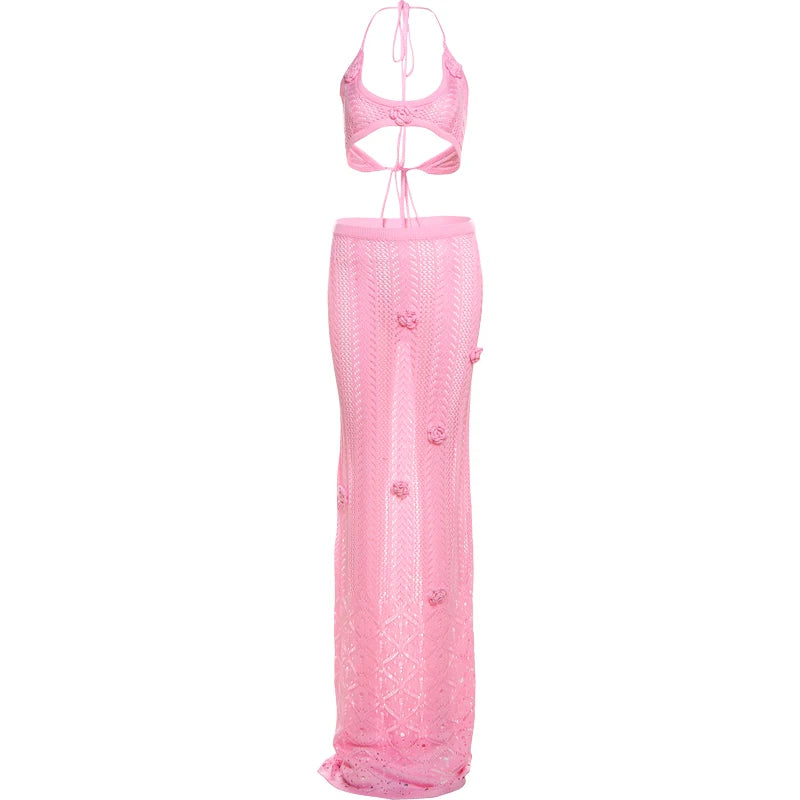 Weird Puss Beach Crochet Women Summer 2 Piece Set Applique Halter Bandage Camisole+Maxi Skirts Sexy Matching Vacation Clubwear