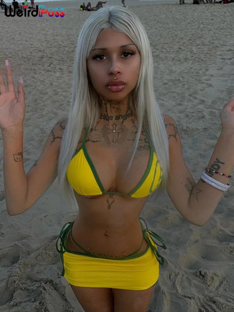 Weird Puss Beach Vacation 3Piece Set Women Letter Print Sexy Summer Bra+Bandage Briefs+Skirts Hipster Midnight Matching Clubwear