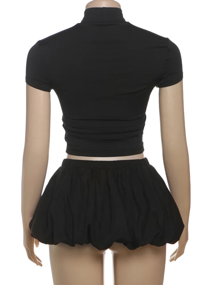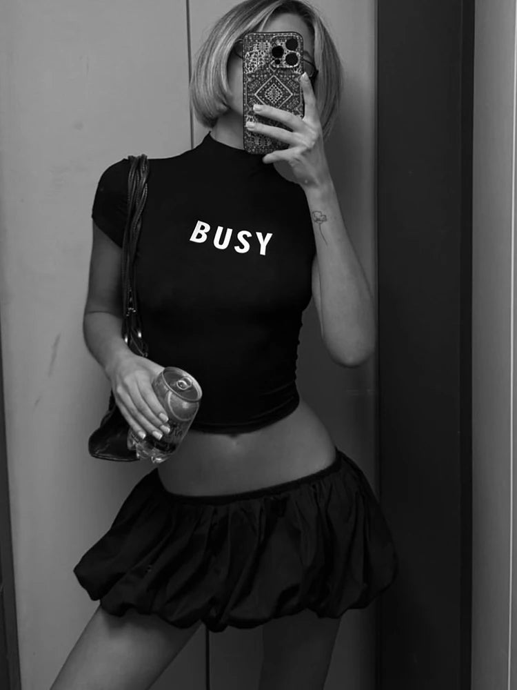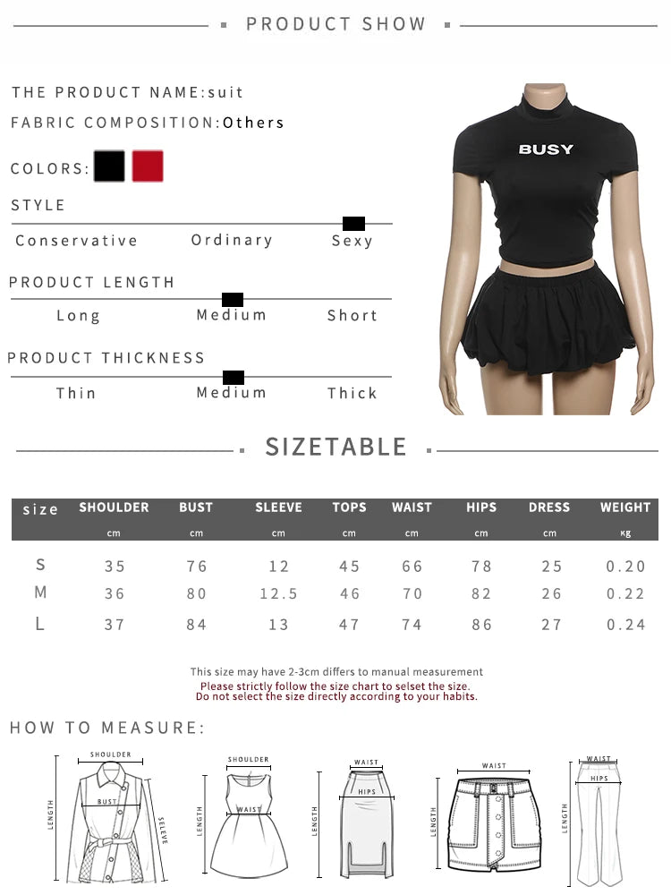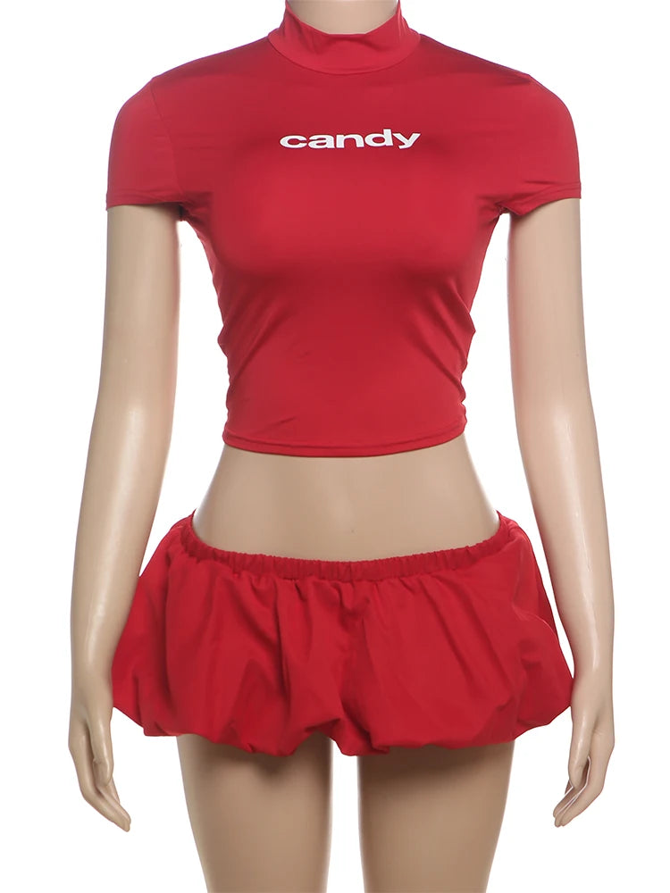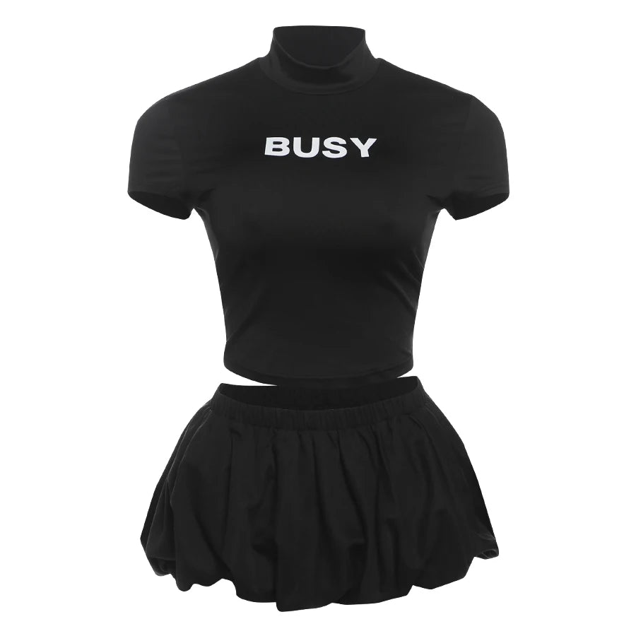 Weird Puss Casual 2 Piece Set Women Letter Print Shorts Sleeve Crop Tops+Puffy Skirt Simple Basic Matching Streetwear Outfits