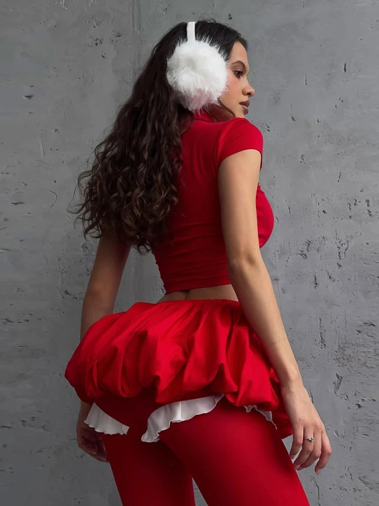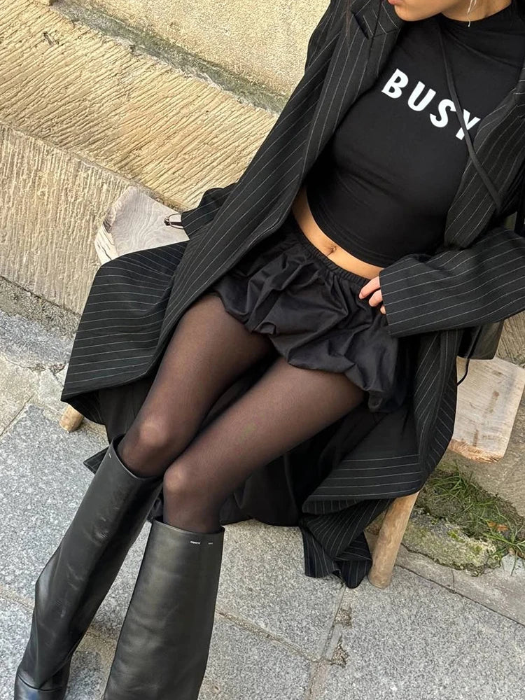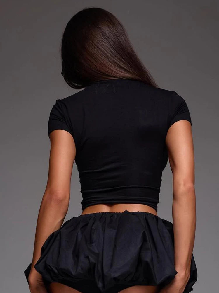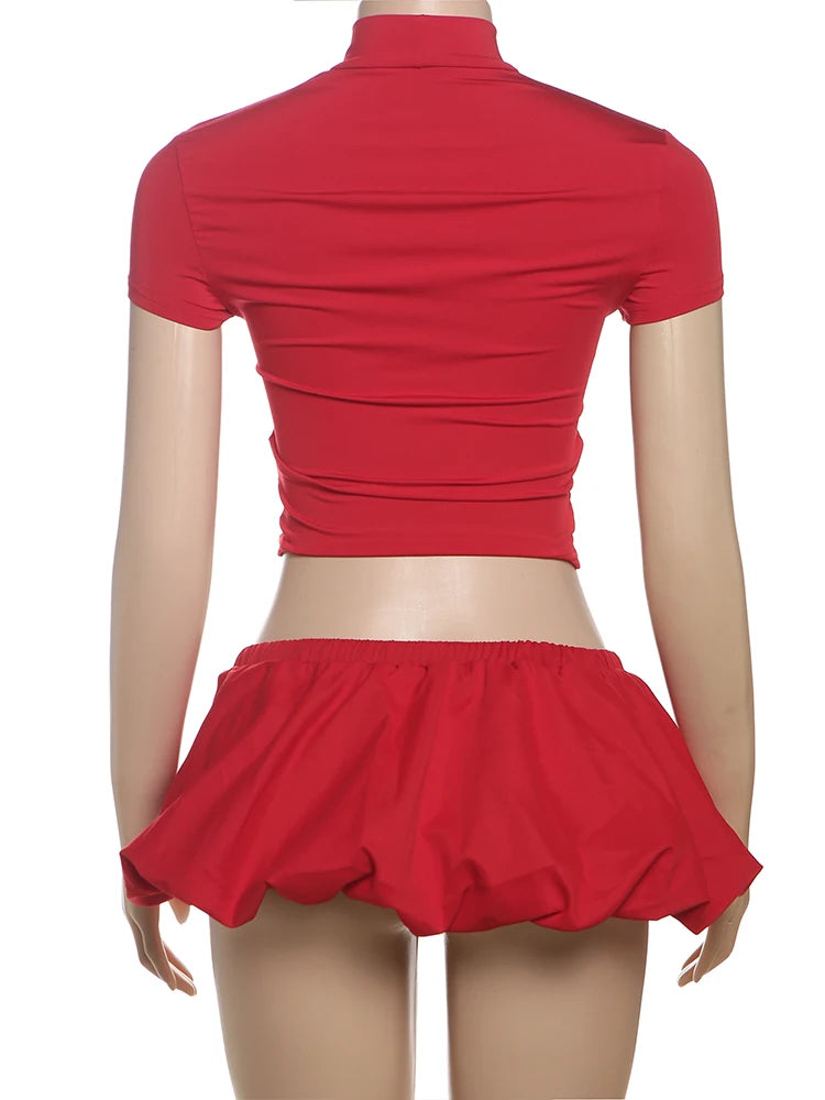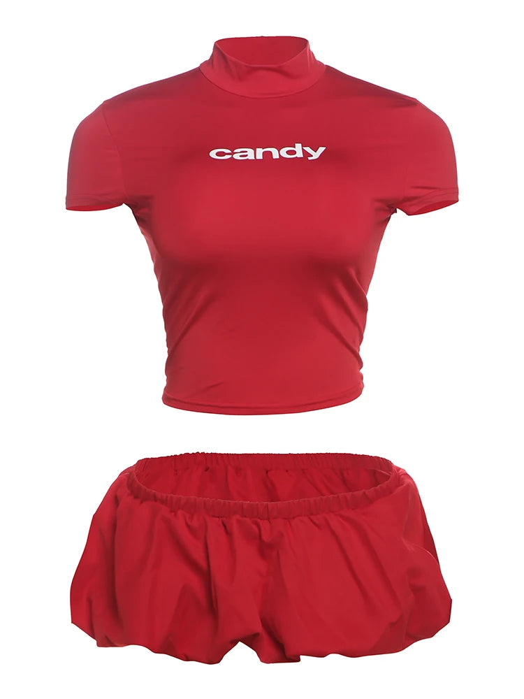 Weird Puss Casual 2 Piece Set Women Letter Print Shorts Sleeve Crop Tops+Puffy Skirt Simple Basic Matching Streetwear Outfits
