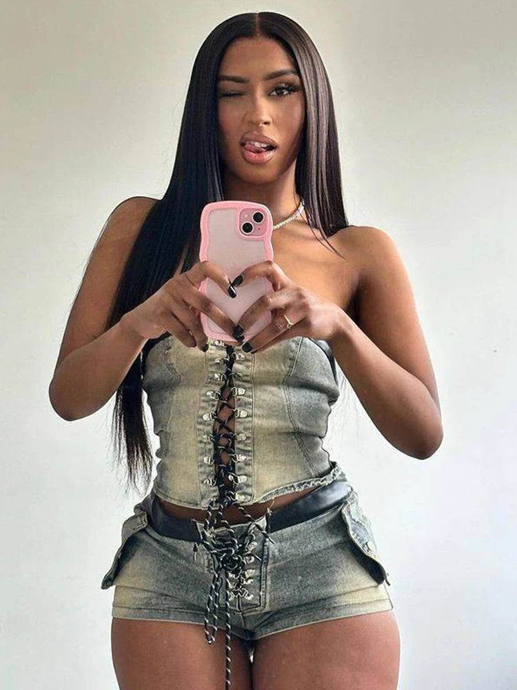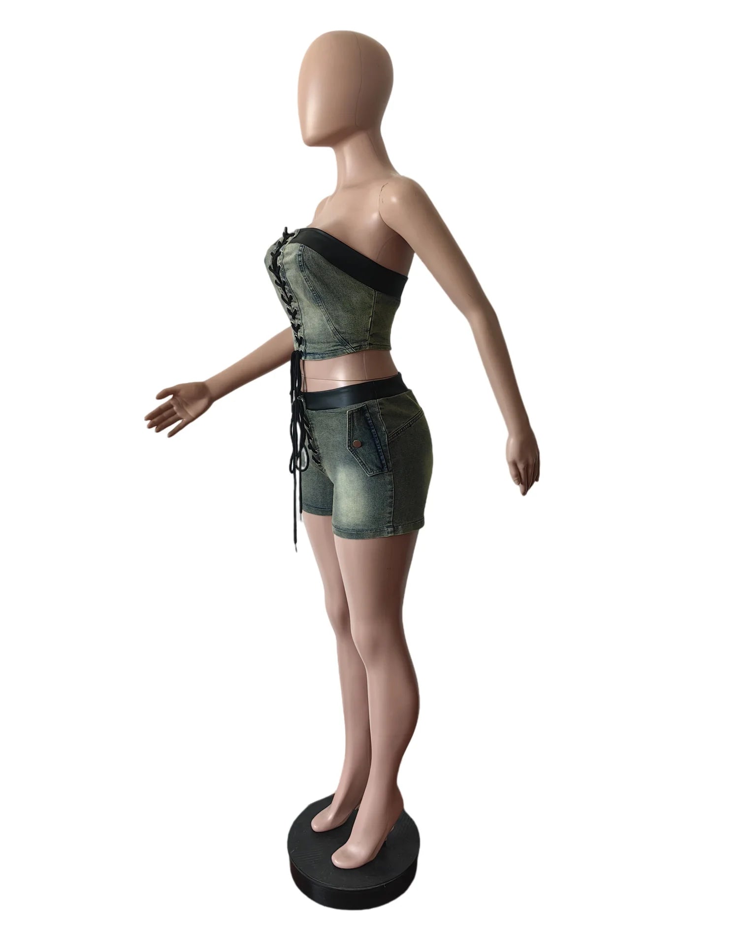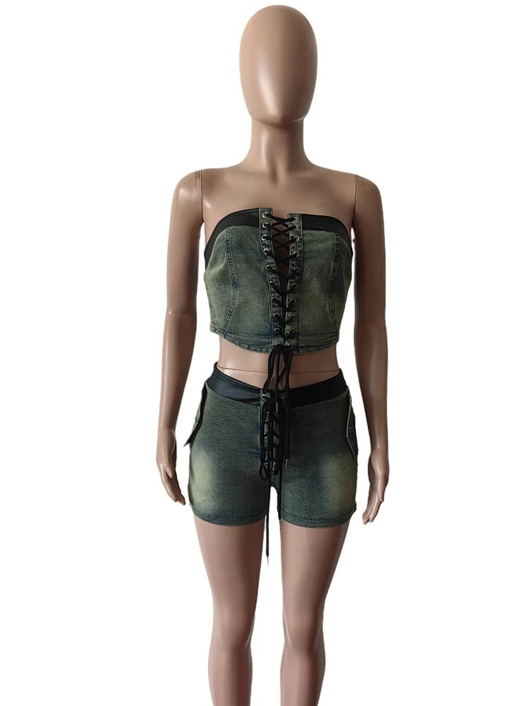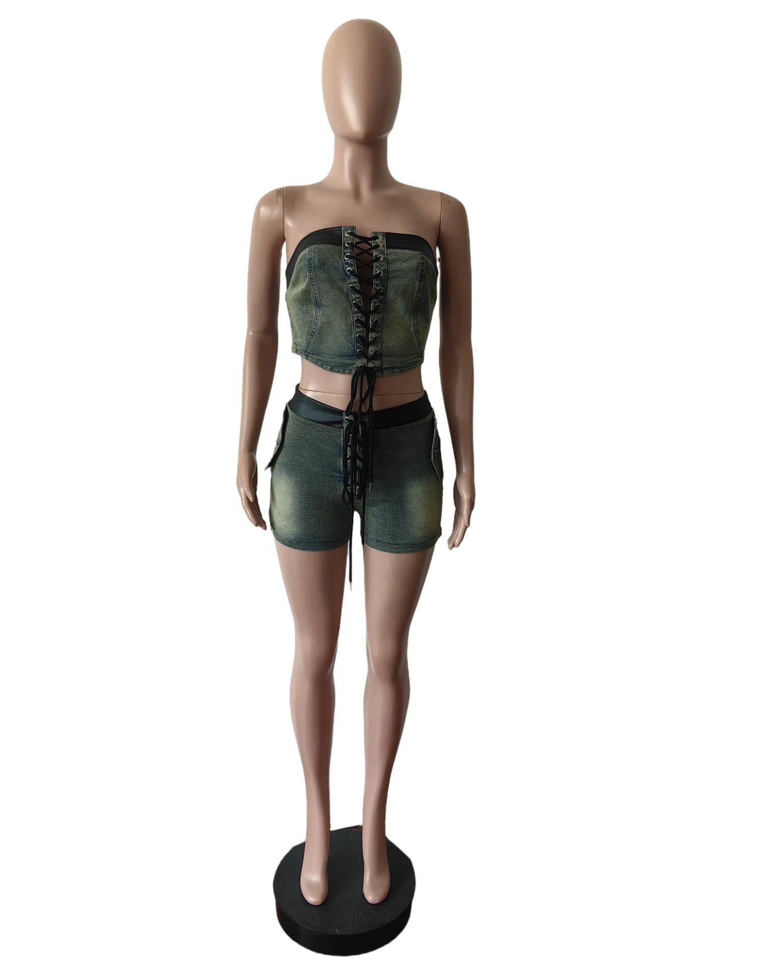 Weird Puss jeans Summer 2 Piece Set Women Leather Edging Vintage Y2K Shirring Strapless Tops+Shorts Hipster Summer Matching Suit