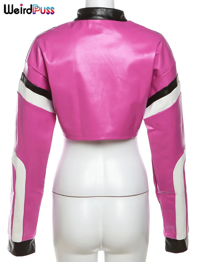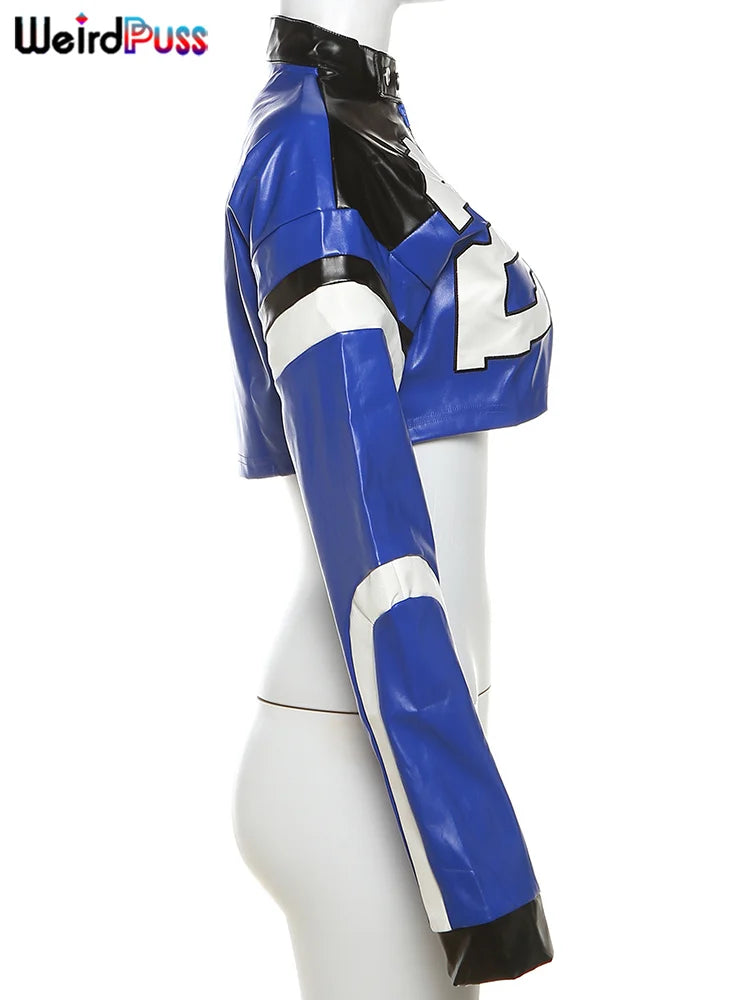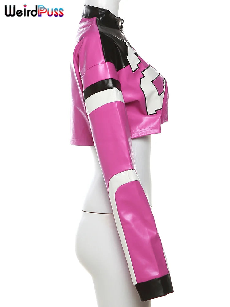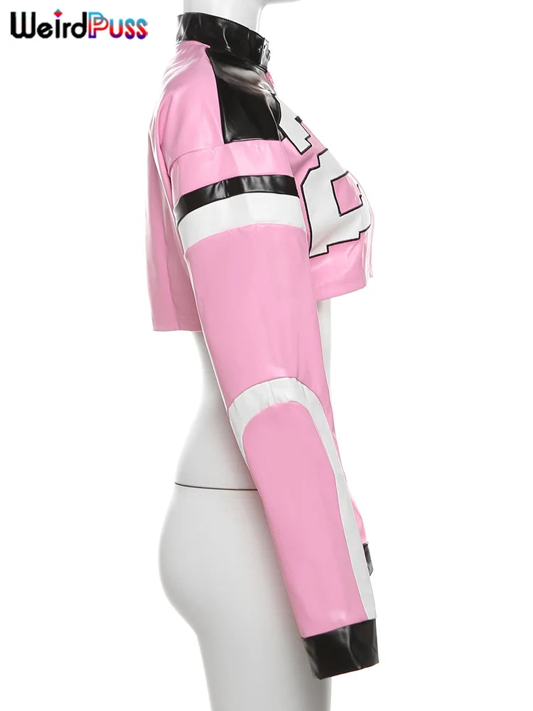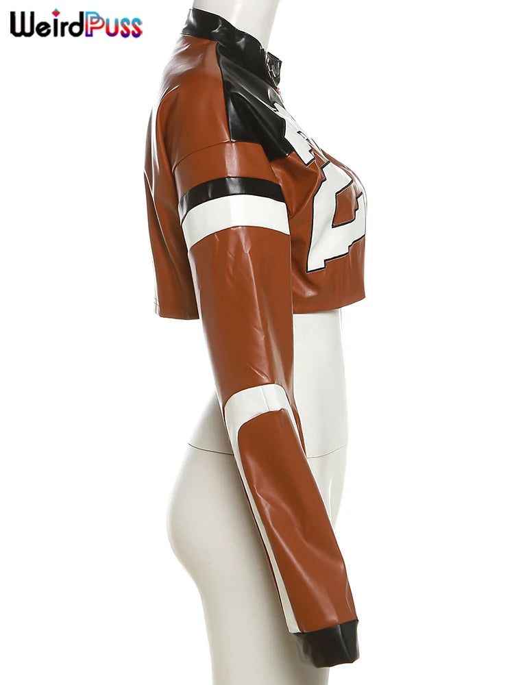 Weird Puss Faux Leather Varsity Jacket Women Hipster Letter Print Autumn Casual Sporty Wild Streetwear Uniform Trend Crop Coat