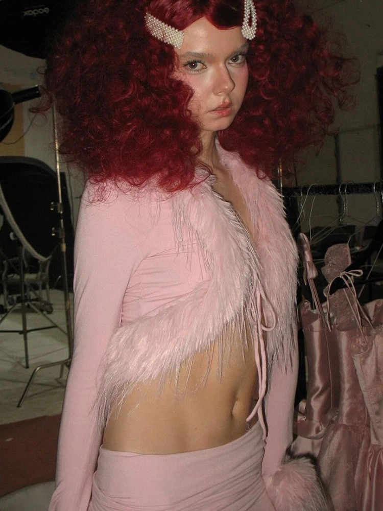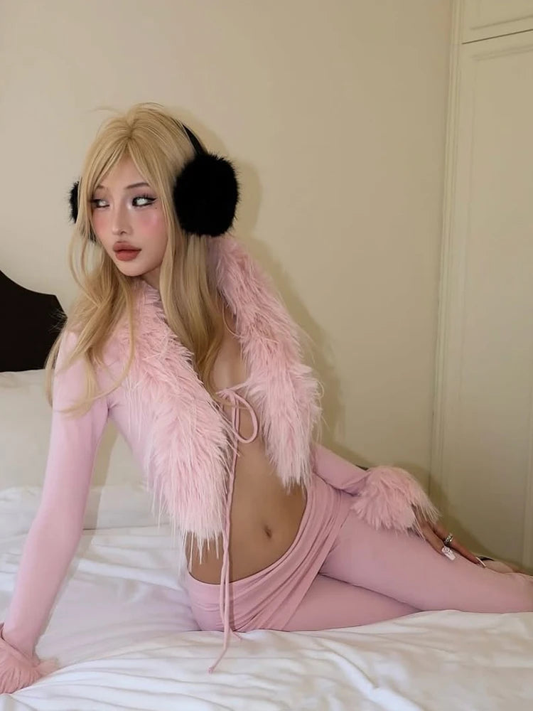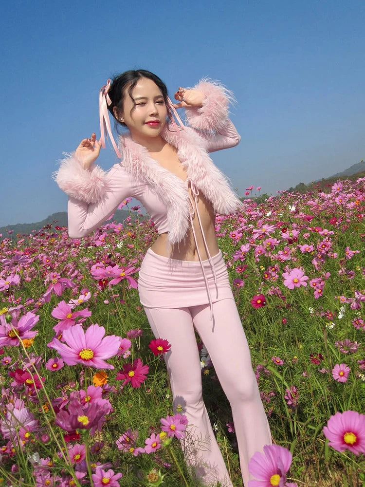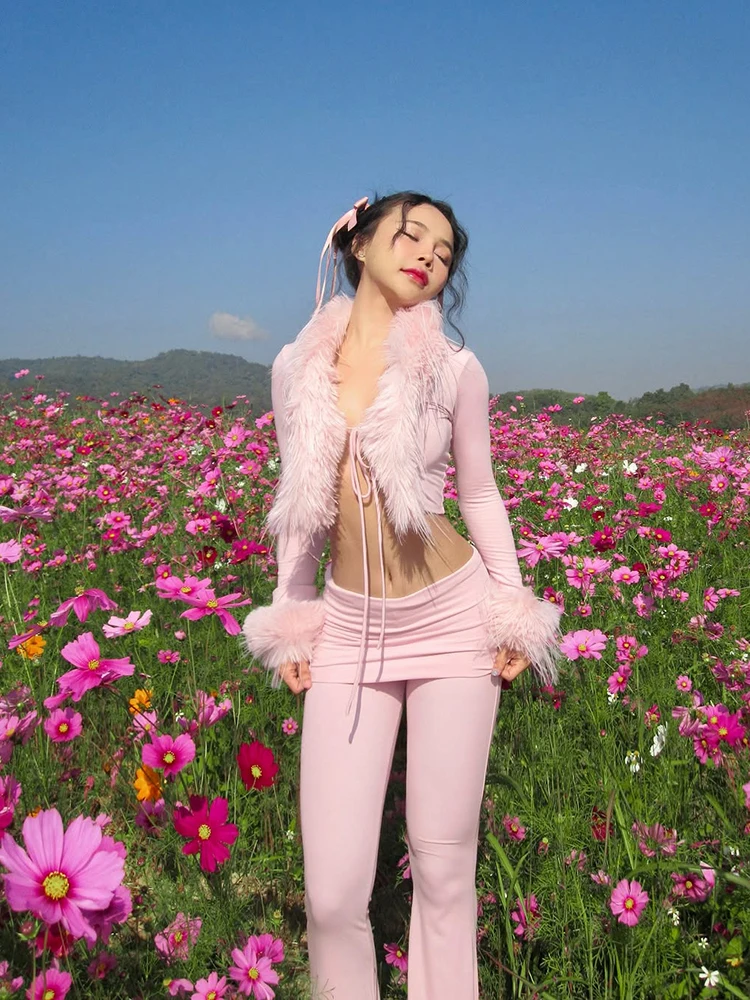 Weird Puss Feather Patchwork 2 Piece Set Women Bandages Bell sleeve Crop Top+Peach Hip Flare Pants Sexy Stretch Party Streetwear