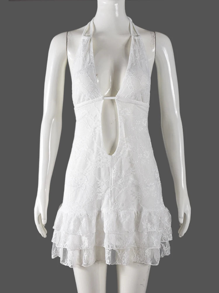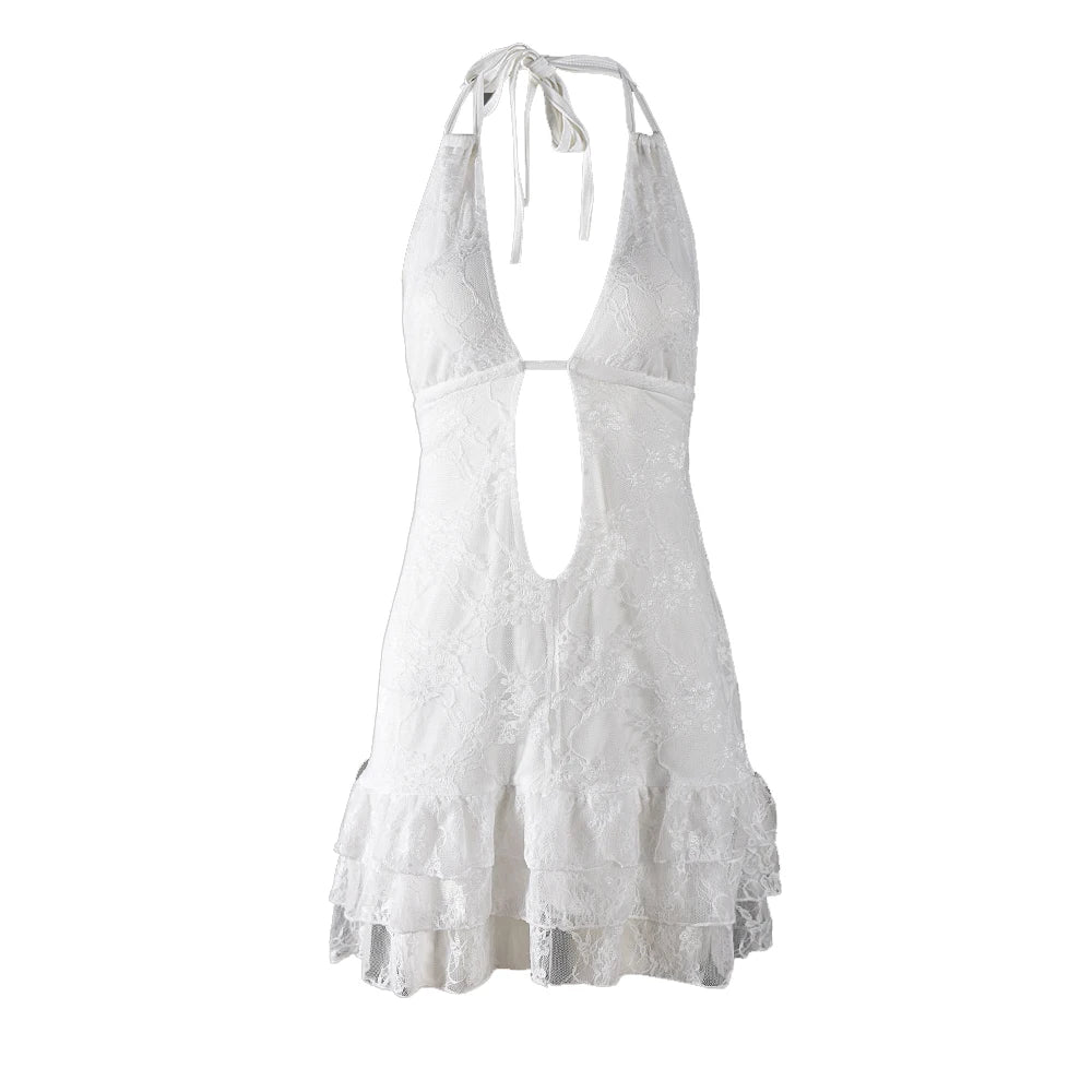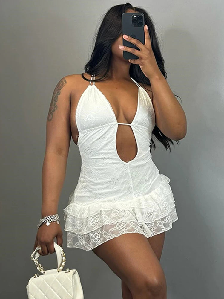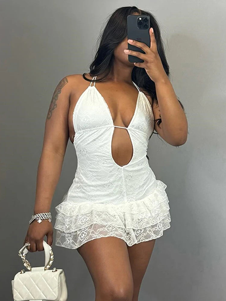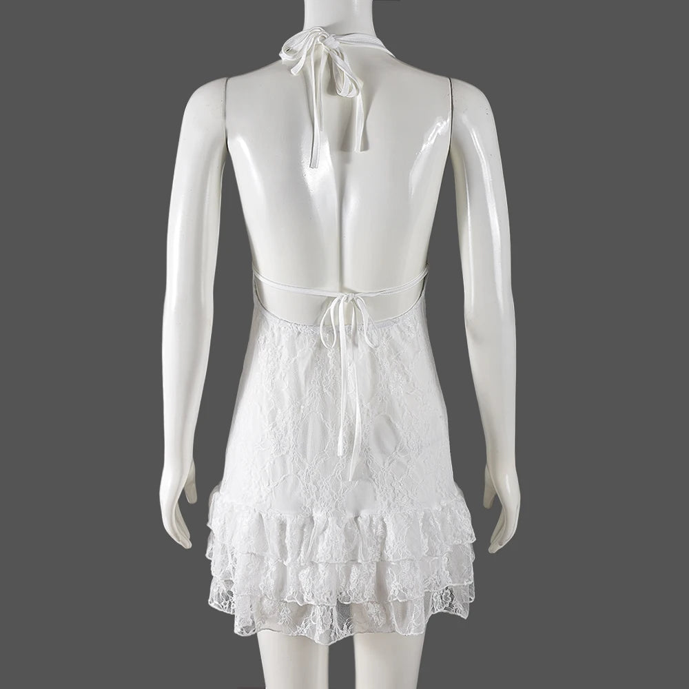 Weird Puss Halter Tierred Cake Dress Low-Neck Sexy Backless Midnight Party Coquette Summer Trend Stretch Vacation Rave Bodycon