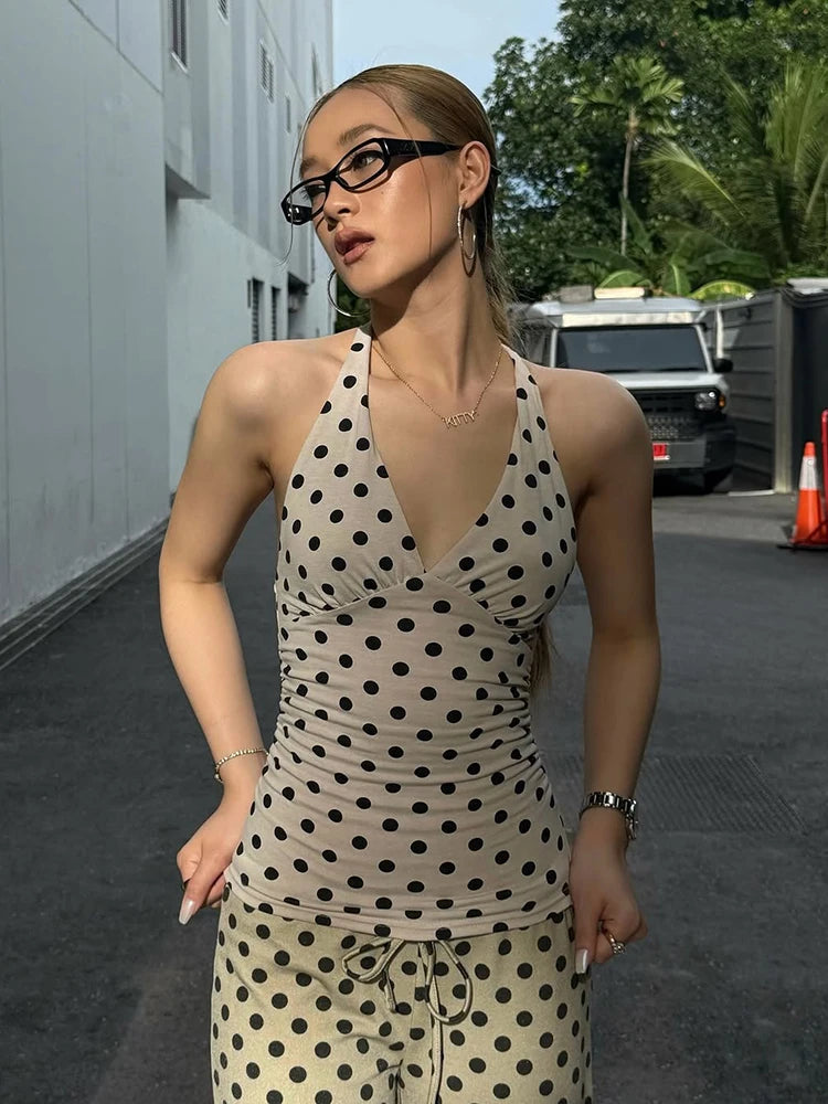 weird Puss Halter v-Neck Vest Women Y2K Lace-Up Backless Polka Dot Print Skinny Summer Fashion Daily Street Basic Tank Tops