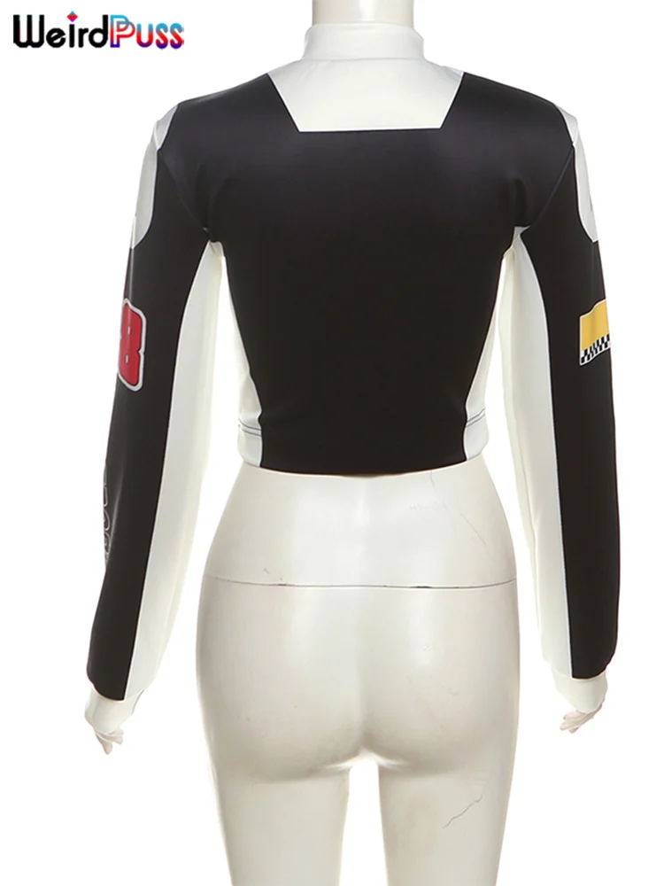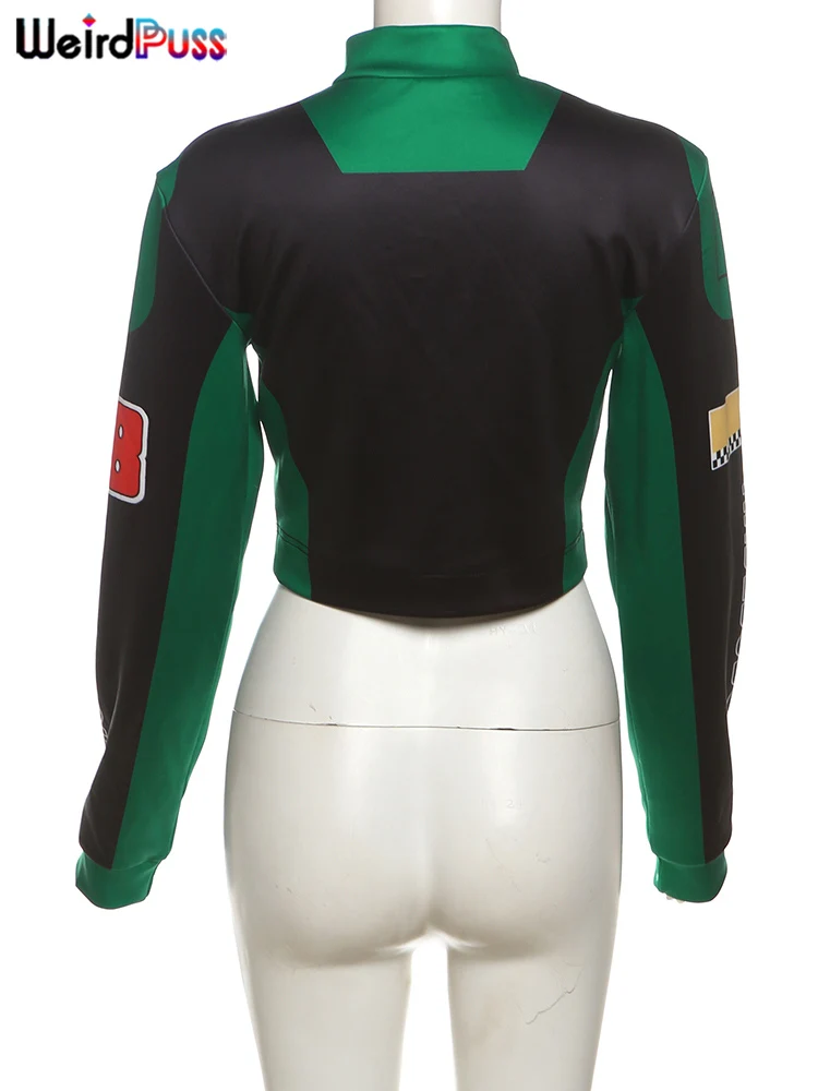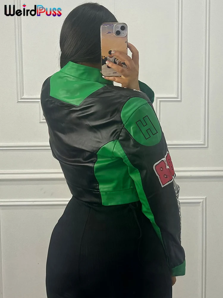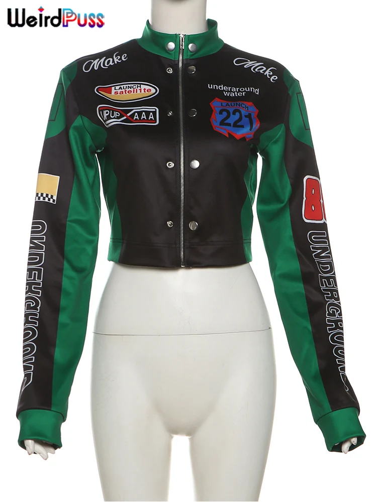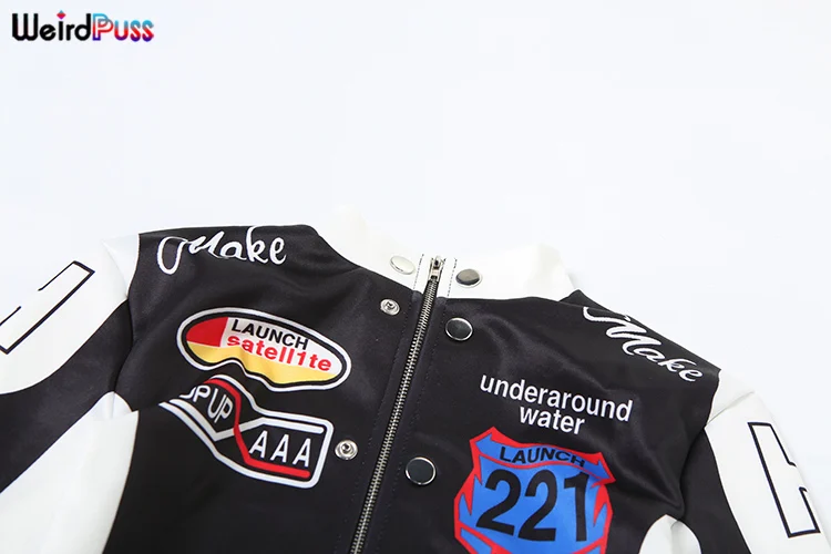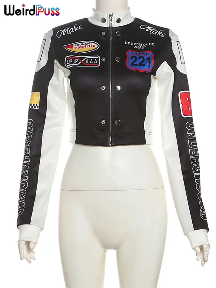 Weird Puss Hipster Patchwork Jacket Women Y2K Letter Print Hipster Uniform Street Single-Breasted Hipster Autumn Trend Zip Coat