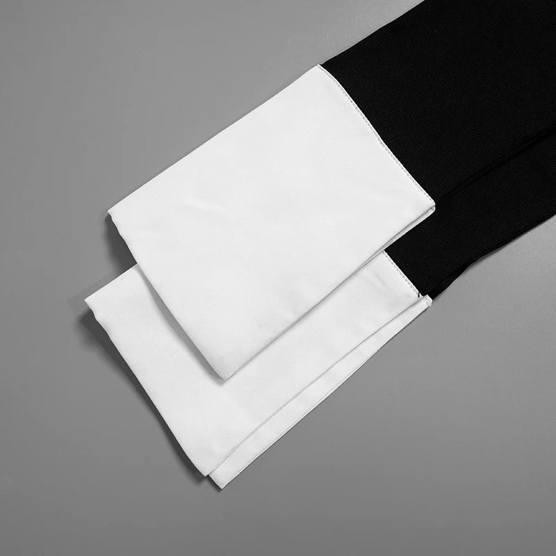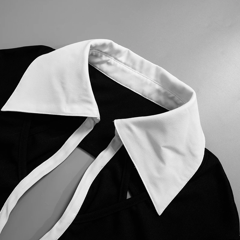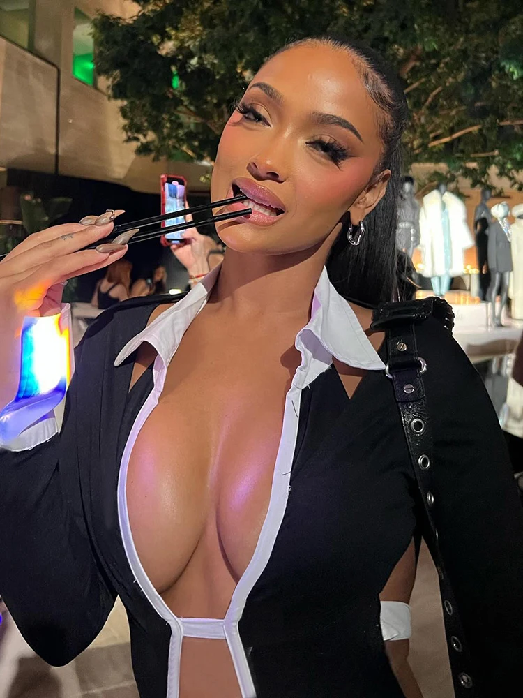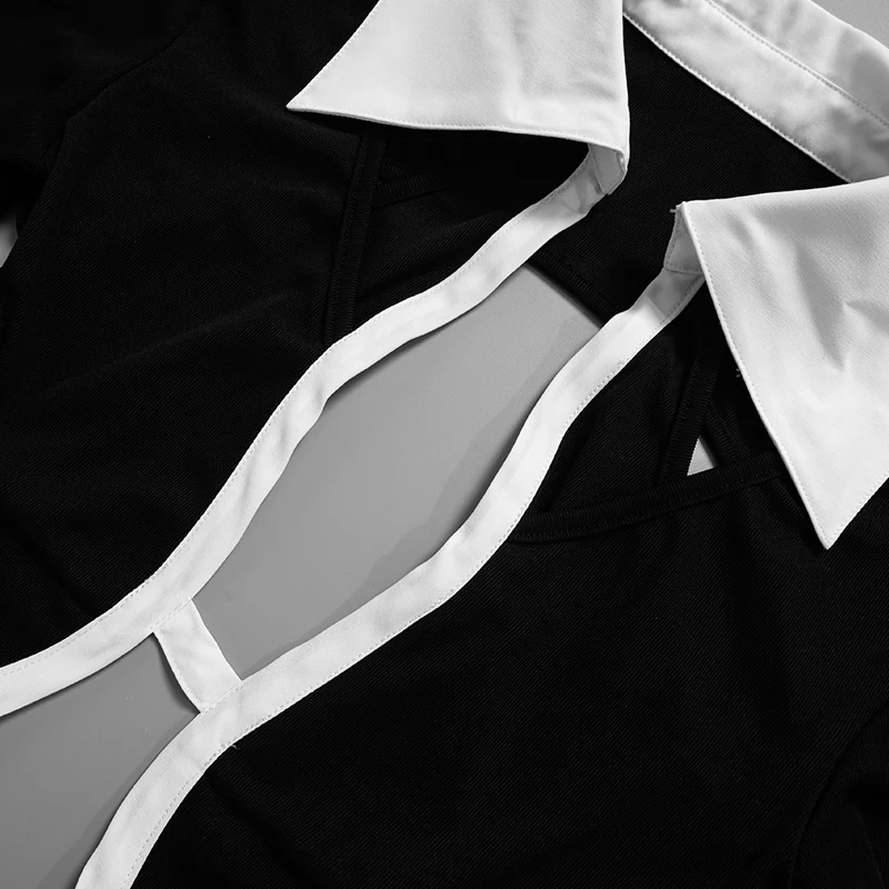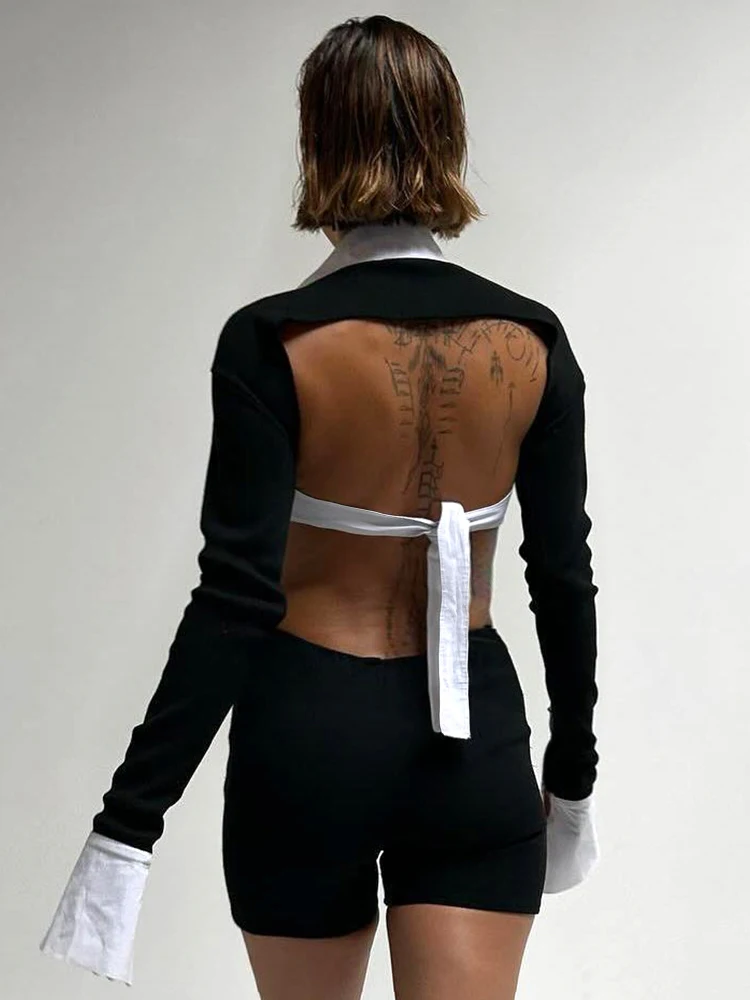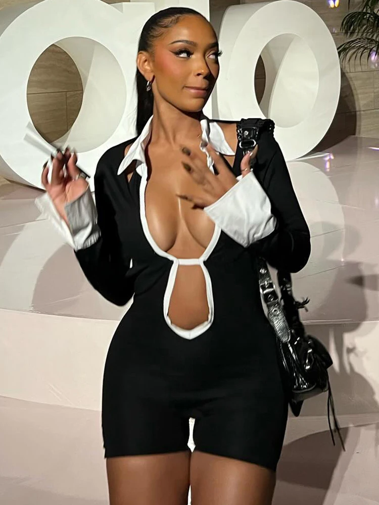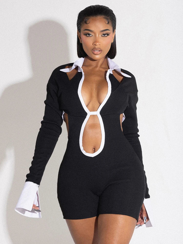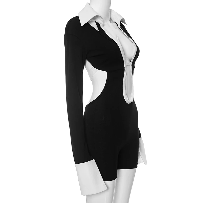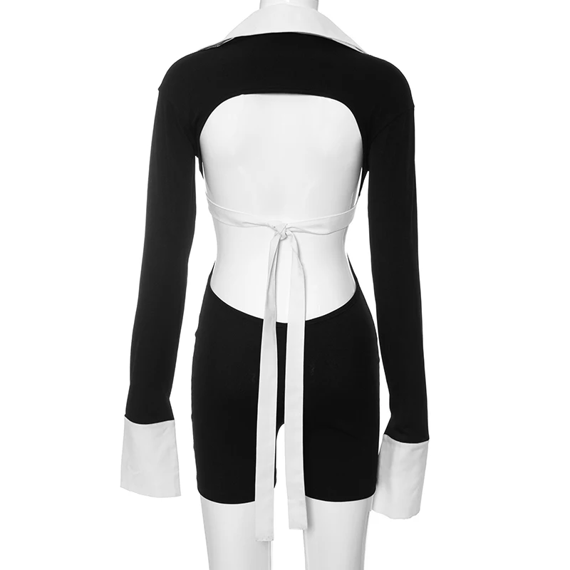 Weird Puss Hollow Backless Women Playsuits Bandage Polo Neck Full Sleeve Skinny Contrast Color Hipster High Street Sexy Romper