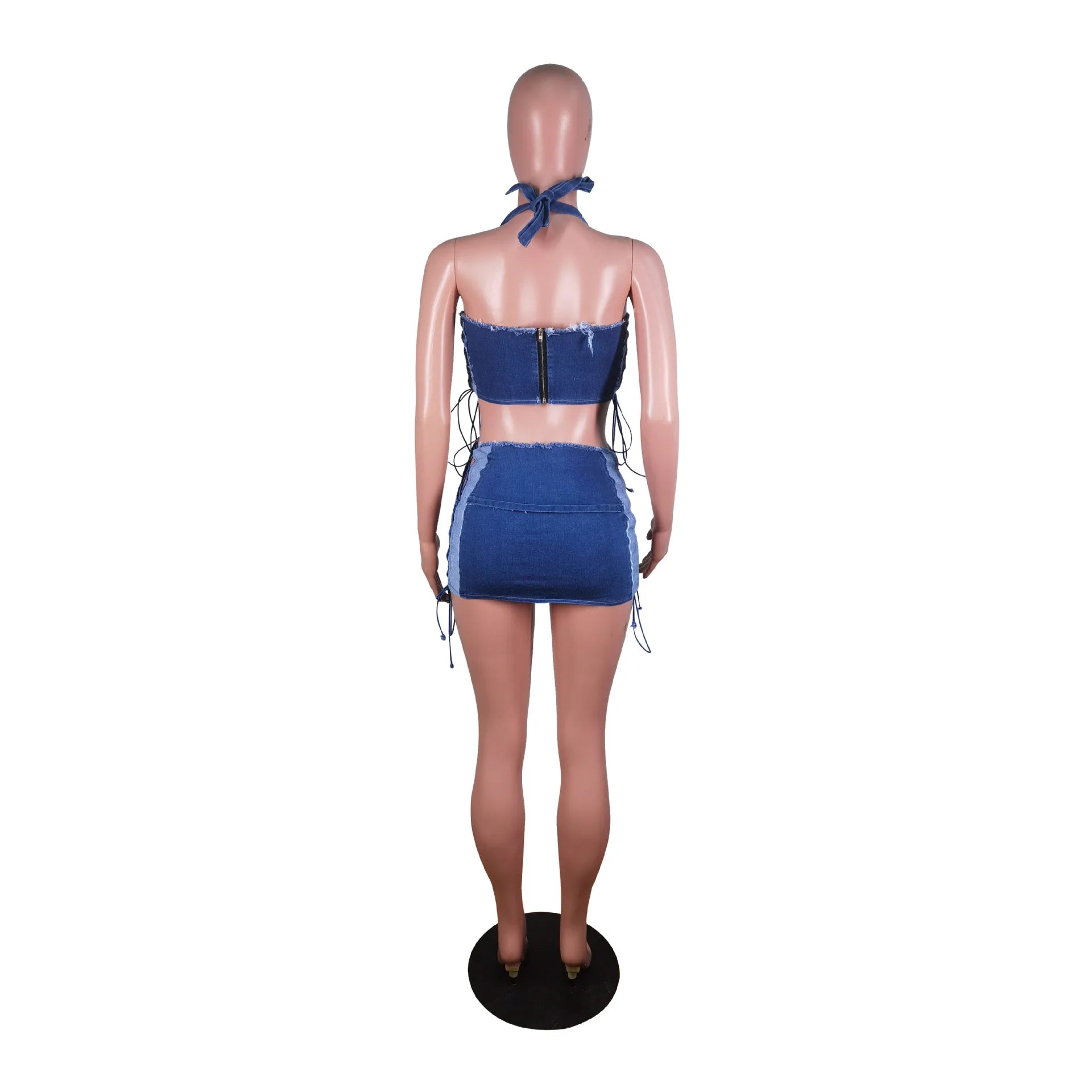 Weird Puss Hollow Bandage jeans 2 Piece Set Women Irregular Halter Zipper Sleeveless Crop Tops+Distressed Patchwork Skirts Suit