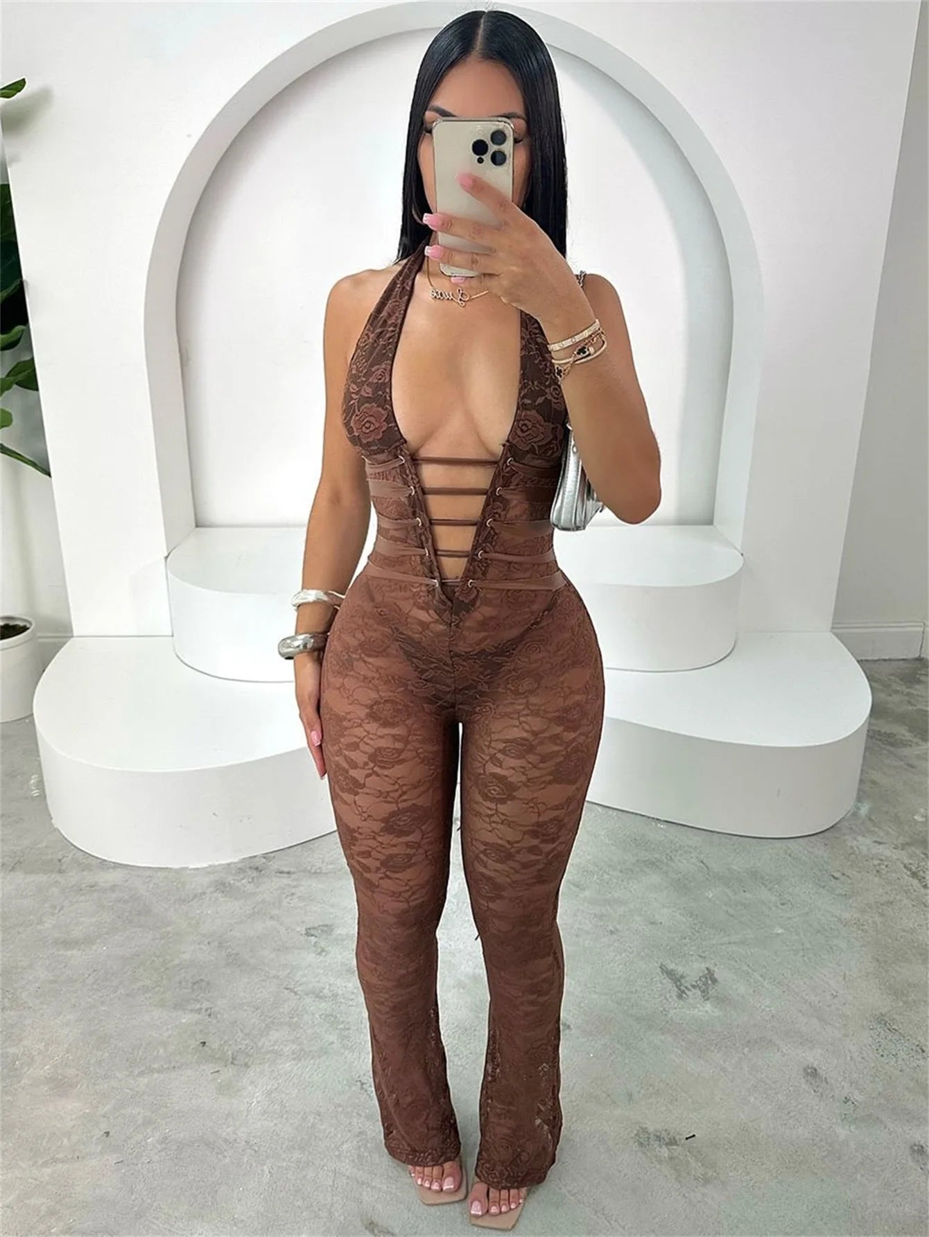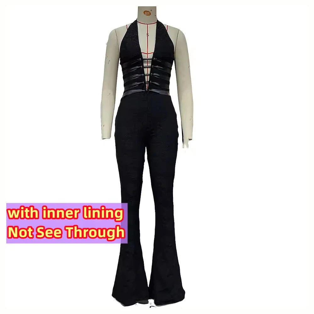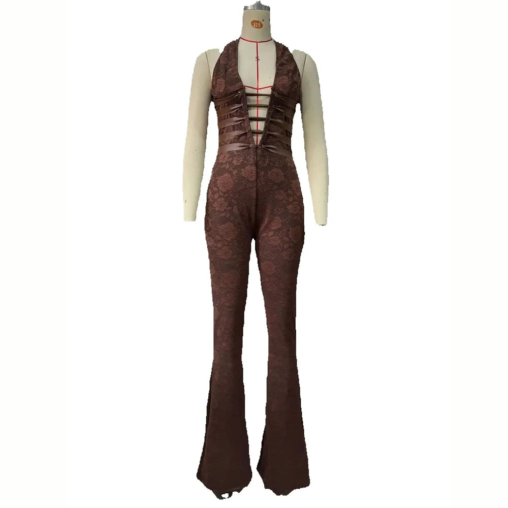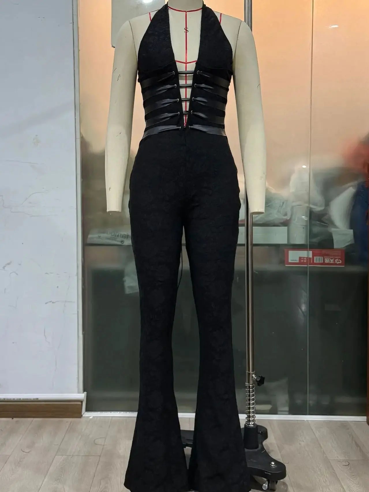 Weird Puss Hollow Bandage Jumpsuits Women Halter Sexy Jacquard Backless Sleeveless Skinny Street Workout Club Hipster Overalls