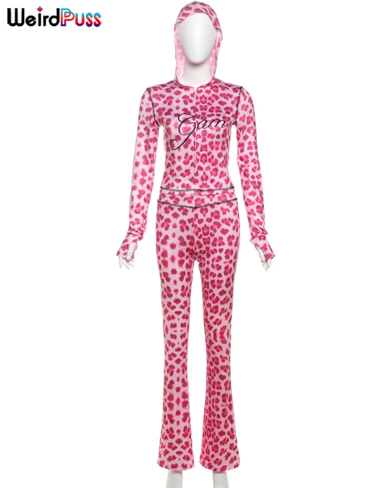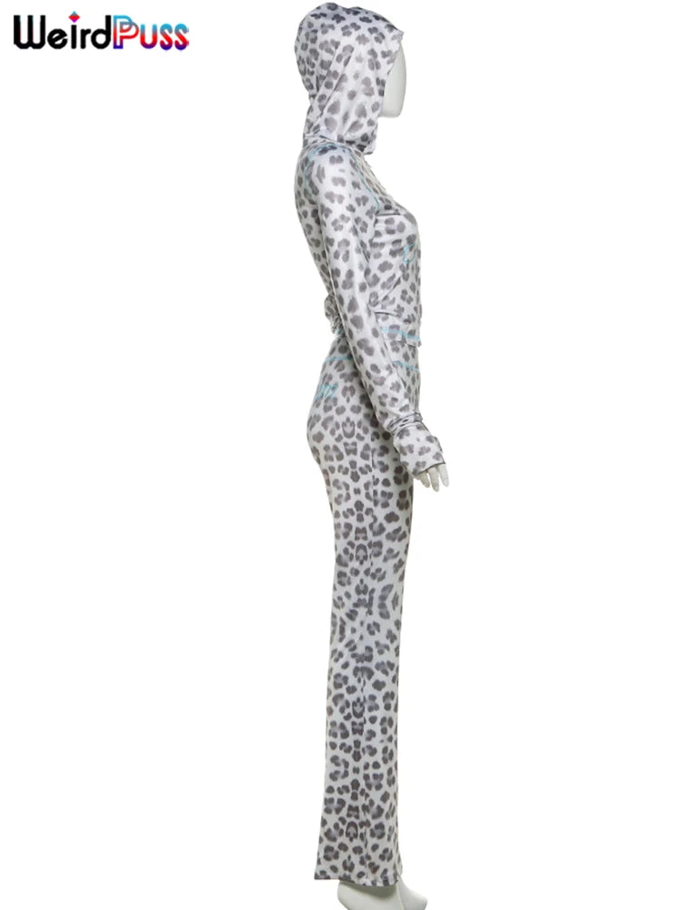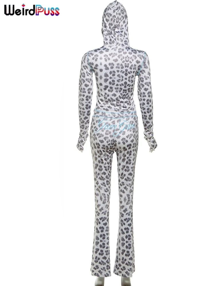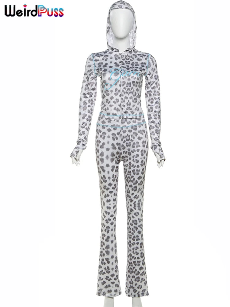 Weird Puss Leopard Contrast Letter Print 2 Piece Set Women Hooded Full Sleeve Crop Jacket+Skinny Stretch Flare Pants Trend Suits