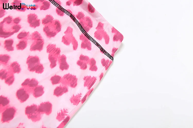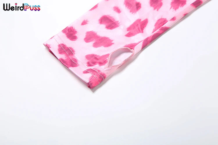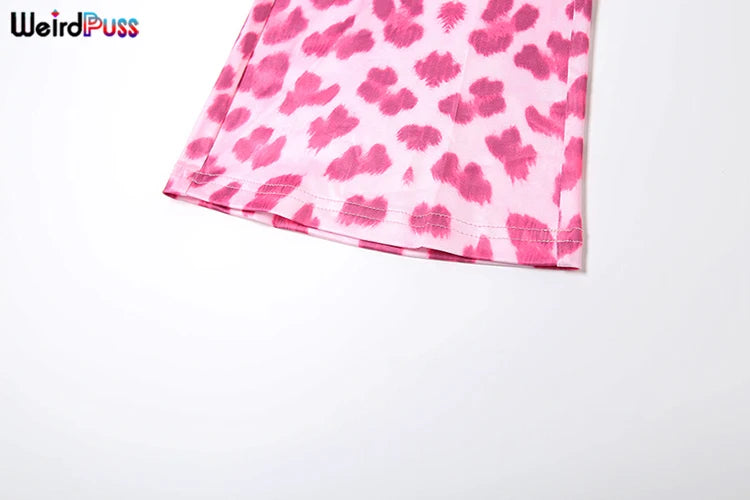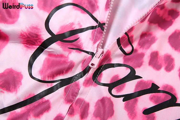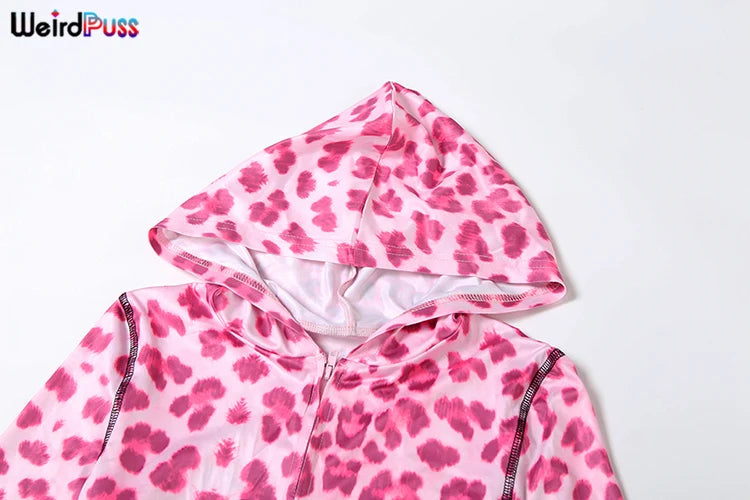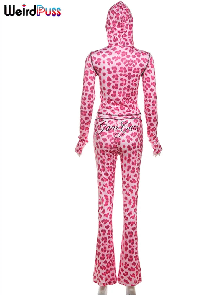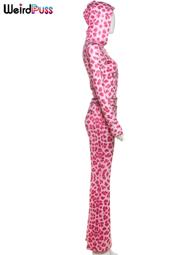 Weird Puss Leopard Contrast Letter Print 2 Piece Set Women Hooded Full Sleeve Crop Jacket+Skinny Stretch Flare Pants Trend Suits