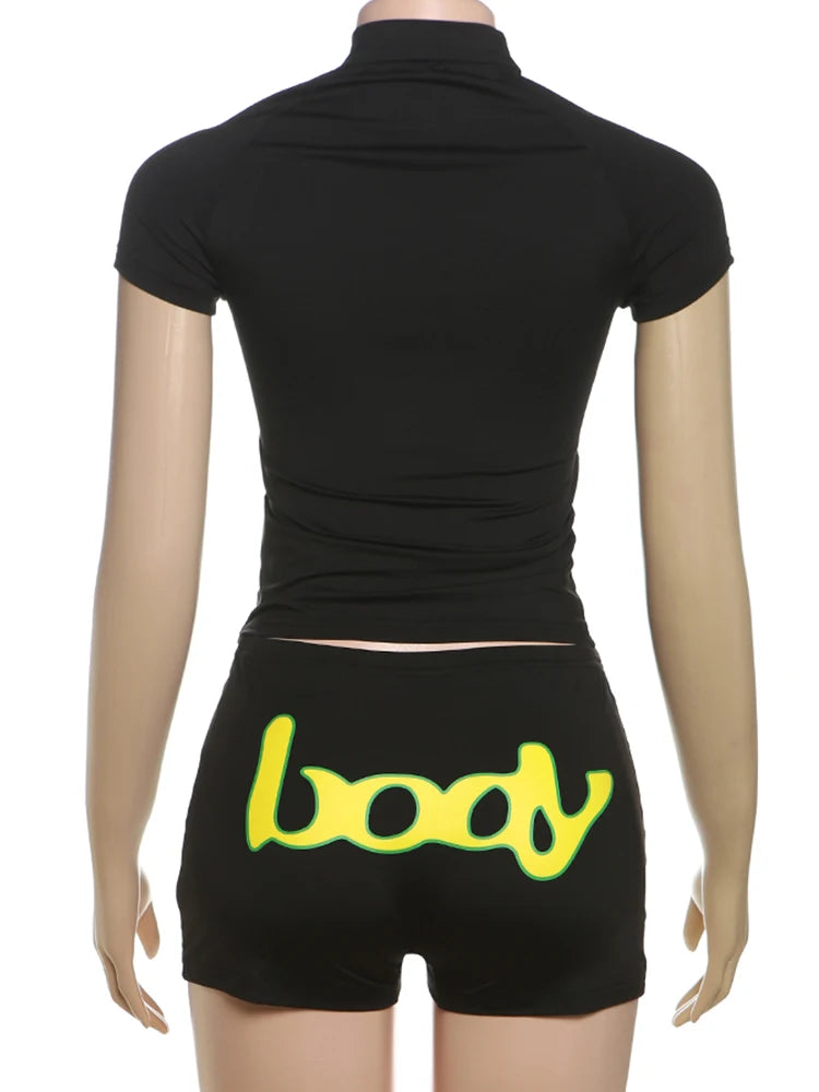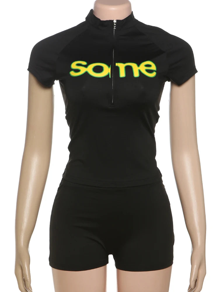 Weird Puss Letter Print Women2 Piece Set Casual Sporty Zip Crop Tops+Shorts Matching Streetwear Stretch Skinny Streetwear Suits