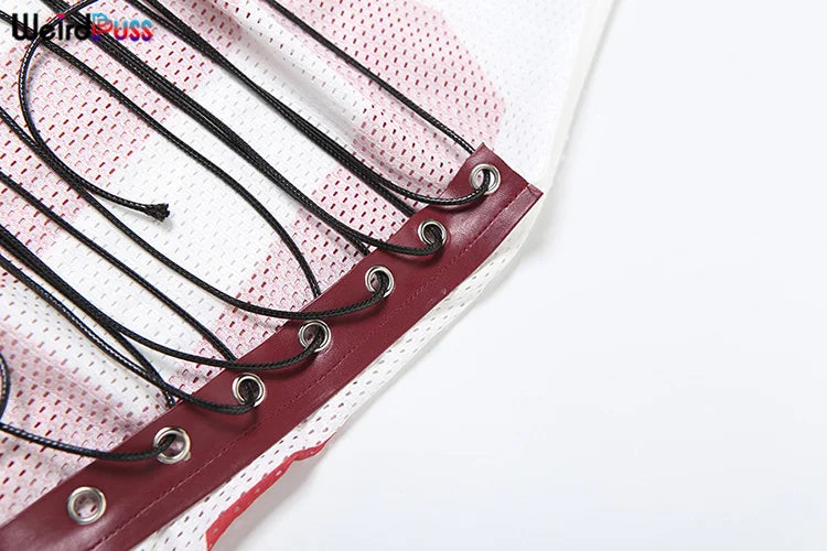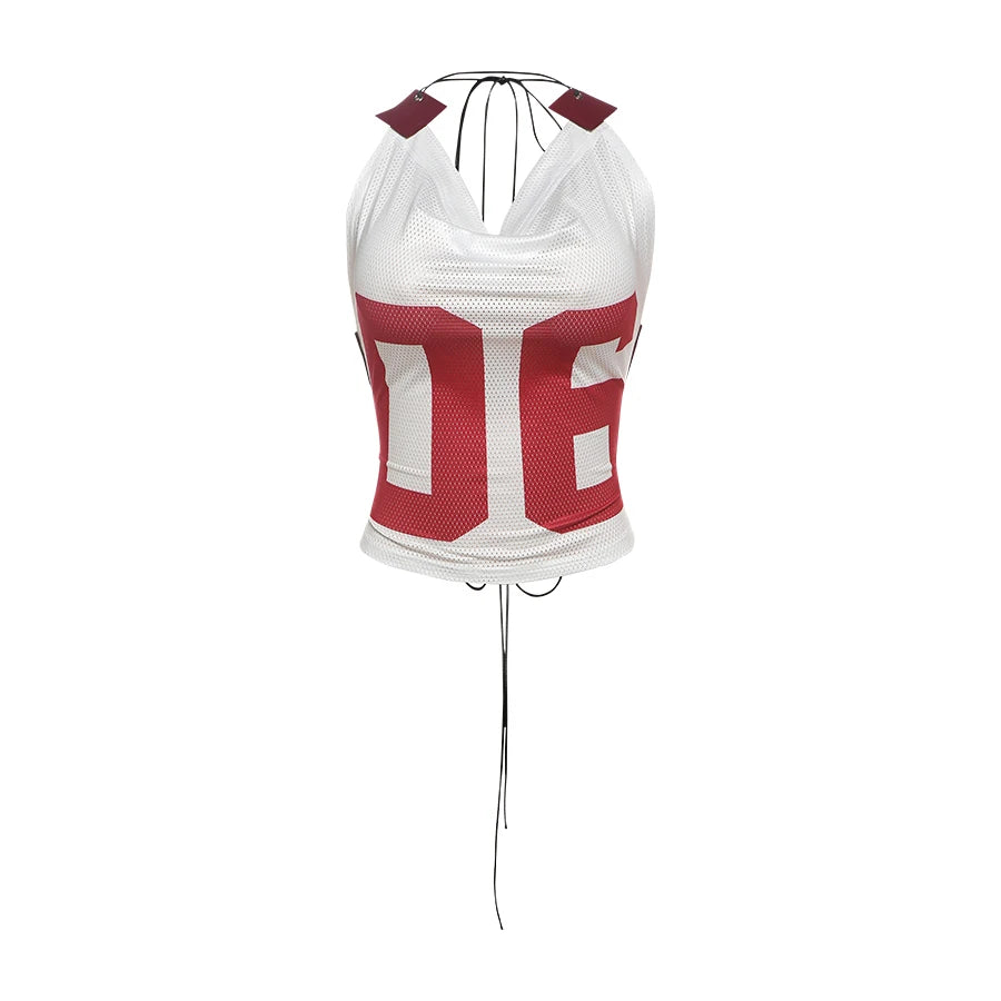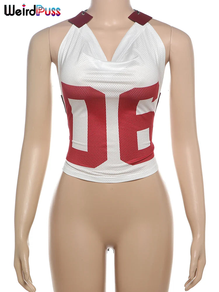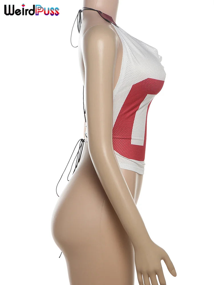 Weird Puss Mesh Halter Crop Tops Woman Summer Bandage Backless Patchwork Number Print Swing Collar Party Streetwear Skinny Vest