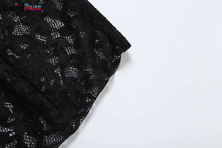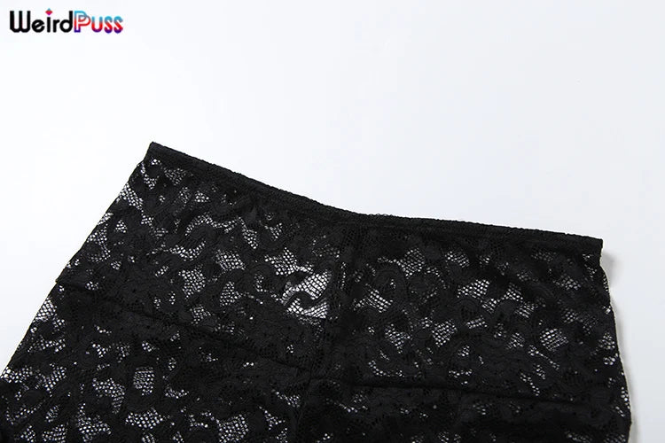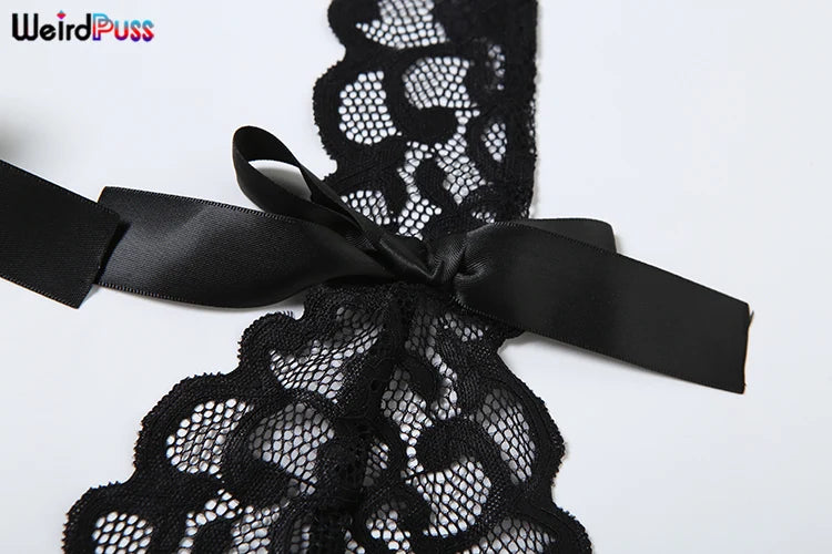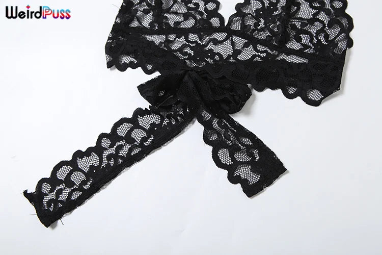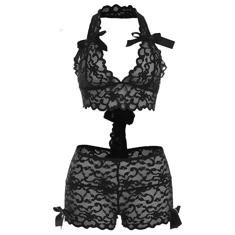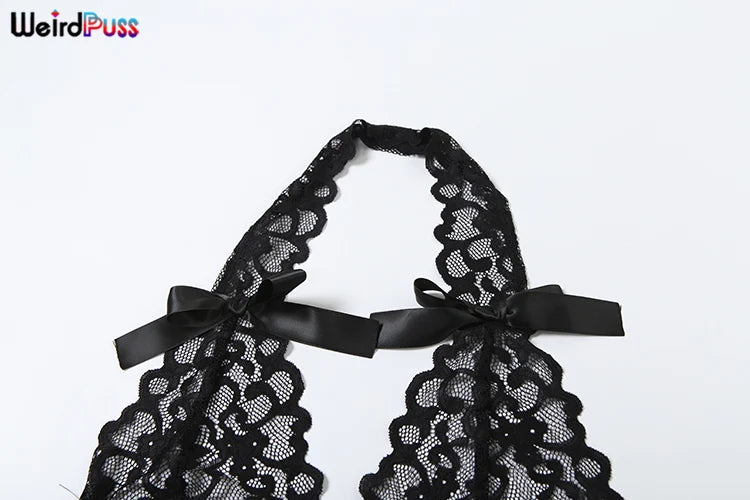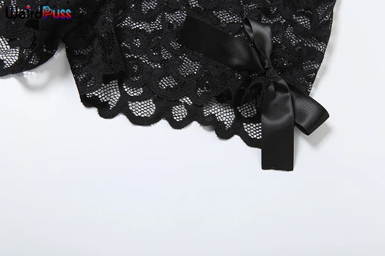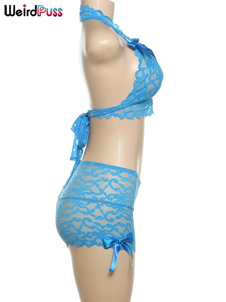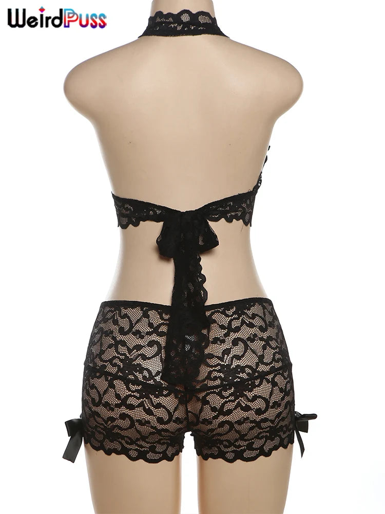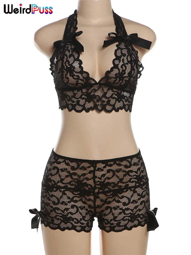 Weird Puss Mesh Sexy Bow 2 Piece Set Summer Women Halter Backless Lace Tank Tops+Shorts Matching Clubwear Coquette Hipster Suits