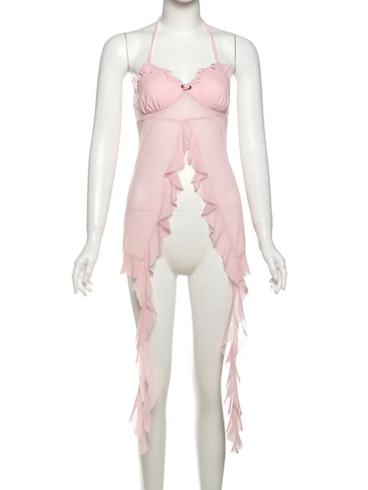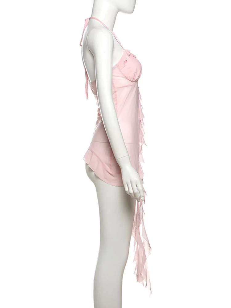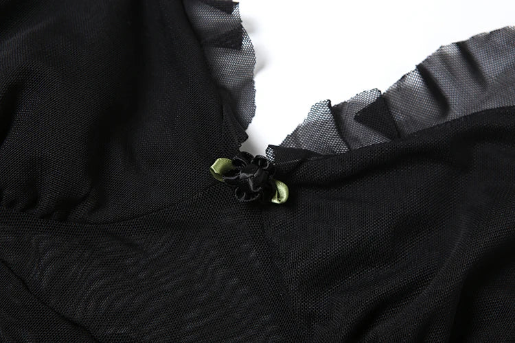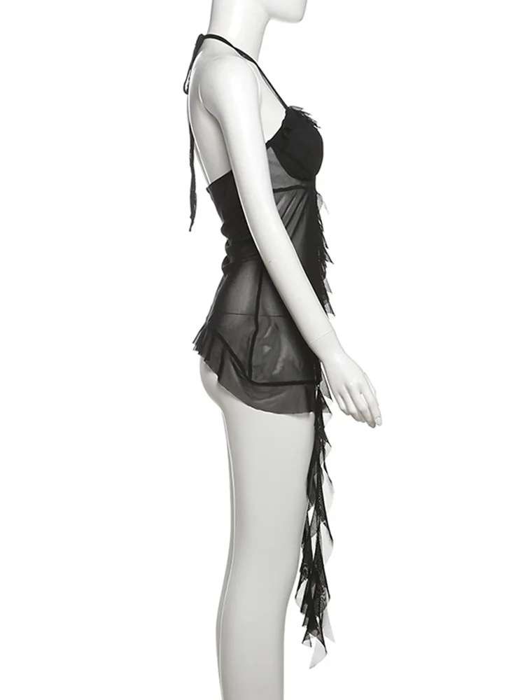 Weird Puss Patchwork Mesh Y2K Sexy Camisole Women Halter Bandage Low-Neck Tassel Ruffles 3d Flowers Midnight Club Sexy Tank Tops