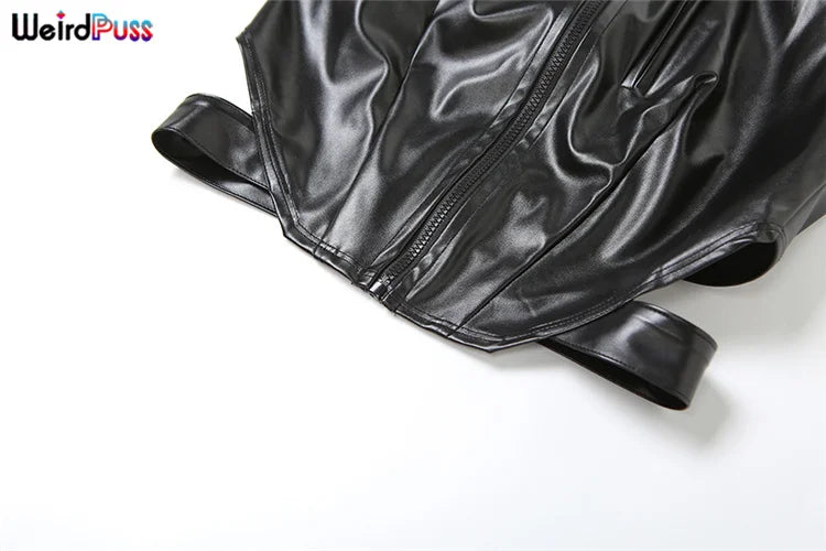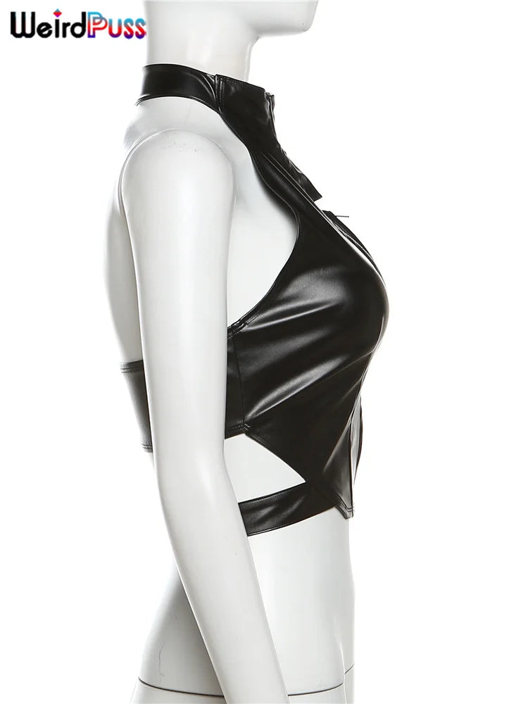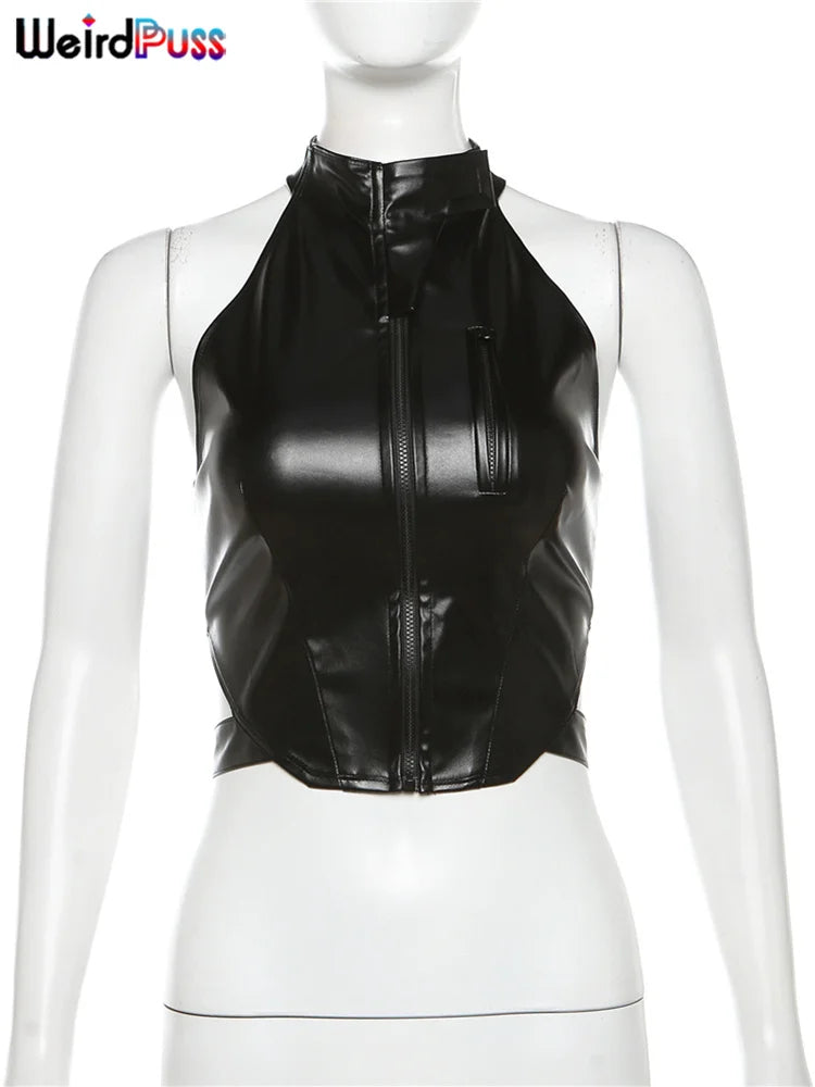 Weird Puss PU Backless Women Tank Tops Halter Neck Sleeveless Zipper Decoration Sexy Punk Nightclub Streetwear Summer Wild Vest