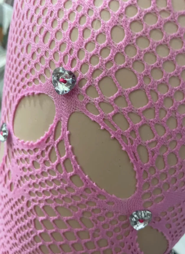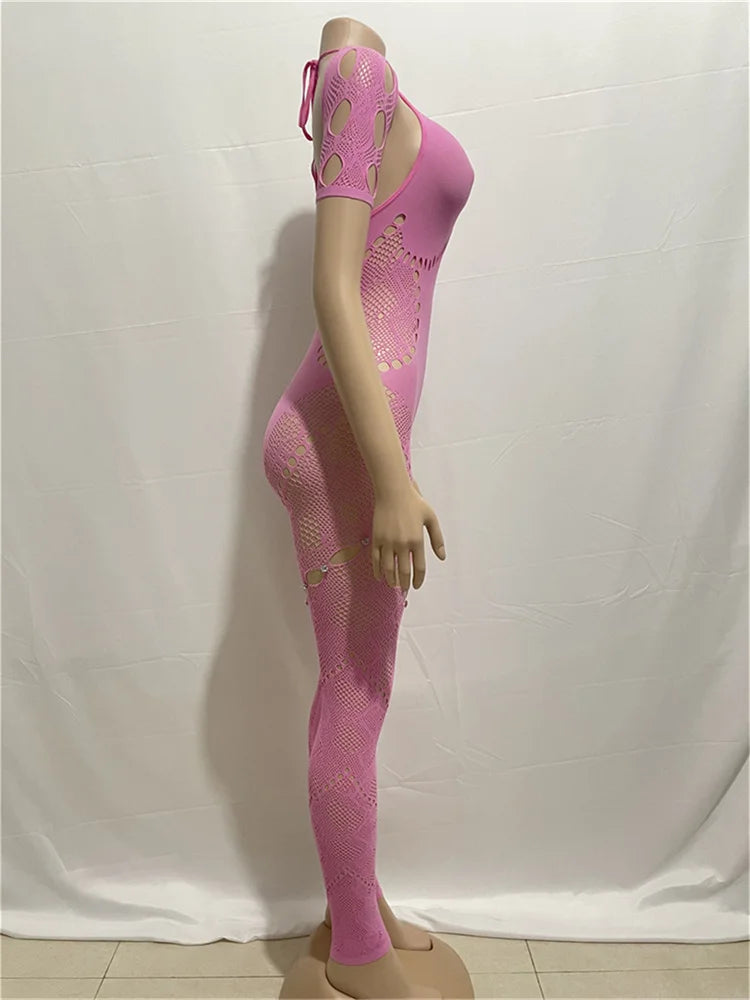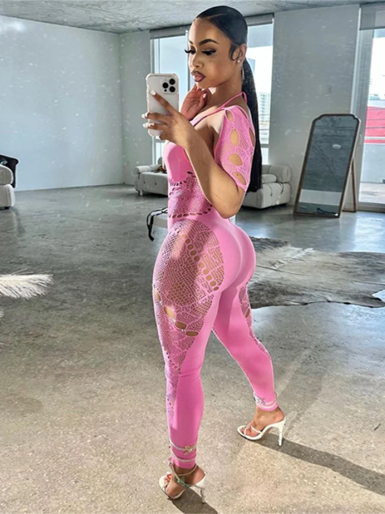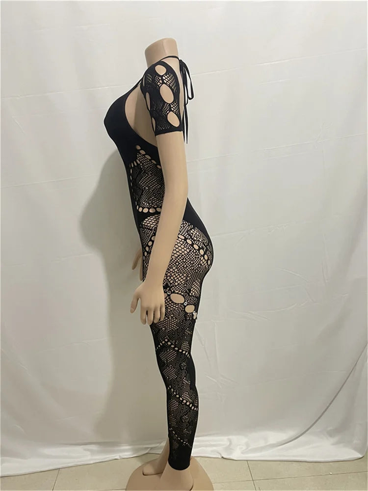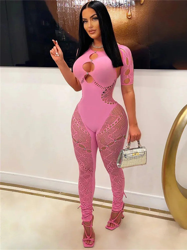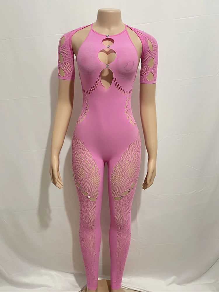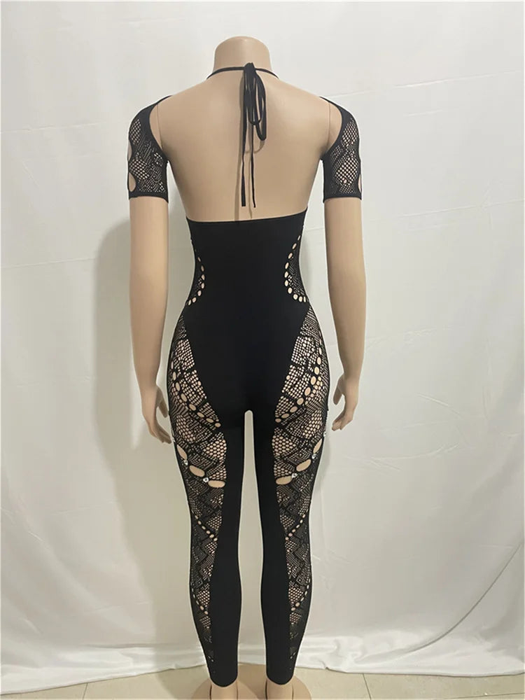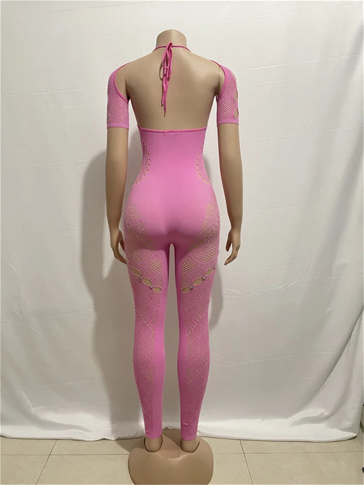 Weird Puss Rhinestone Embellished Women Jumpsuit Backless Halter Hollow Sheer Sexy Slim One Pieces Bodycon Hottie Party Clubwear