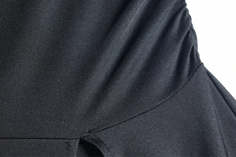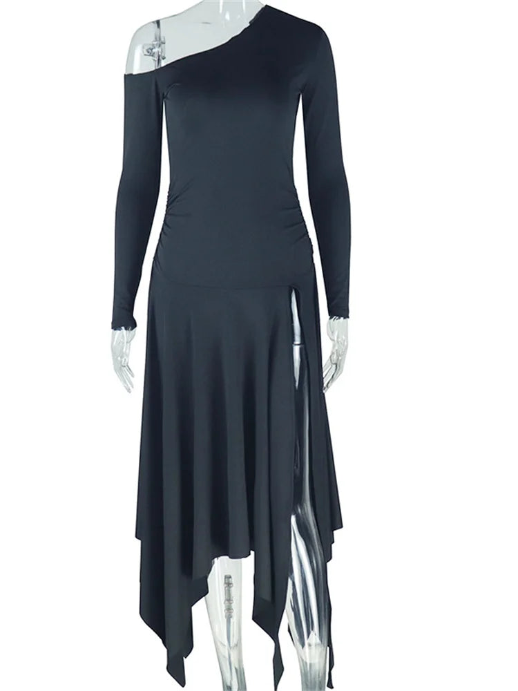 Weird Puss Ruched Asymmetry Dress Women Diagonal Collar Skinny Full Sleeve Ruffles Slits Hem Midnight Hottie Club Trend Outfits