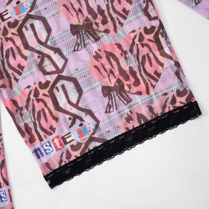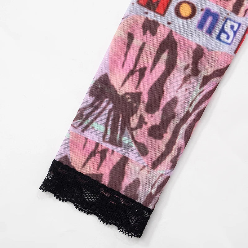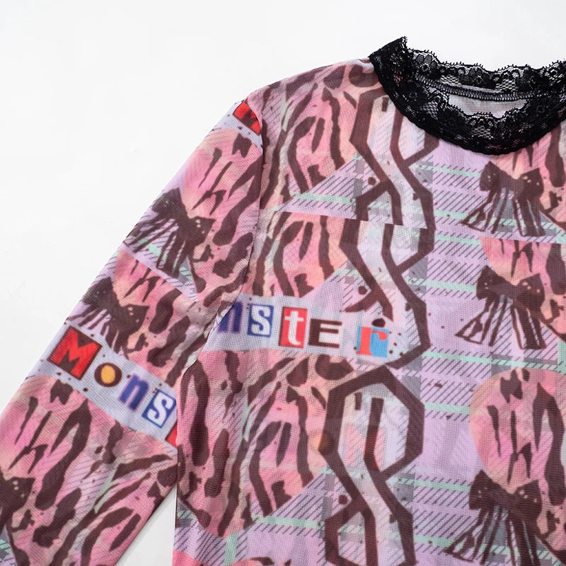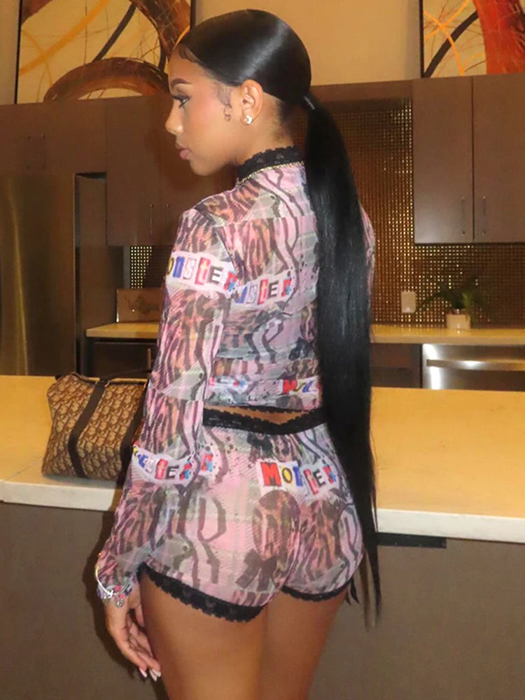 Weird Puss See Through Women 2 Piece Set Sexy Black-Edged Lace Sexy Full Sleeve Crop Tops+Shorts Matching Club Stretch Outfits