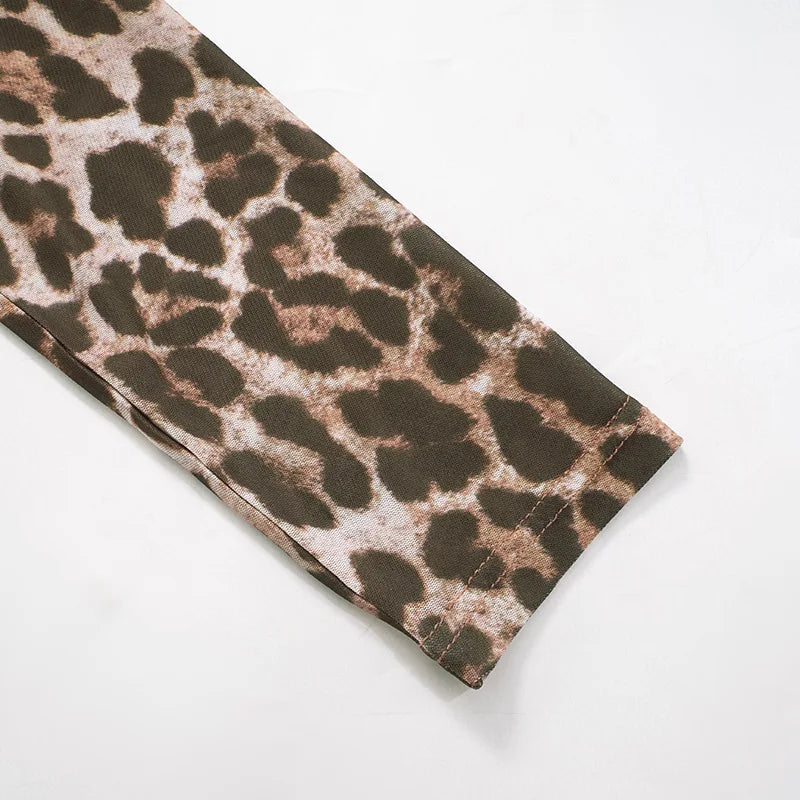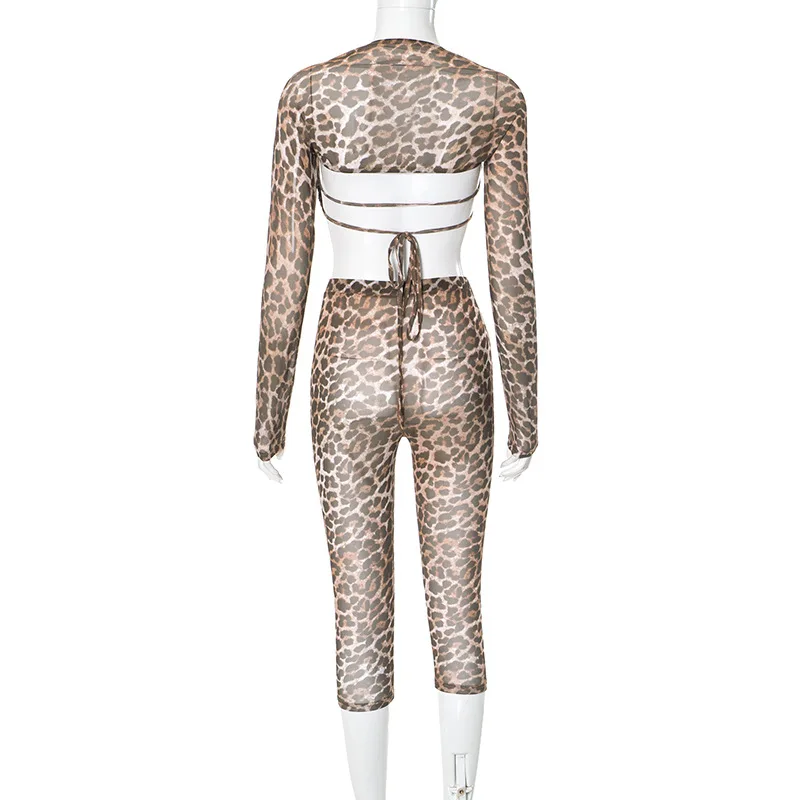 Weird Puss Sexy 3 Piece Set Women Leopard Print Mesh Full Sleeve Shawl+Bandage Metal Buckle Bra+Pants Street Trend Matching Suit