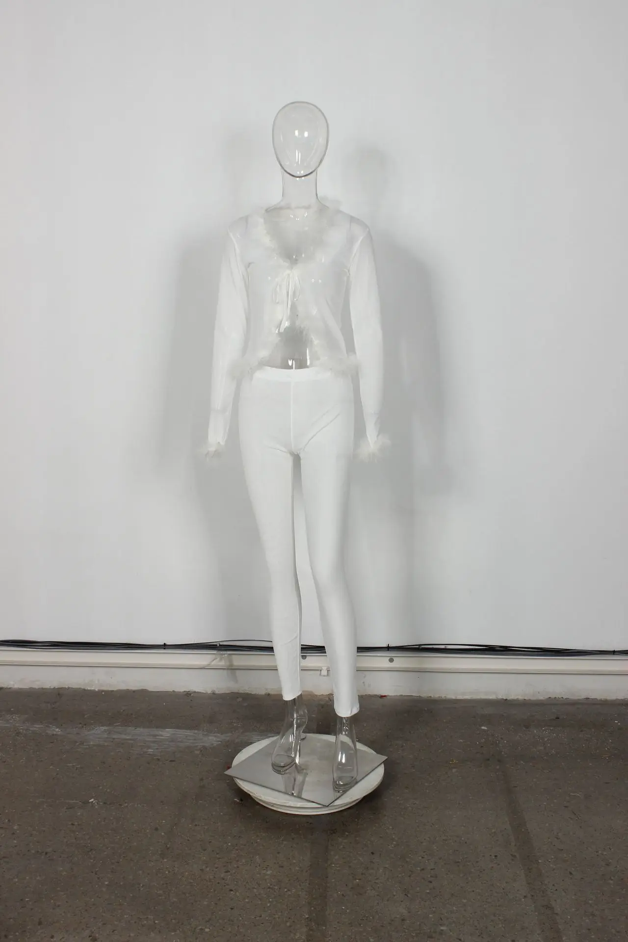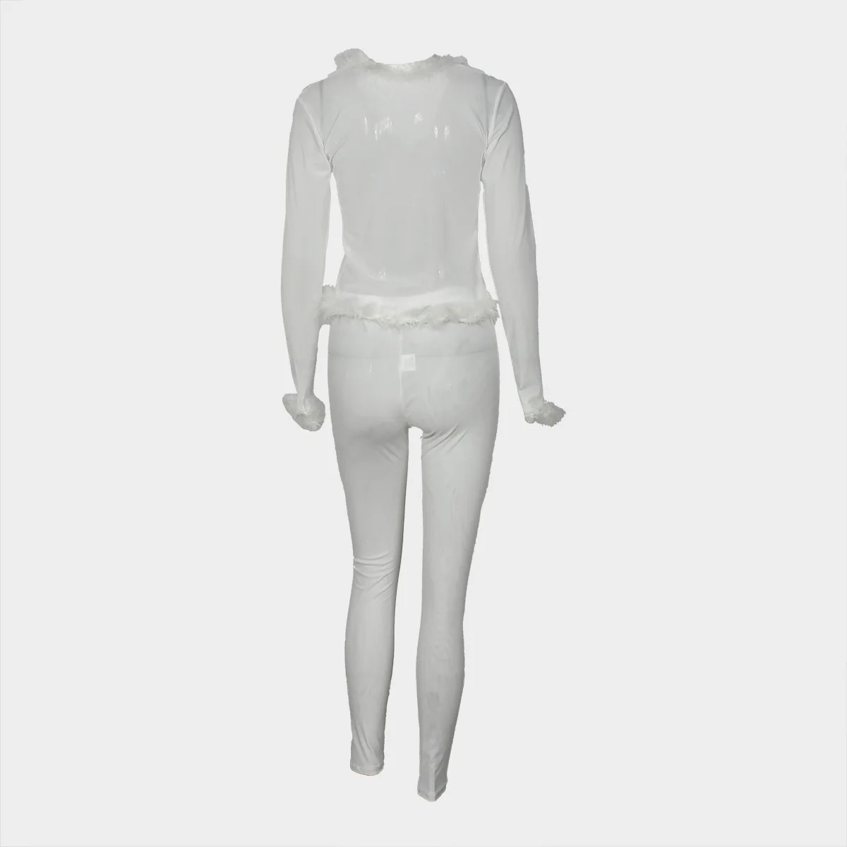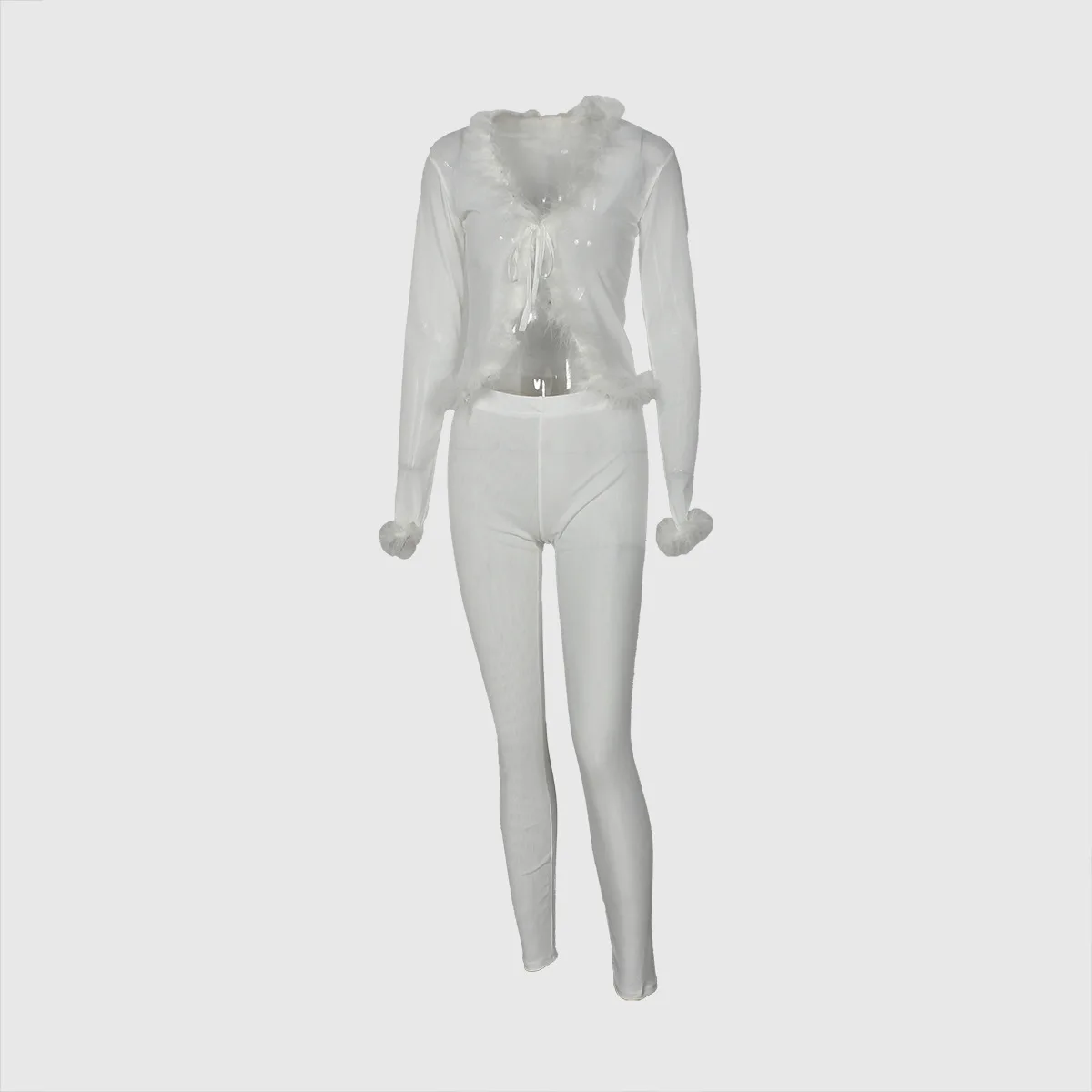 Weird Puss Sexy Fashion 2 Piece Set Women Fluff Patchwork Lace-Up Full Sleeve+Skinny Peach Hip Pants Club Coquett Trend Outfits
