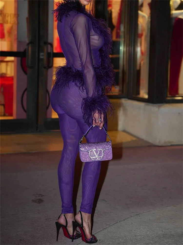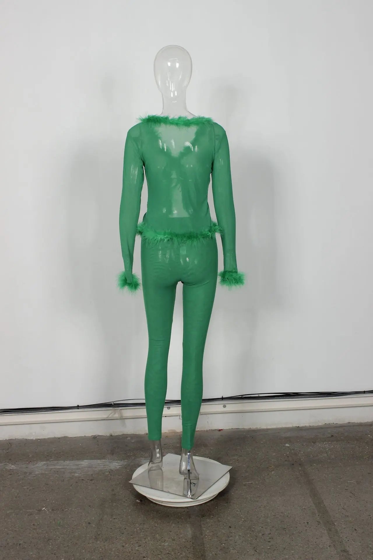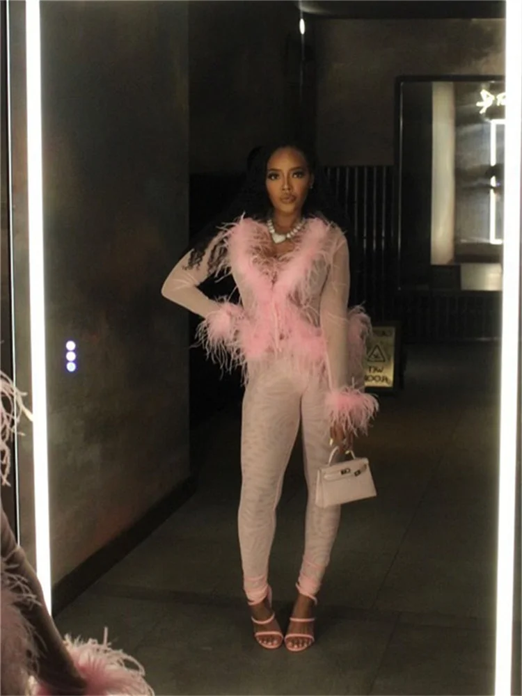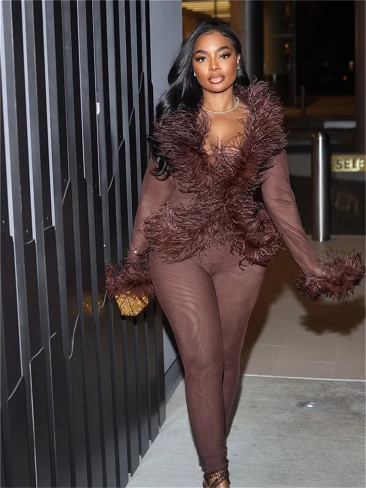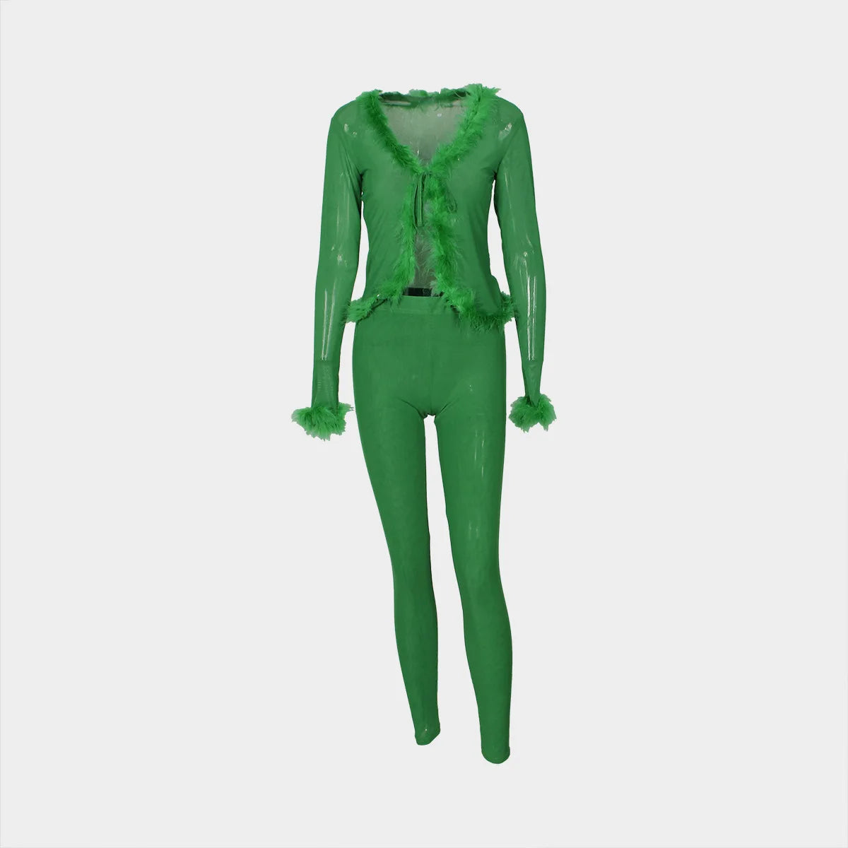 Weird Puss Sexy Fashion 2 Piece Set Women Fluff Patchwork Lace-Up Full Sleeve+Skinny Peach Hip Pants Club Coquett Trend Outfits