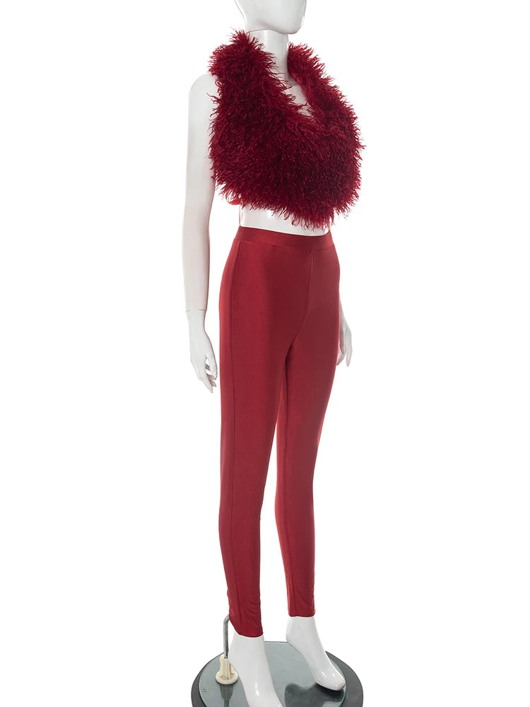 Weird Puss Sexy Fashion 2 Piece Set Women Plush Patchwork Halter Backless Camisole+Solid Skinny Pants Hottie Hipster Clubwear