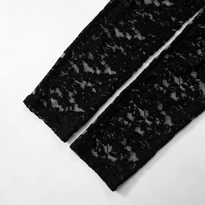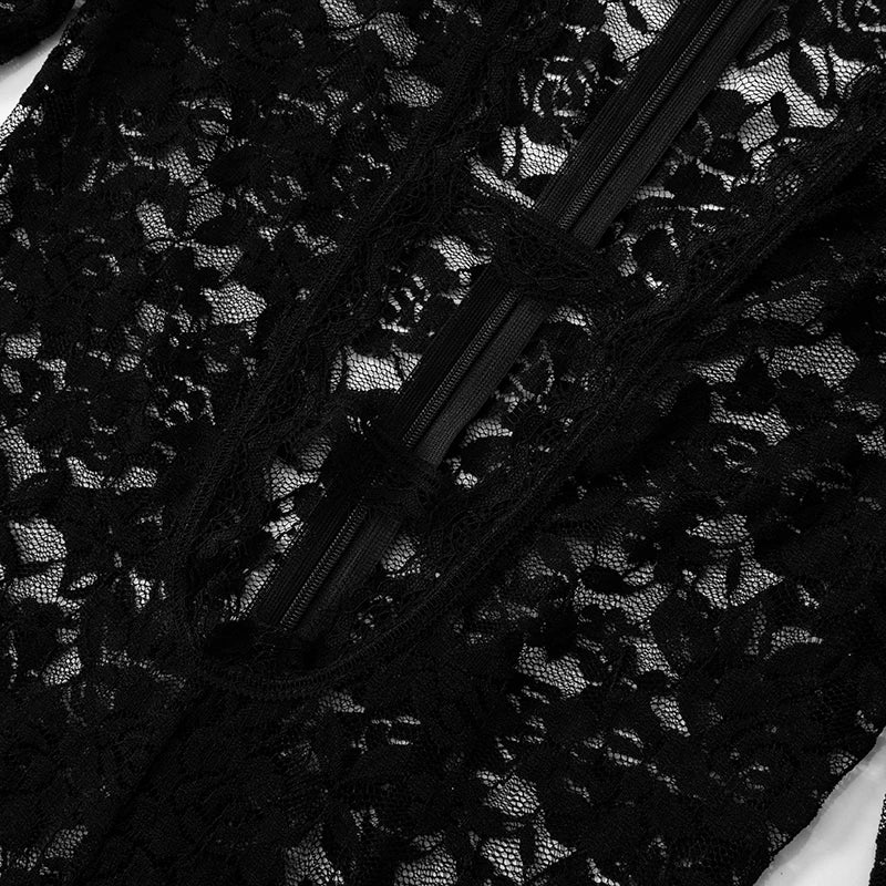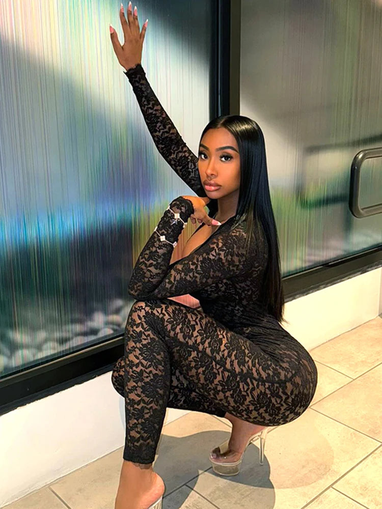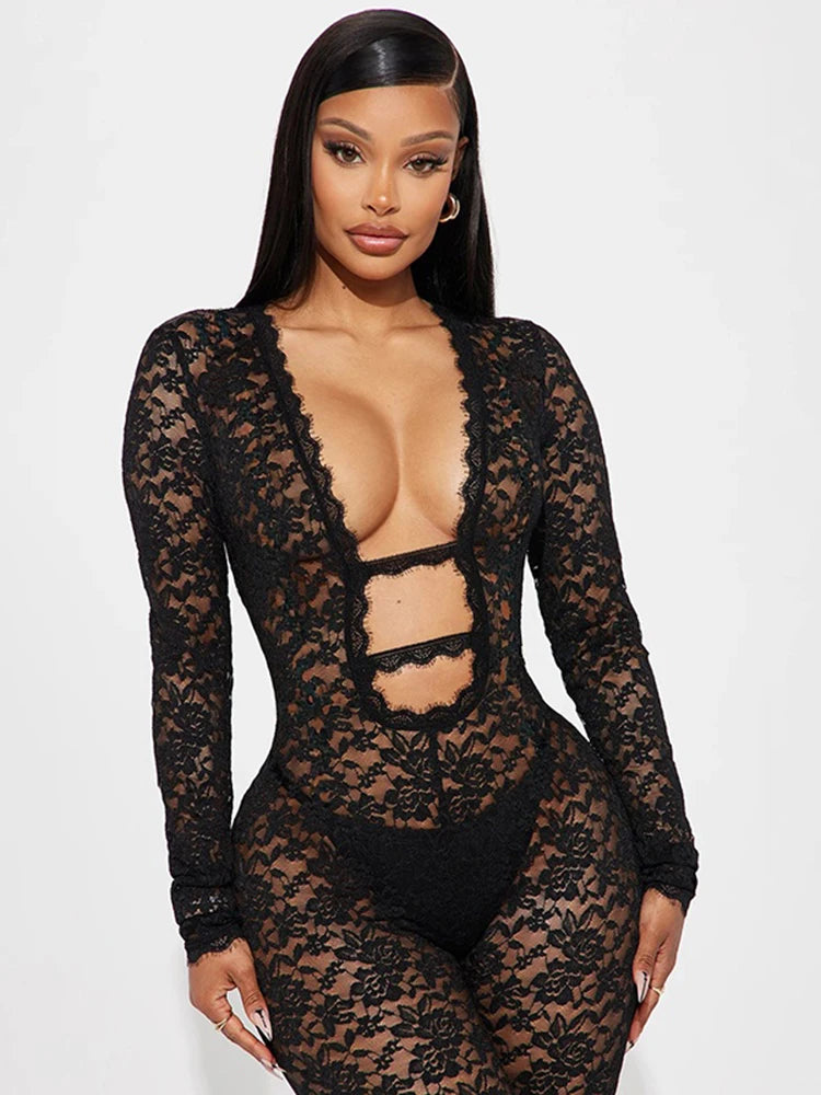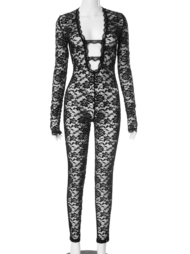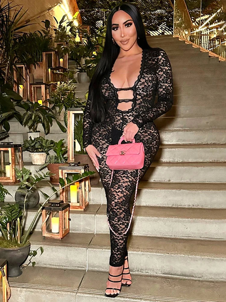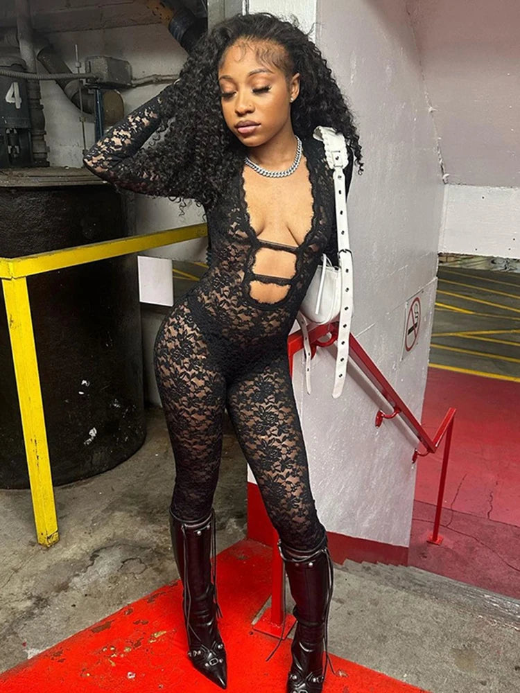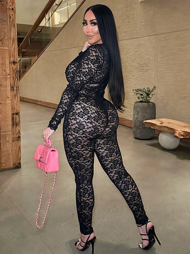 Weird Puss Sexy Jacquard Jumpsuit Women Sexy Mesh Patchwork Low-Neck Hollow Full Sleeve Skinny Midnight Party Clubwear Overalls