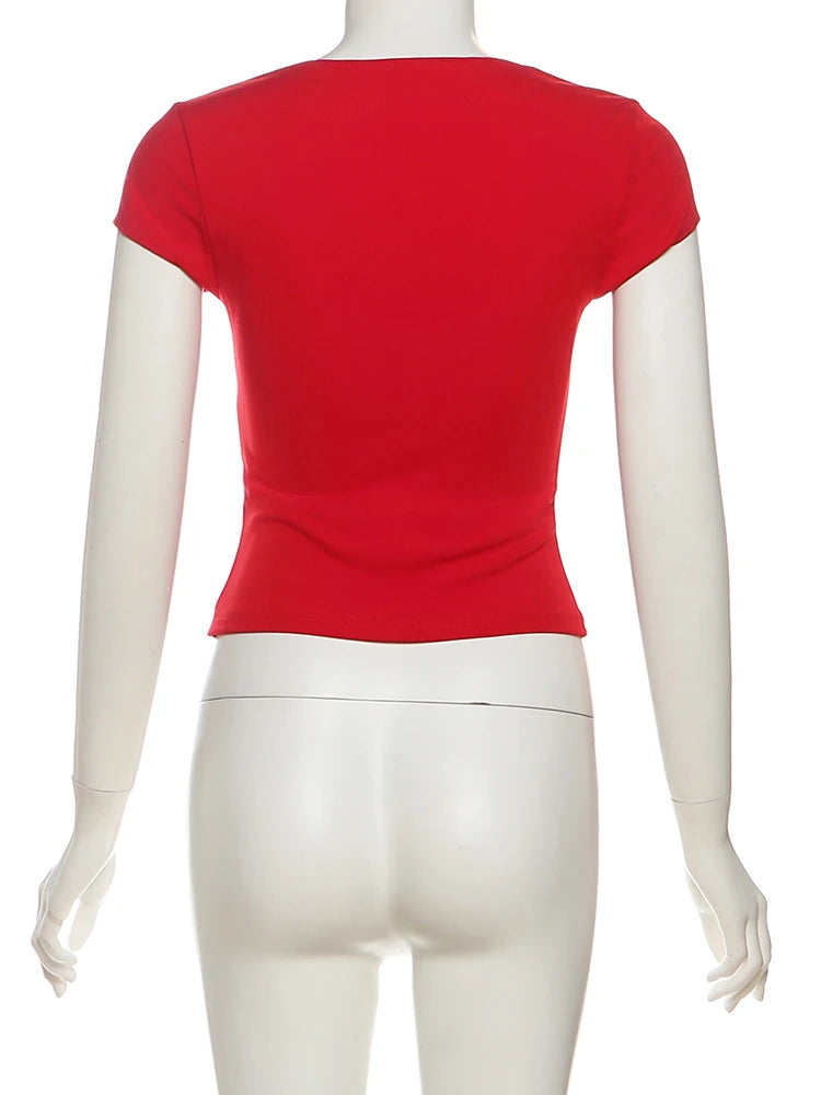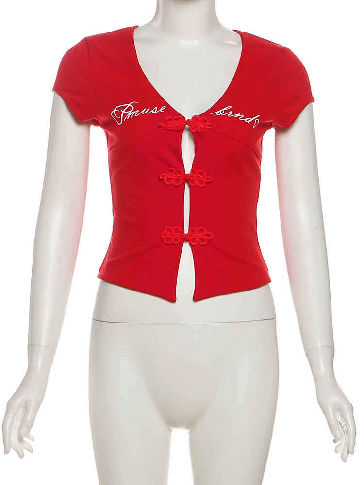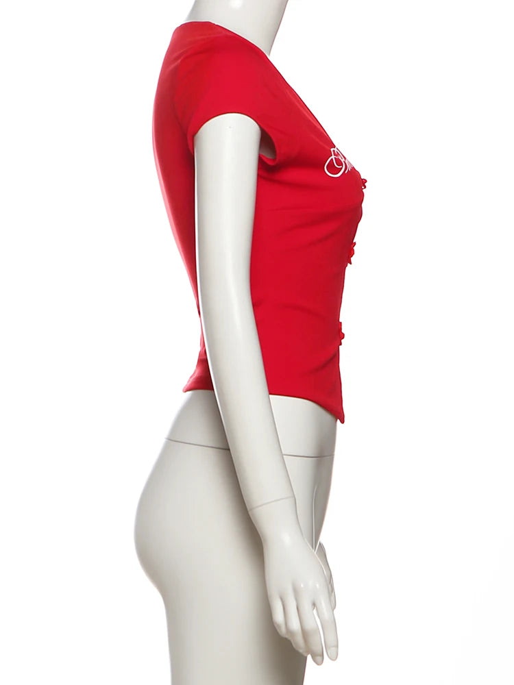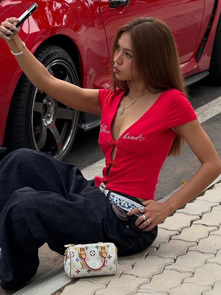Weird Puss Sexy Letter Print T-Shirt Women Hollow Cheongsam Button V Neck Midnight Hottie Versatile Street Skinny Crop Tops